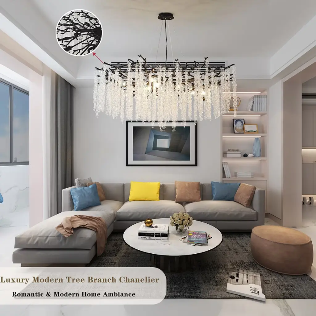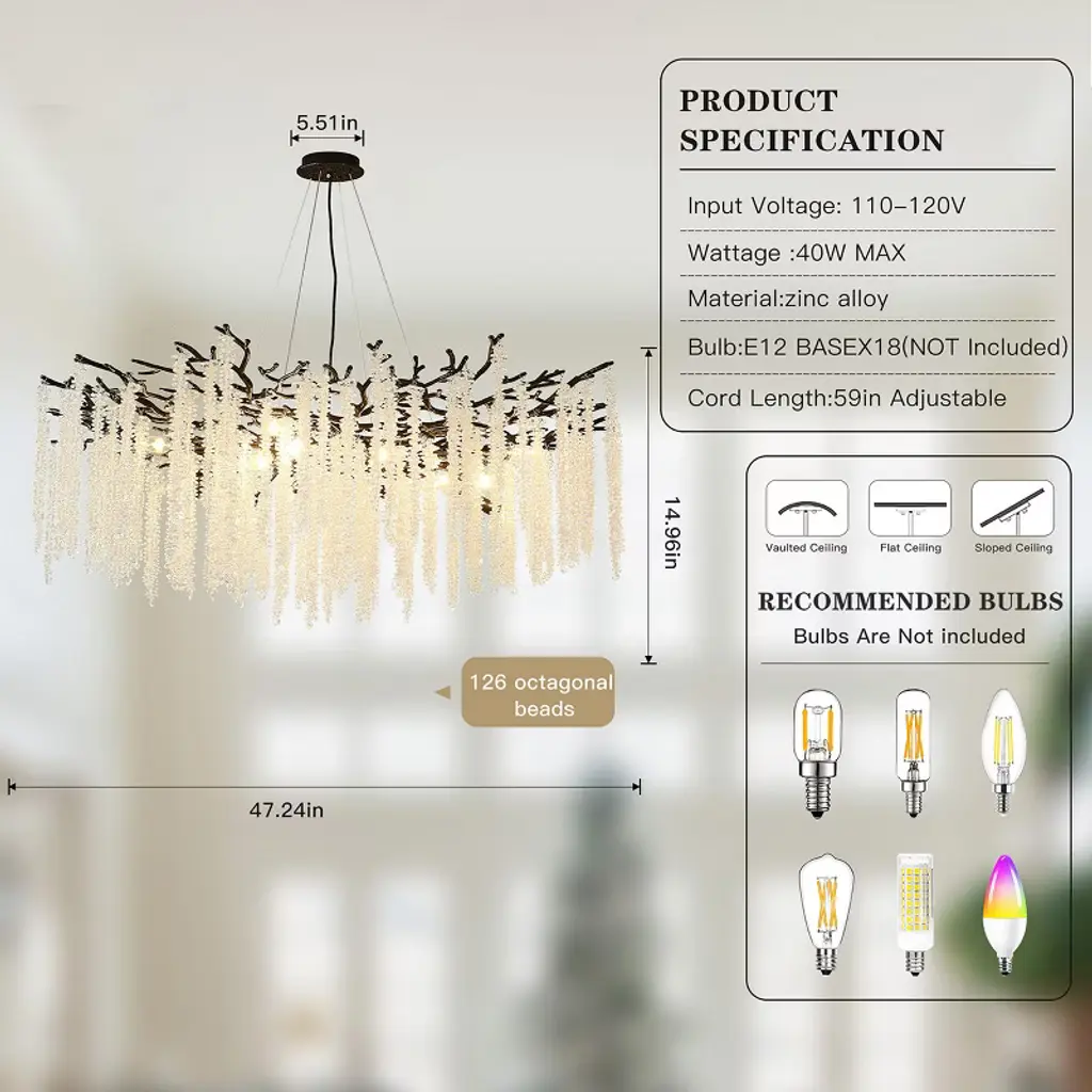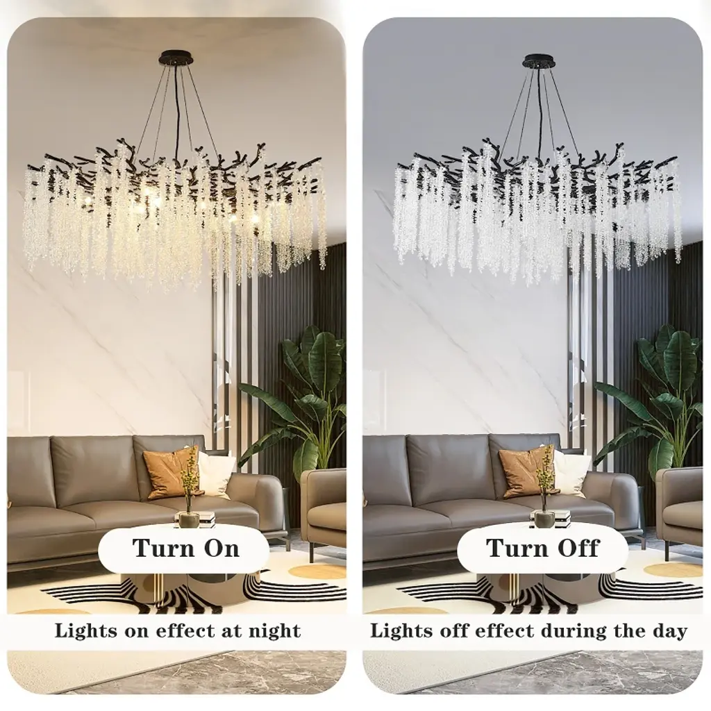 This tree branch chandelier shines luxuriously and exudes a pure, romantic aura, similar to a diamond, reflecting the beauty of art in the light. Sparkling crystal chandelier lighting with contemporary design, perfect for home decor, which will make your house look stunning Color: Black Material: Acrylic, Metal Size: 47.24 X 47.24 X 74 InVoltage: 110 VoltsBulb Base: 18*E12