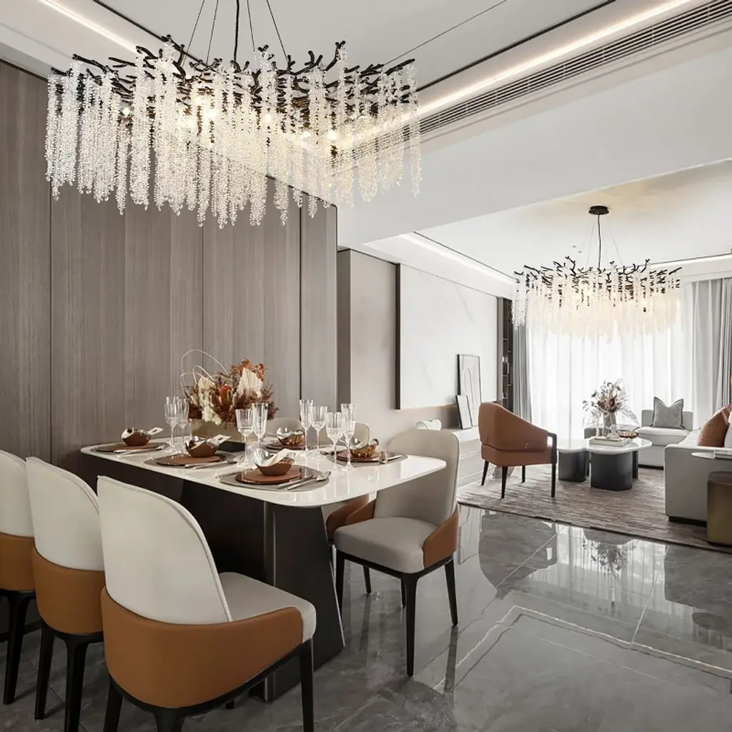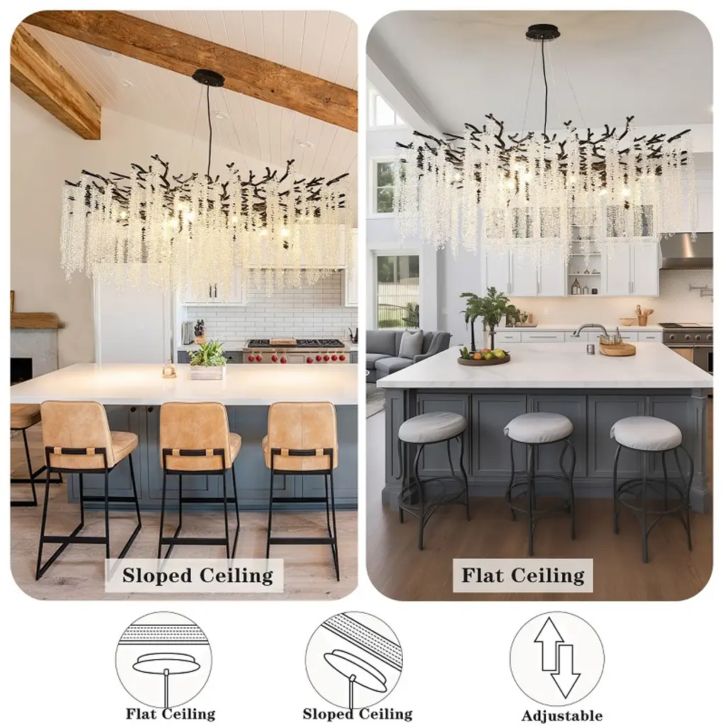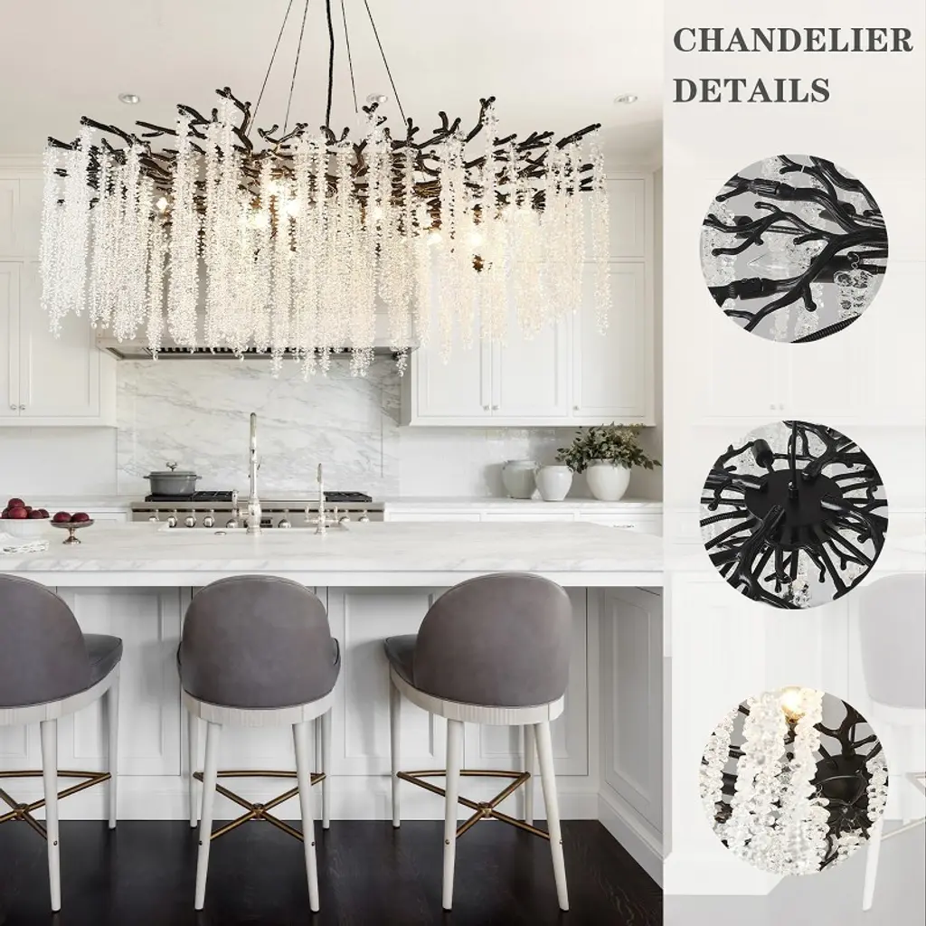 This tree branch chandelier shines luxuriously and exudes a pure, romantic aura, similar to a diamond, reflecting the beauty of art in the light. Sparkling crystal chandelier lighting with contemporary design, perfect for home decor, which will make your house look stunning Color: Black Material: Acrylic, Metal Size: 47.24 X 47.24 X 74 InVoltage: 110 VoltsBulb Base: 18*E12
