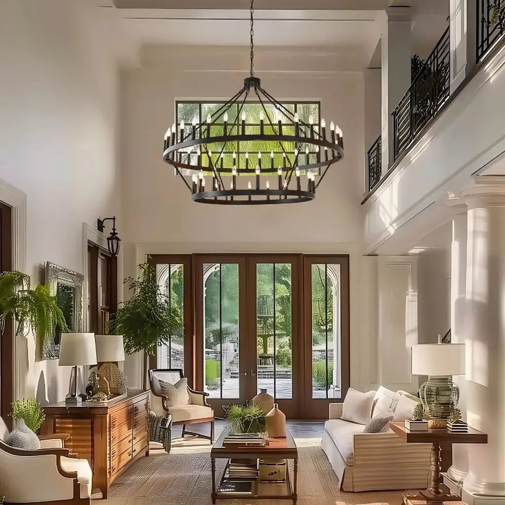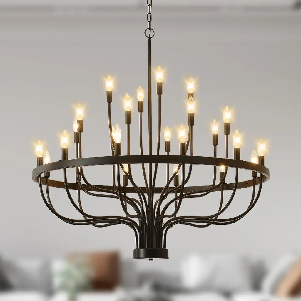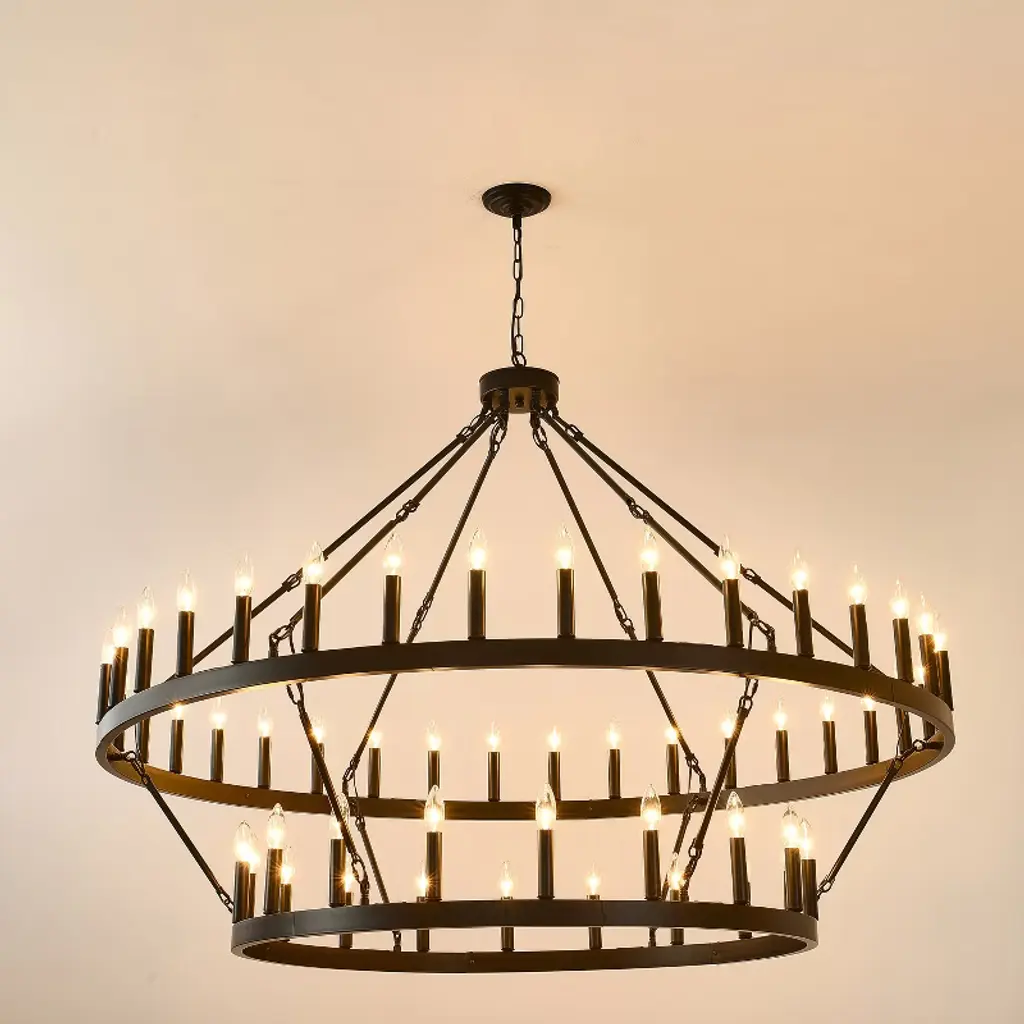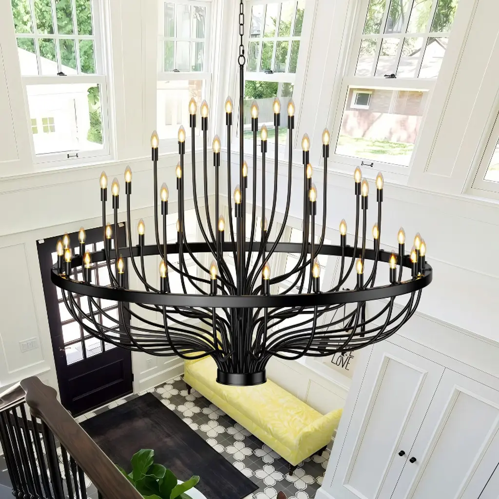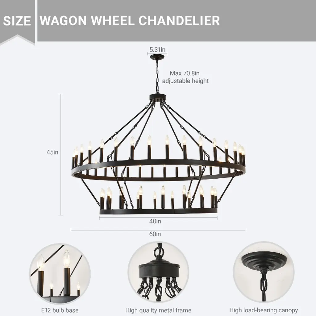 60" Black 2-Tier Wagon Wheel Chandelier – 54-Light Adjustable Farmhouse Fixture for High Ceilings & Grand SpacesMake a bold statement with this extra-large farmhouse chandelier, featuring dual-tier wagon wheel design and 54 lights for unparalleled 360° illumination. Crafted in matte black wrought iron, this rugged yet refined fixture adapts to high ceilings (up to 112"), dining rooms, foyers, or covered porches. With dimmable versatility and easy installation, it blends rustic charm with modern functionality.SpecificationsDimensions:60" Dia (Upper) / 40" Dia (Lower)Max Height:70.8" (adjustable)Canopy Size 5.31" Dia × 1" HBulb Requirements:54 × E12 (40W max)Materials:Wrought Iron (Matte Black)Voltage:110-120VPerfect For:Grand Entryways: Command attention in high-ceiling foyers (hang 7-8ft above floor).Large Dining Rooms: Center over 10-seat tables (30-36" above surface).Covered Outdoor Spaces: Add rustic drama to porches or pergolas.Commercial Spaces: Elevate hotel lobbies or restaurant dining areas.Design Pairings:Farmhouse: Pair with reclaimed wood tables + wrought iron accents.Industrial: Contrast exposed brick walls + concrete floors.Modern Rustic: Combine with leather sofas + minimalist decor.Safety & Pro TipsProfessional installation recommended due to size/weight.ALWAYS cut power at breaker before installation/maintenance.Outdoor use limited to dry, covered areas (not rated for rain/snow).Optimization:Bulbs: Warm white LEDs (2700K) enhance rustic ambiance; daylight bulbs (4000K) for task areas.Height: Lower tiers 48" above tables for intimate dinners; raise for ambient lighting.Maintenance: Dust monthly with microfiber cloth.What’s IncludedChandelier frame (2-tier)70.8" adjustable chain + canopyMounting hardwareStep-by-step installation manualWhy This Chandelier?This isn’t just lighting—it’s a conversation starter. The 54 bulbs cast a warm, welcoming glow across our 20-ft entryway, and the adjustable chain made installation over our sloped ceiling effortless. Perfect for our mountain lodge!