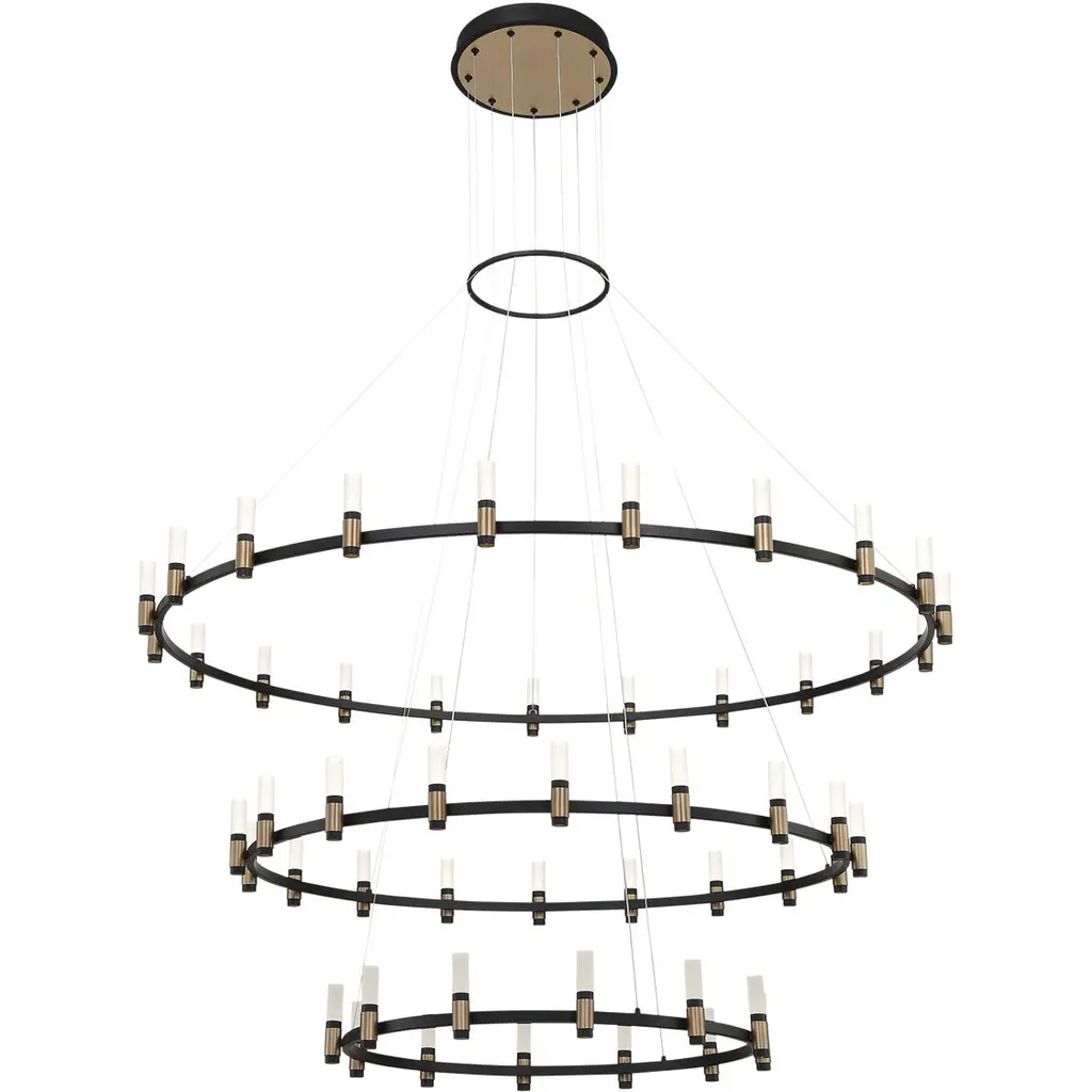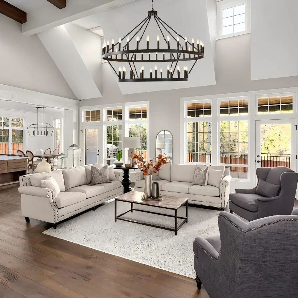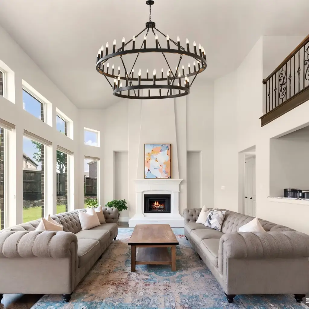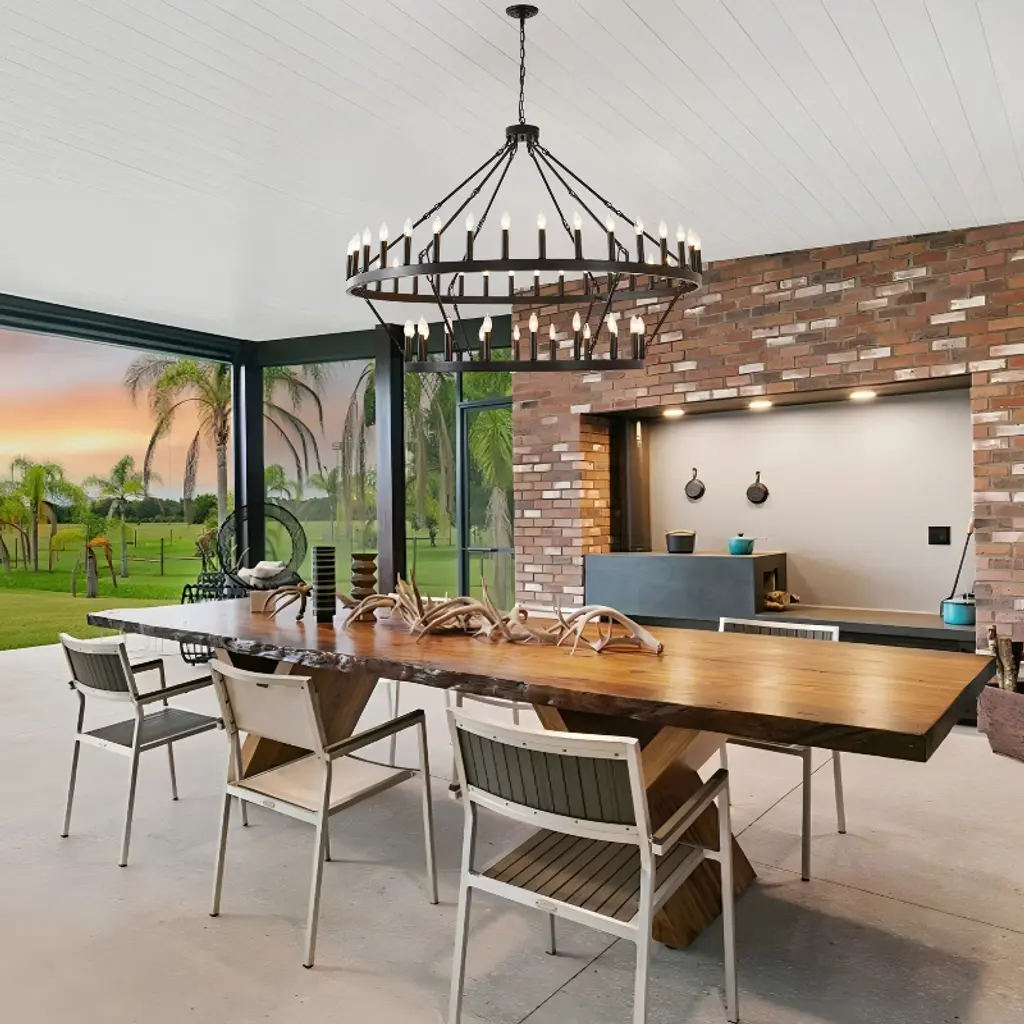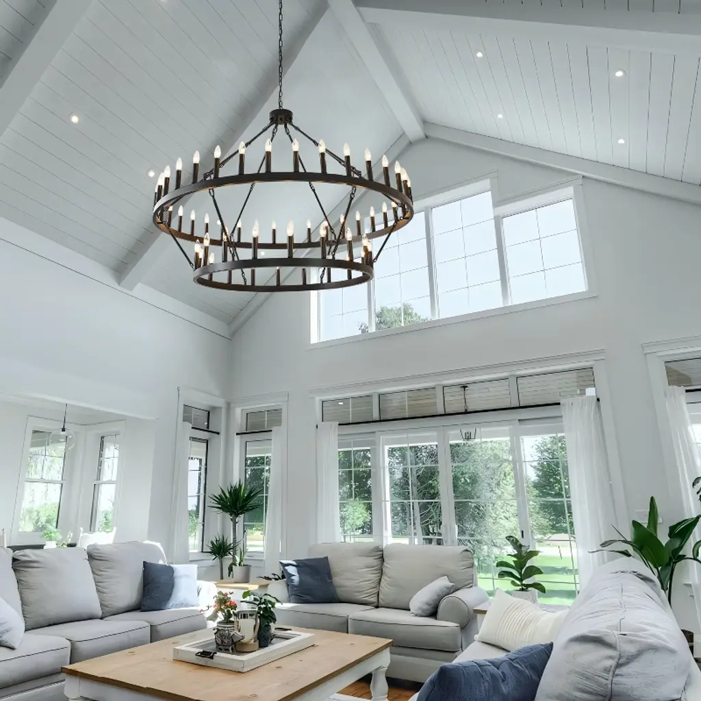 60" Black 2-Tier Wagon Wheel Chandelier – 54-Light Adjustable Farmhouse Fixture for High Ceilings & Grand SpacesMake a bold statement with this extra-large farmhouse chandelier, featuring dual-tier wagon wheel design and 54 lights for unparalleled 360° illumination. Crafted in matte black wrought iron, this rugged yet refined fixture adapts to high ceilings (up to 112"), dining rooms, foyers, or covered porches. With dimmable versatility and easy installation, it blends rustic charm with modern functionality.SpecificationsDimensions:60" Dia (Upper) / 40" Dia (Lower)Max Height:70.8" (adjustable)Canopy Size 5.31" Dia × 1" HBulb Requirements:54 × E12 (40W max)Materials:Wrought Iron (Matte Black)Voltage:110-120VPerfect For:Grand Entryways: Command attention in high-ceiling foyers (hang 7-8ft above floor).Large Dining Rooms: Center over 10-seat tables (30-36" above surface).Covered Outdoor Spaces: Add rustic drama to porches or pergolas.Commercial Spaces: Elevate hotel lobbies or restaurant dining areas.Design Pairings:Farmhouse: Pair with reclaimed wood tables + wrought iron accents.Industrial: Contrast exposed brick walls + concrete floors.Modern Rustic: Combine with leather sofas + minimalist decor.Safety & Pro TipsProfessional installation recommended due to size/weight.ALWAYS cut power at breaker before installation/maintenance.Outdoor use limited to dry, covered areas (not rated for rain/snow).Optimization:Bulbs: Warm white LEDs (2700K) enhance rustic ambiance; daylight bulbs (4000K) for task areas.Height: Lower tiers 48" above tables for intimate dinners; raise for ambient lighting.Maintenance: Dust monthly with microfiber cloth.What’s IncludedChandelier frame (2-tier)70.8" adjustable chain + canopyMounting hardwareStep-by-step installation manualWhy This Chandelier?This isn’t just lighting—it’s a conversation starter. The 54 bulbs cast a warm, welcoming glow across our 20-ft entryway, and the adjustable chain made installation over our sloped ceiling effortless. Perfect for our mountain lodge!