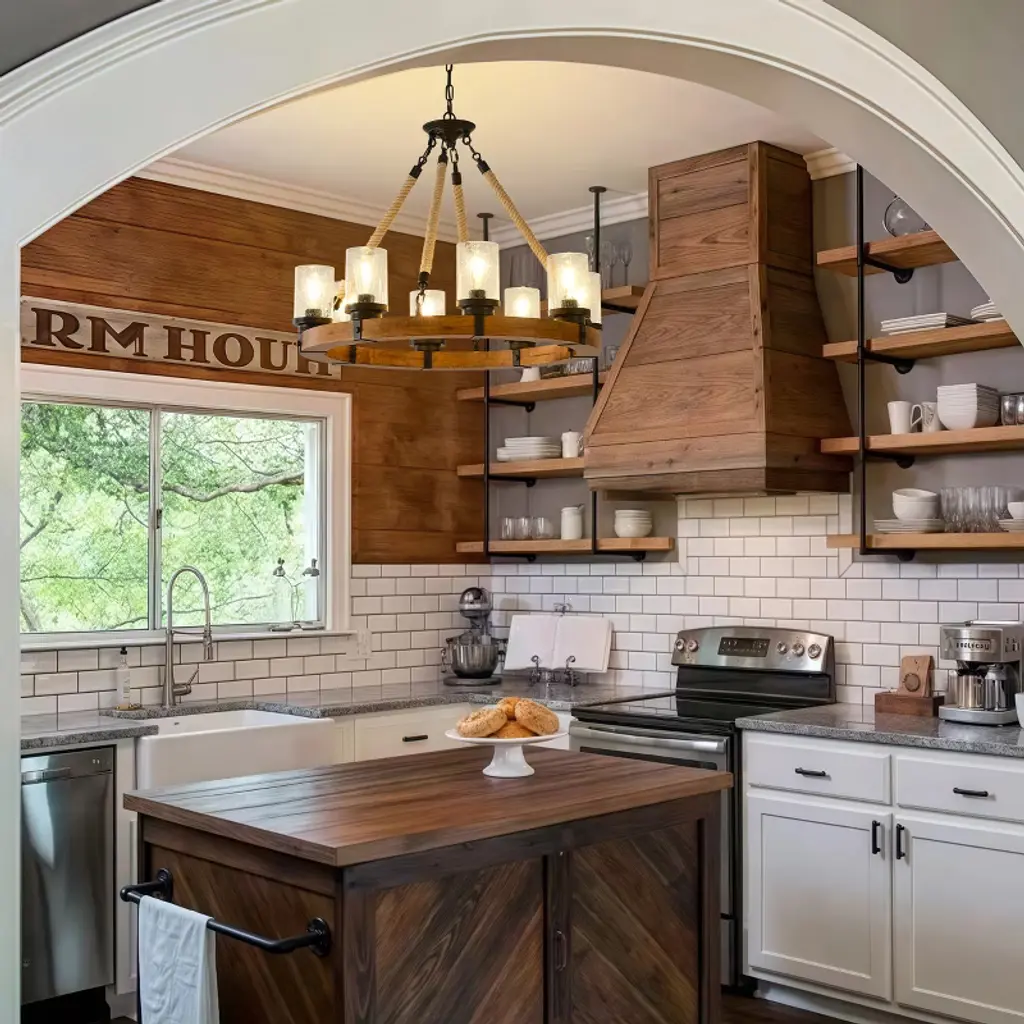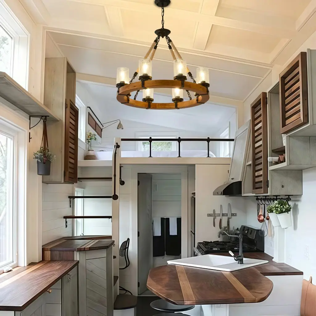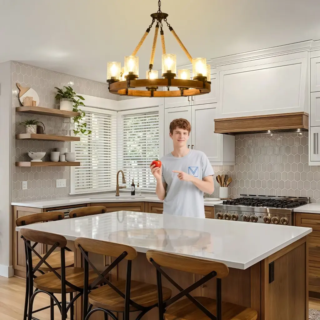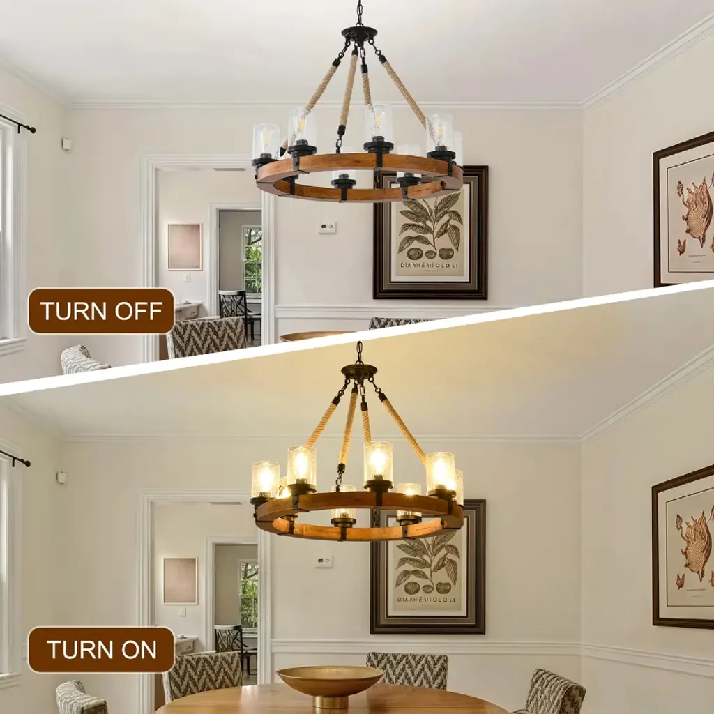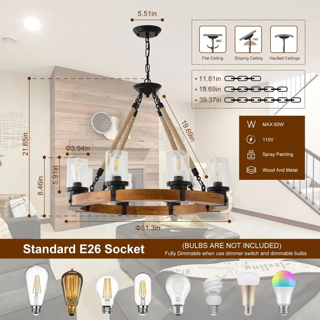 Handcrafted Wood Wagon Wheel Chandelier with Natural ElementsDangling gracefully from the wooden frame are handblown seeded glass lampshade, designed to create a mesmerizing, dreamlike glow. The rugged yet refined ropes ensure durability while complementing the wooden wheel’s rustic aesthetic. Each twist and knot is carefully crafted by skilled artisans, ensuring a unique.Designed to evoke the serenity of the outdoors, this stunning rustic farmhouse chandelier is perfect for adding warmth and character to living rooms, dining areas, or cozy cabin retreats.More than just a light fixture, this rustic wagon wheel chandelier is a statement of artistry and a celebration of nature’s simplicity. Its warm glow, tactile textures, and whimsical light effects will captivate and inspire, turning everyday moments into enchanting experiences.Specification:Material: Metal, Glass and WoodSize: 79.5x79.5x55cm, 31.3x31.3x21.65inwith 180cm, 70.87in adjustable chain.Rated Voltage: 110VBulb Base: 8 x E26 (not included)Max Power: 60WLamp Type: Energy-saving Lamps, LED, Incandescent and Fluorescent (not included)Can be used for pitched, vaulted ceilingsPacking List:Farmhouse Wagon Wheel Chandelier x1Ceiling Plate x1Hanging Plate x1Hanging Chain x1Seeded Glass Lampshade x8Hemp Rope Hanger x4