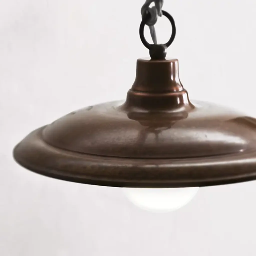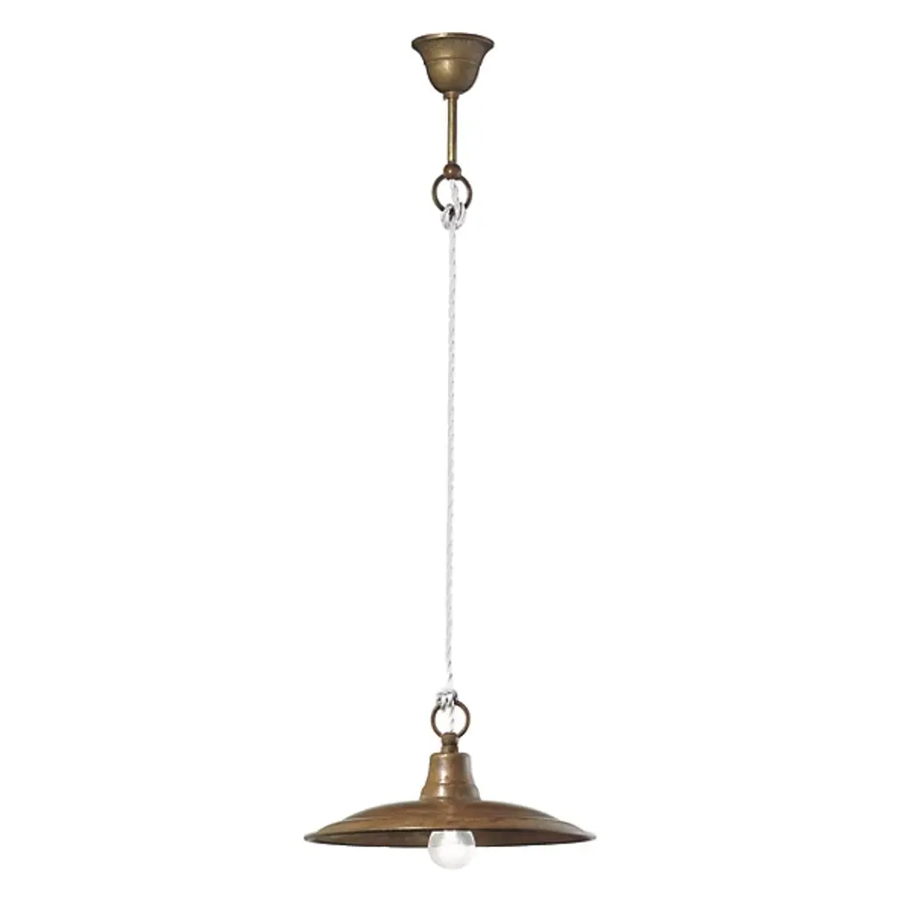 Il Fanale’s Barchessa Pendant is a striking brass luminaire crafted in Italy, exuding vintage charm through its straightforward design. Constructed from brass and copper, it draws inspiration from the ‘Arte Povera’ movement, reusing commonplace materials with an eye on expressive authenticity. Suspended from a circular canopy, a lengthy cord descends to an open lamping nestled within a shallow dish shade that appears to float when lit. The fixture transforms its surroundings with direct downlight and reflected radiance, accentuating the appeal of its clean lines and simple shapes.