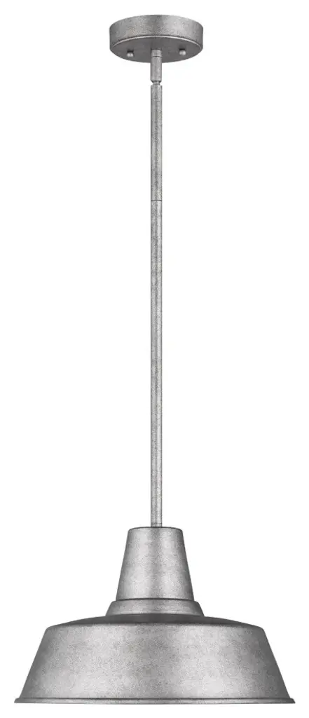 The Barn Light one light outdoor pendant fixture in weathered pewter creates a warm and inviting welcome presentation for your home''s exterior. The classic Barn Lights are hand crafted in aluminum and coated in a Galvanized or Blacksmith finish. Ideal for large or heavily trafficked outdoor areas that need plenty of downward directed light. The oversized Barn Lights make great accents to any commercial lighting plan or residential garage entry, shed, or patio. To customize your look, a 6" extender is included with every fixture. Also available as Dark Sky with four size options to choose from.From the brand formerly known as Generation Lighting LightingFarmhouse, rustic, damp-rated fixture with industrial aluminum shade is perfect for covered outdoor settings such as porches, patios, or entrywaysSloped ceiling compatible with all mounting hardware included plus (3) 12'''' stems and (1) 6'''' stem for customizable hanging heightUses (1) 75-watt A19 medium base light bulb sold separatelyNumber of Bulbs: 1Bulb Type: A19Bulb Wattage: 75Bulbs Included: No