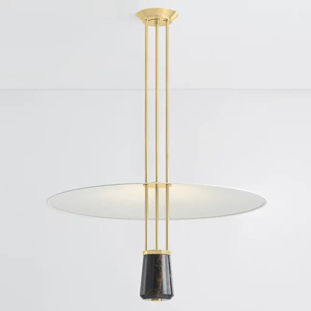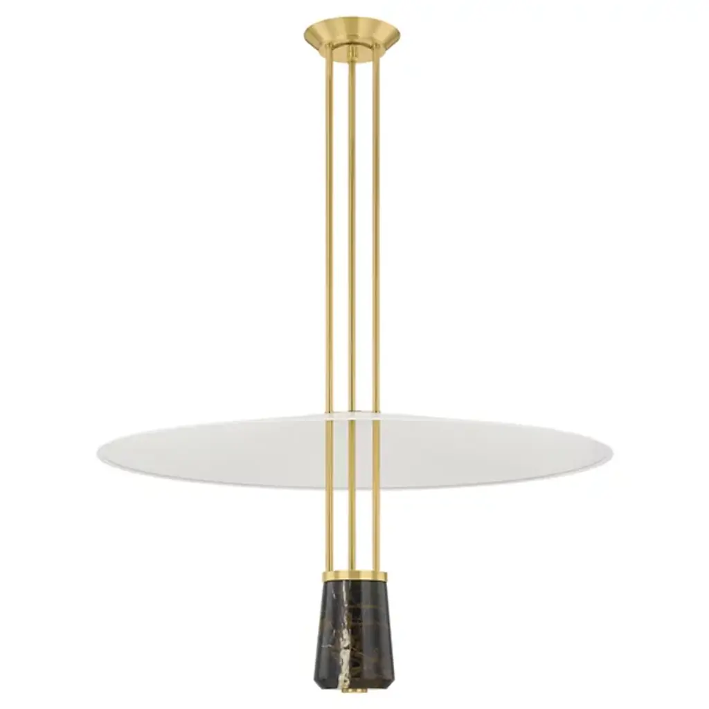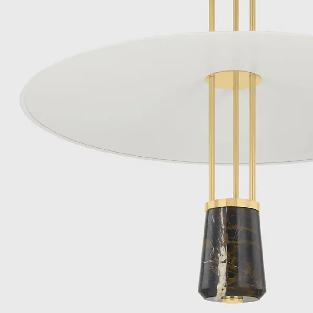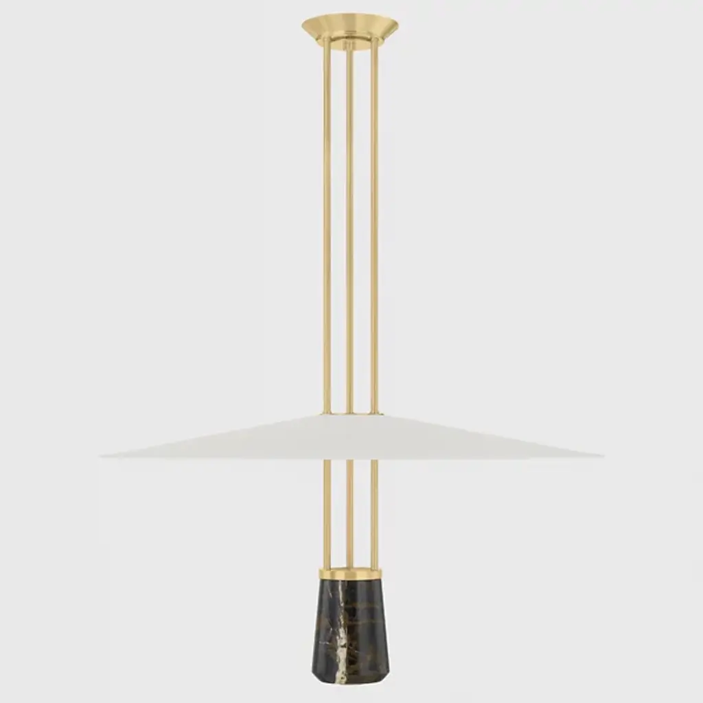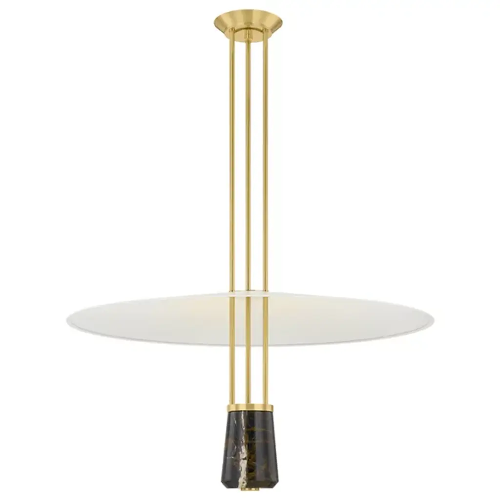 The Barnegat Pendant from Hudson Valley Lighting draws inspiration from a crane's graceful wingspan. A wide disc shade hovers above a St. Laurent marble base, connected by a trio of stems that give the pendant its distinctive character. The pendant's minimal design makes it an excellent choice for dining rooms and living spaces where modest lighting is desired. The combination of premium materials - steel construction, marble accent, and metalwork - creates an engaging composition that brings a mid-century aesthetic to modern spaces.