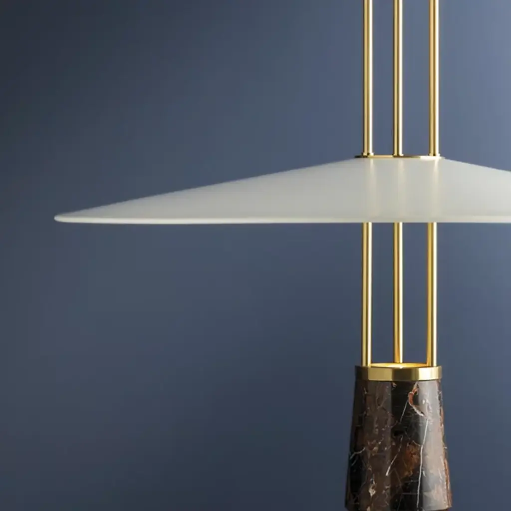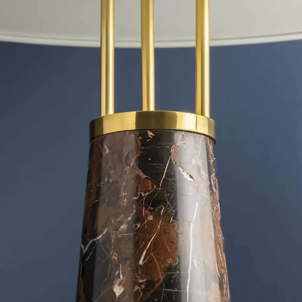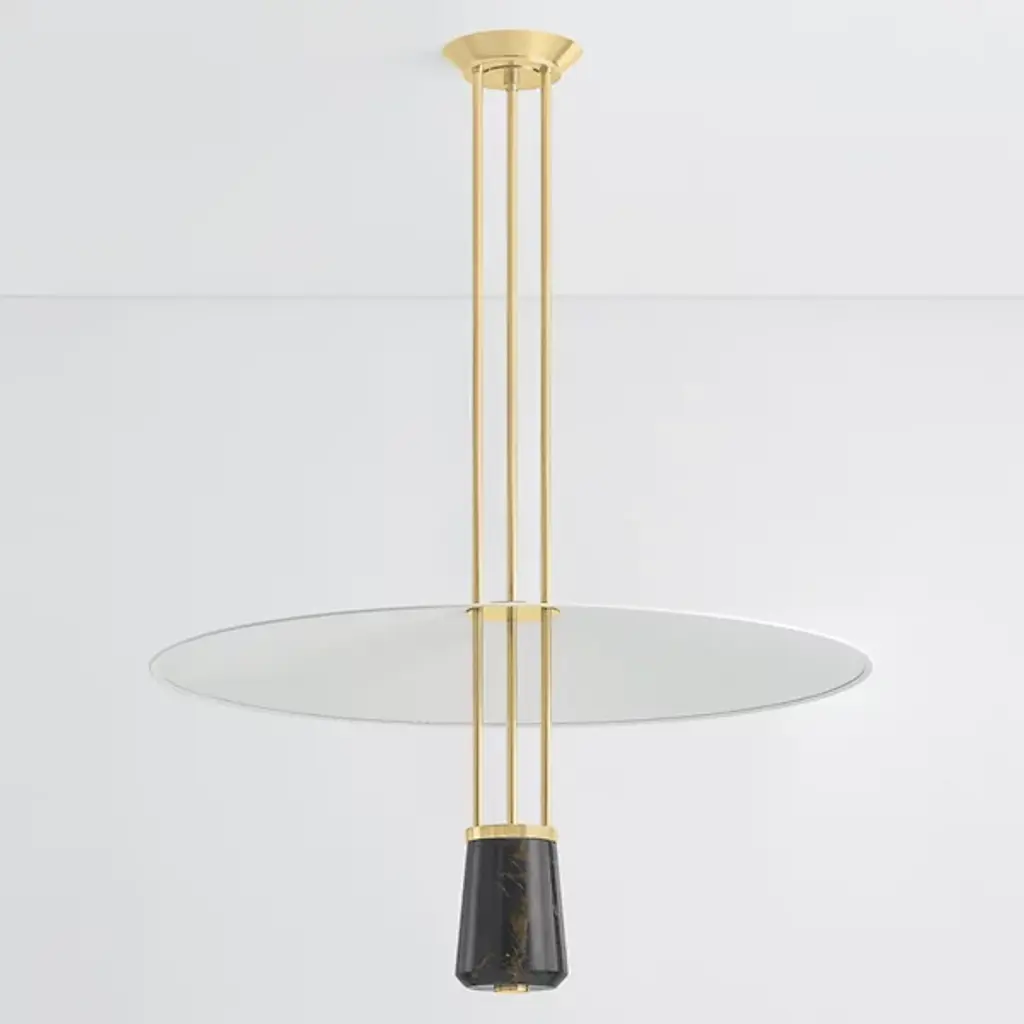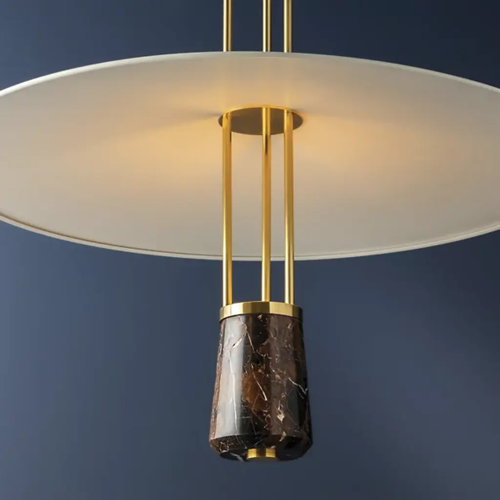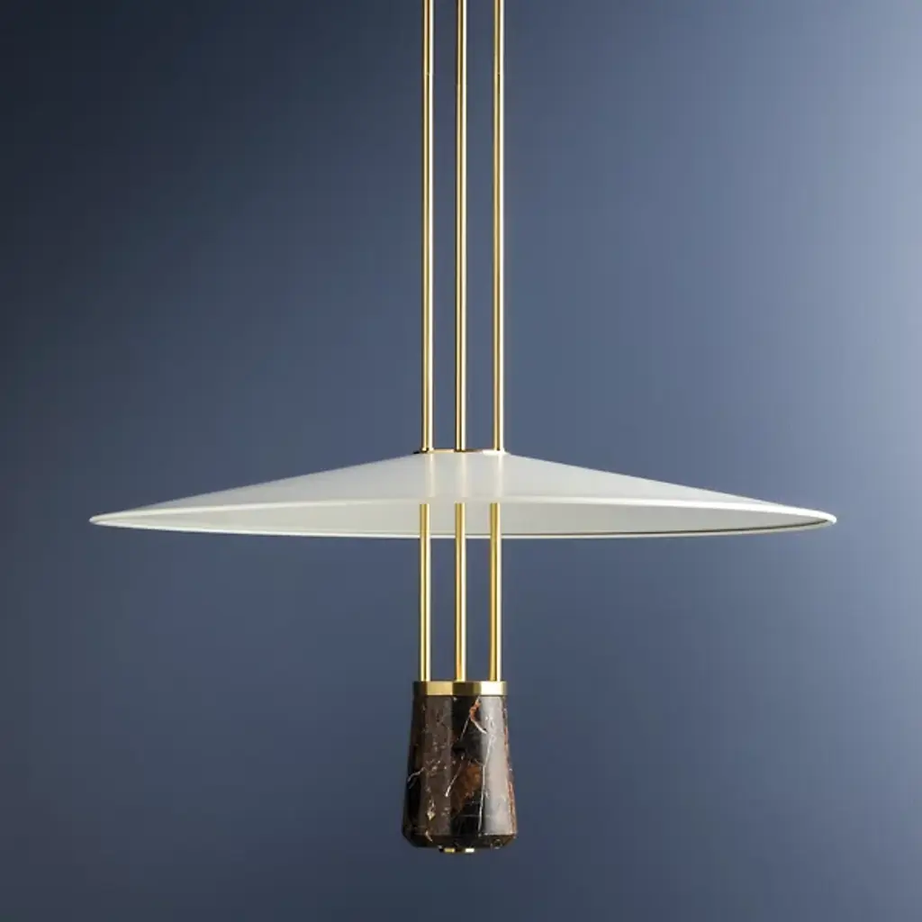 The Barnegat Pendant from Hudson Valley Lighting draws inspiration from a crane's graceful wingspan. A wide disc shade hovers above a St. Laurent marble base, connected by a trio of stems that give the pendant its distinctive character. The pendant's minimal design makes it an excellent choice for dining rooms and living spaces where modest lighting is desired. The combination of premium materials - steel construction, marble accent, and metalwork - creates an engaging composition that brings a mid-century aesthetic to modern spaces.