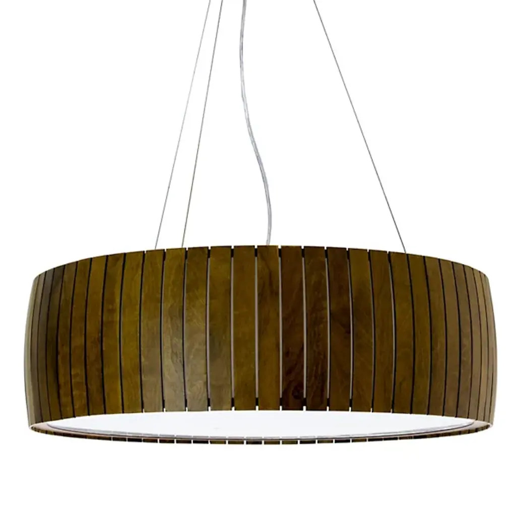 Go big at home with the robust lines and solid size of the Barrel Drum Pendant from Accord Lighting. Resembling a flattened keg, it’s made in Brazil and uses a smooth circular ceiling mount and an array of slender wires to hold a large light housing and shade. Potent lamping is set inside a sweeping assembly of slightly curved staves that support a disc diffuser able to transform direct downlight into a more pleasant ambiance that pours out an even and wide-reaching layer of light below.