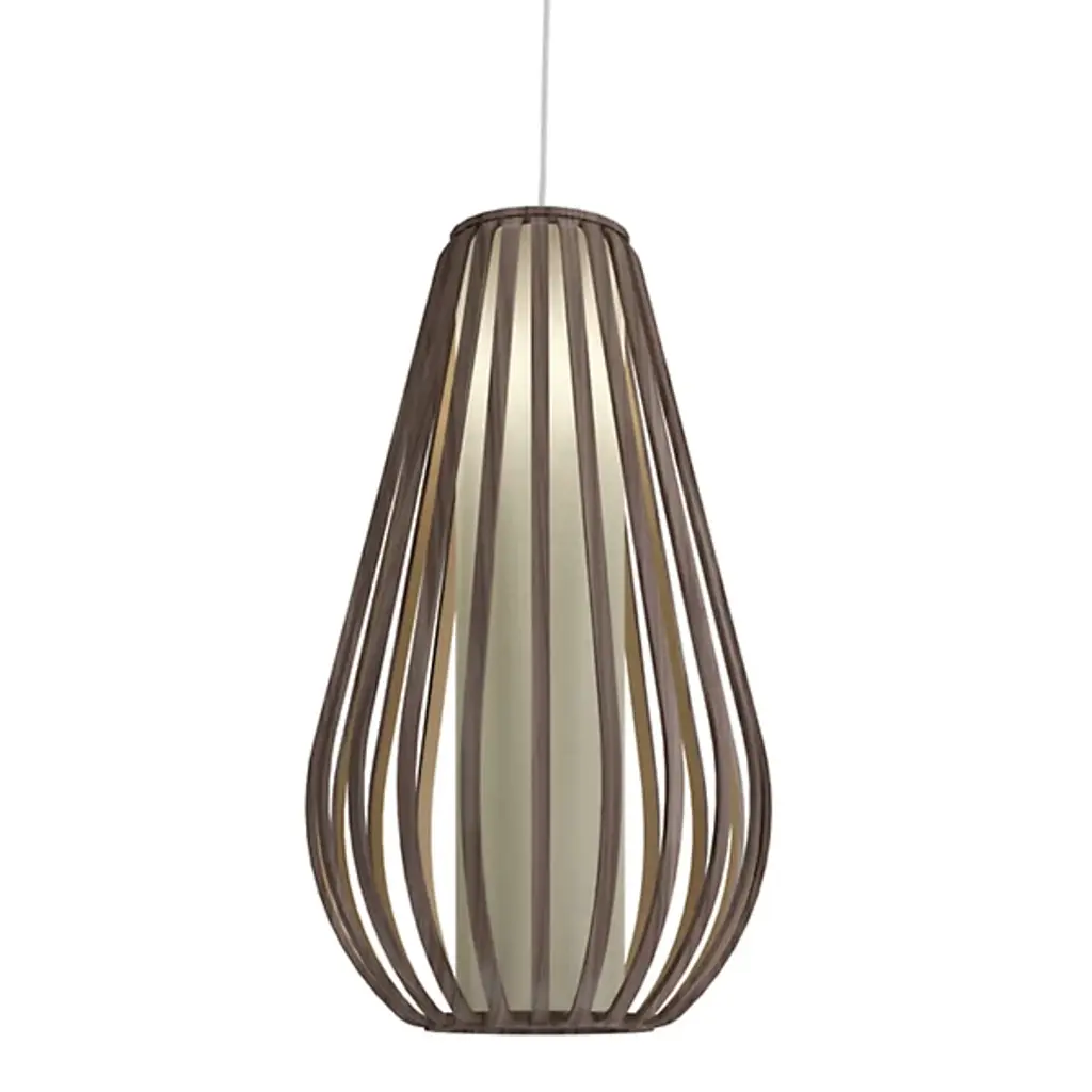 Bask in the warm and welcoming glow of the bold Barrel Long Pendant from Accord Lighting. A clever contemporary fixture made in Brazil, it uses a series of slim wires to belay a series of slats set around circular frames like an inverted barrel while screening the lamping within. This arrangement blunts most of the direct brightness while still allowing a focused wash of downlight to blend with the ambient glow that emerges from the vertical spaces between the slats.