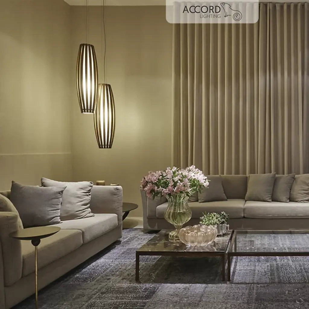 Bask in the warm and welcoming glow of the bold Barrel Long Pendant from Accord Lighting. A clever contemporary fixture made in Brazil, it uses a series of slim wires to belay a series of slats set around circular frames like an inverted barrel while screening the lamping within. This arrangement blunts most of the direct brightness while still allowing a focused wash of downlight to blend with the ambient glow that emerges from the vertical spaces between the slats.