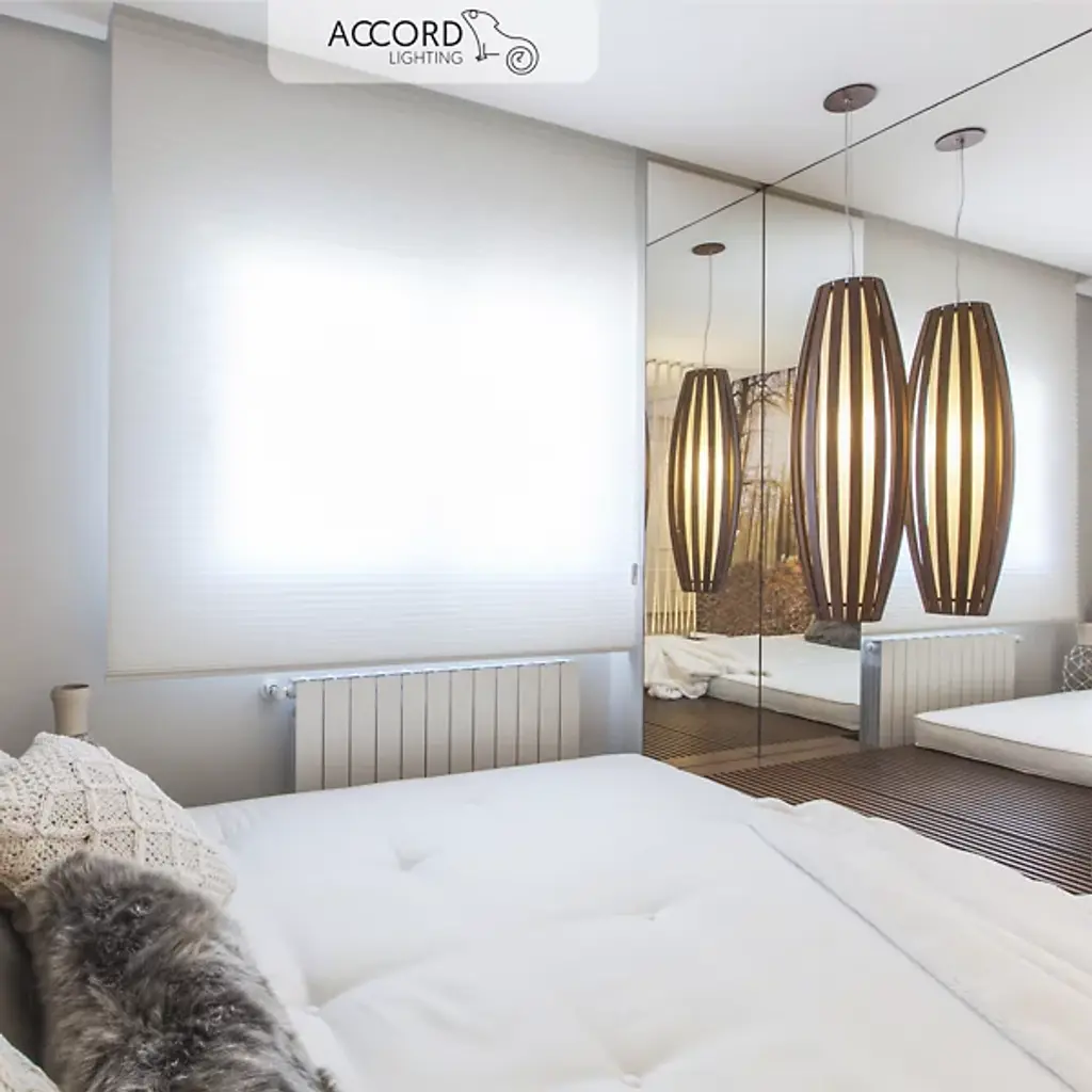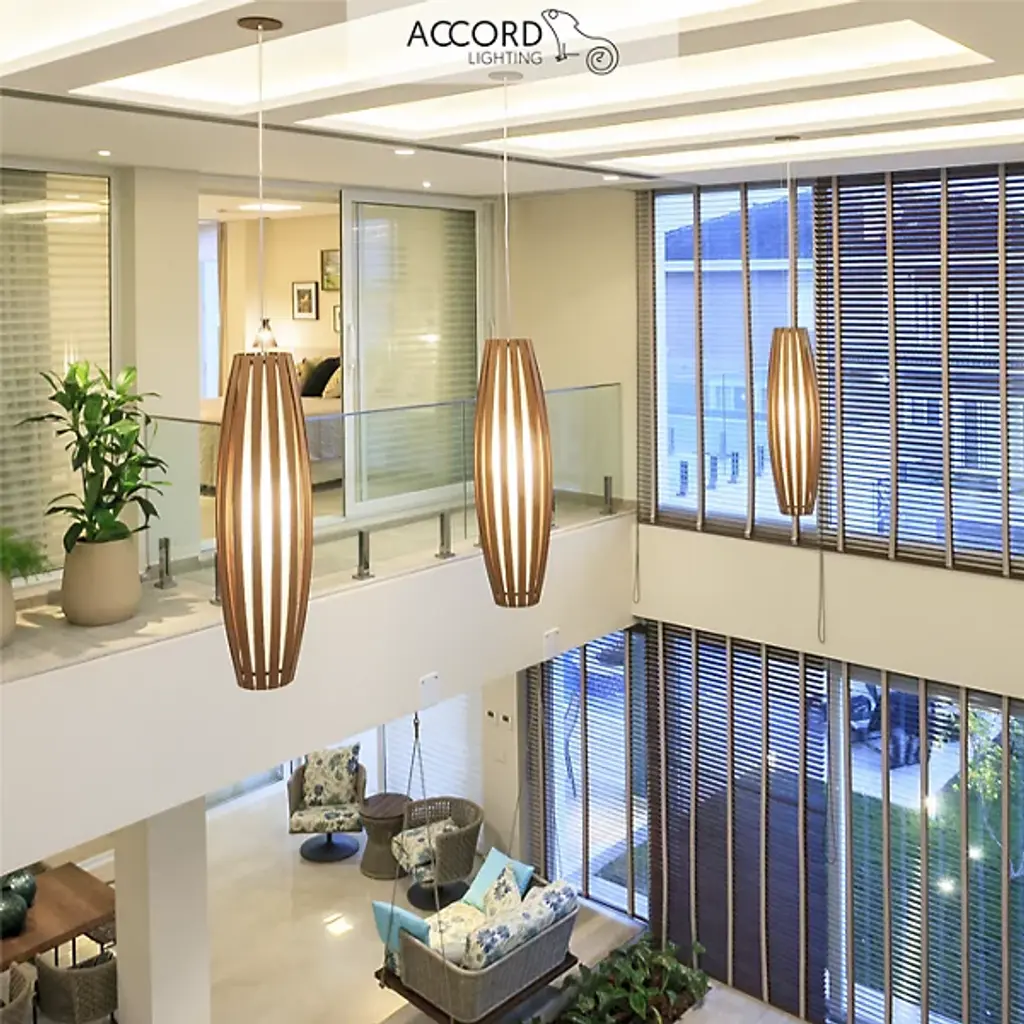 Bask in the warm and welcoming glow of the bold Barrel Long Pendant from Accord Lighting. A clever contemporary fixture made in Brazil, it uses a series of slim wires to belay a series of slats set around circular frames like an inverted barrel while screening the lamping within. This arrangement blunts most of the direct brightness while still allowing a focused wash of downlight to blend with the ambient glow that emerges from the vertical spaces between the slats.