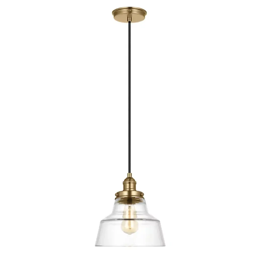 An antiquated look armed and surrounded with an ultra-clean, new-age exterior, the Baskin Bell Pendant from Visual Comfort Studio, formerly known as Feiss, revives the industrial era lamp with a contemporary profile. A fine steel base gives the Baskin Chimney Nickel Pendant Light a modernized feel, which works in direct contrast to the vintage filament bulb at its center. Surrounding the focal point is thick clear glass for light diffusion. Line several Baskins together for effective task or island lighting.