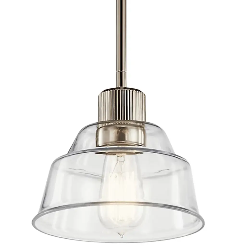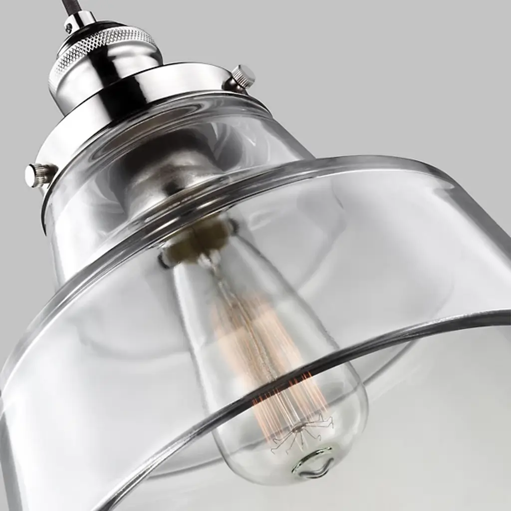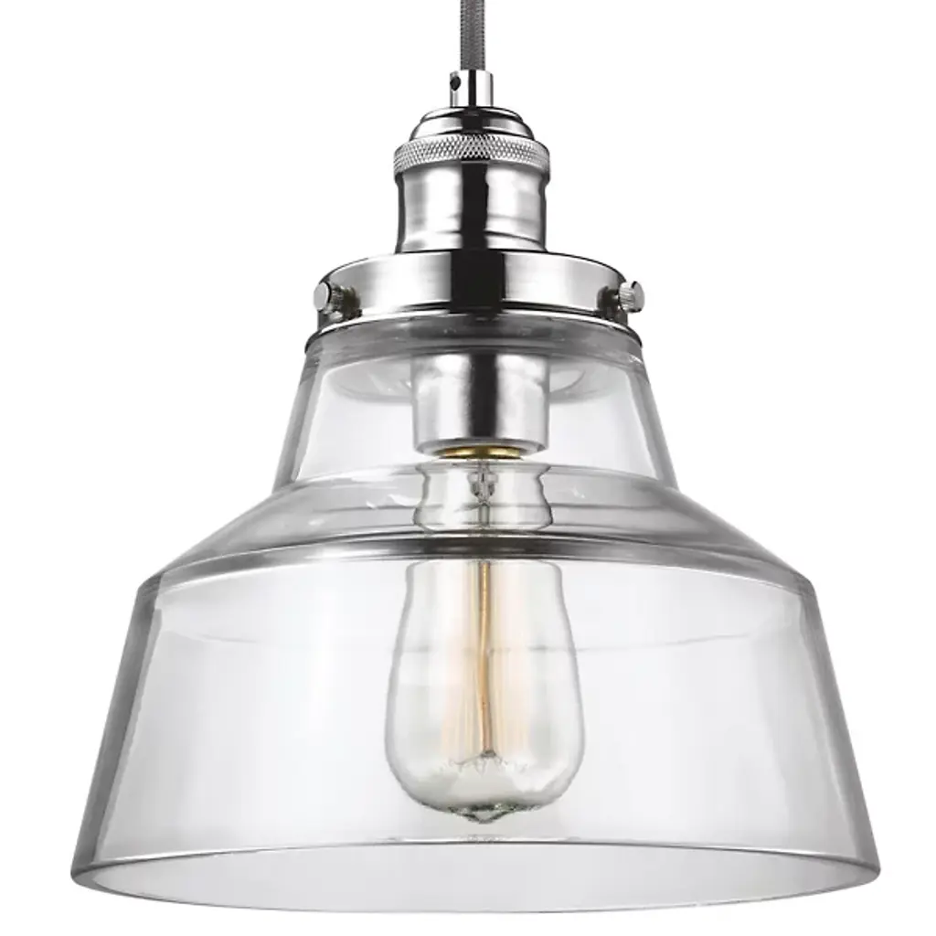 An antiquated look armed and surrounded with an ultra-clean, new-age exterior, the Baskin Bell Pendant from Visual Comfort Studio, formerly known as Feiss, revives the industrial era lamp with a contemporary profile. A fine steel base gives the Baskin Chimney Nickel Pendant Light a modernized feel, which works in direct contrast to the vintage filament bulb at its center. Surrounding the focal point is thick clear glass for light diffusion. Line several Baskins together for effective task or island lighting.