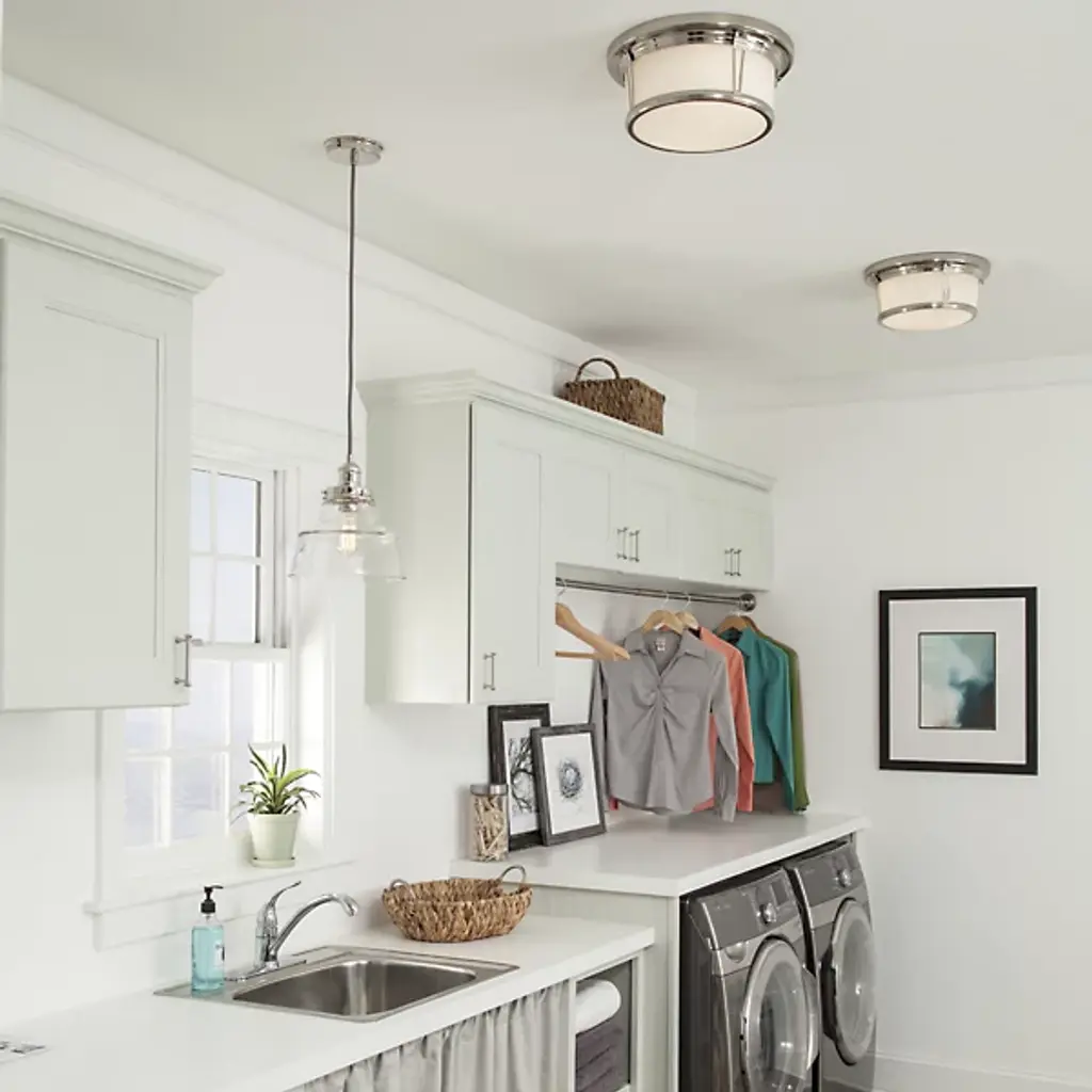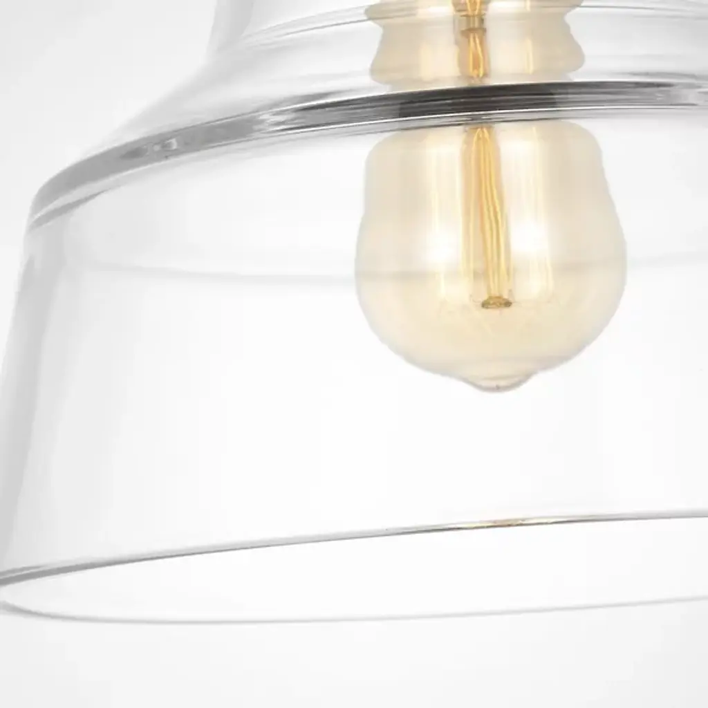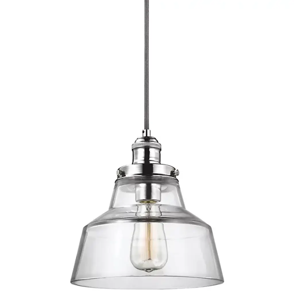 An antiquated look armed and surrounded with an ultra-clean, new-age exterior, the Baskin Bell Pendant from Visual Comfort Studio, formerly known as Feiss, revives the industrial era lamp with a contemporary profile. A fine steel base gives the Baskin Chimney Nickel Pendant Light a modernized feel, which works in direct contrast to the vintage filament bulb at its center. Surrounding the focal point is thick clear glass for light diffusion. Line several Baskins together for effective task or island lighting.