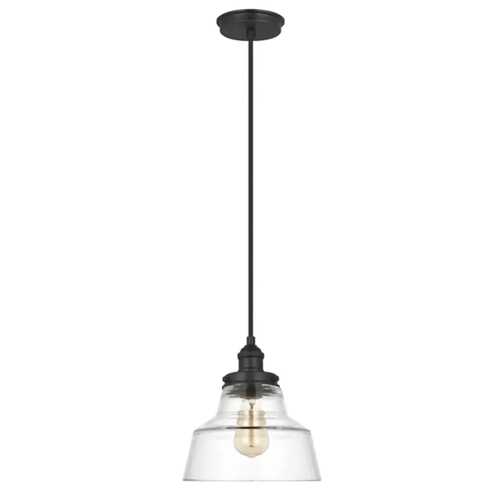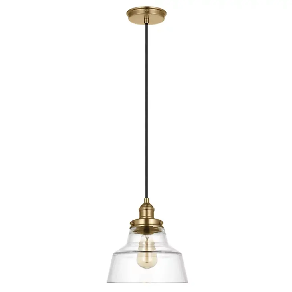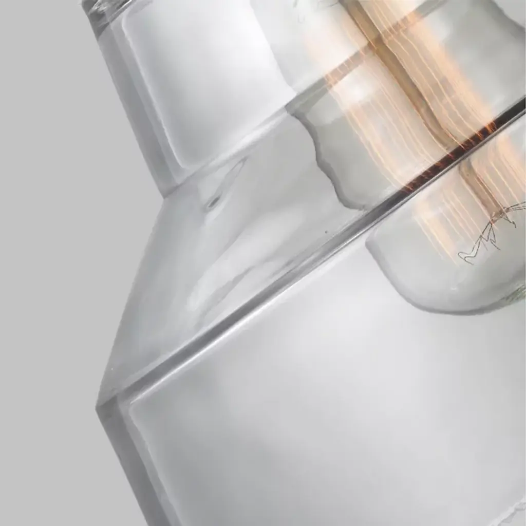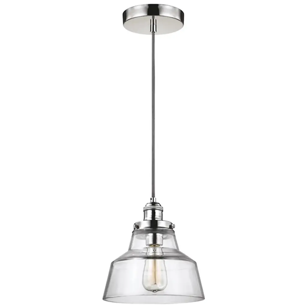 An antiquated look armed and surrounded with an ultra-clean, new-age exterior, the Baskin Bell Pendant from Visual Comfort Studio, formerly known as Feiss, revives the industrial era lamp with a contemporary profile. A fine steel base gives the Baskin Chimney Nickel Pendant Light a modernized feel, which works in direct contrast to the vintage filament bulb at its center. Surrounding the focal point is thick clear glass for light diffusion. Line several Baskins together for effective task or island lighting.