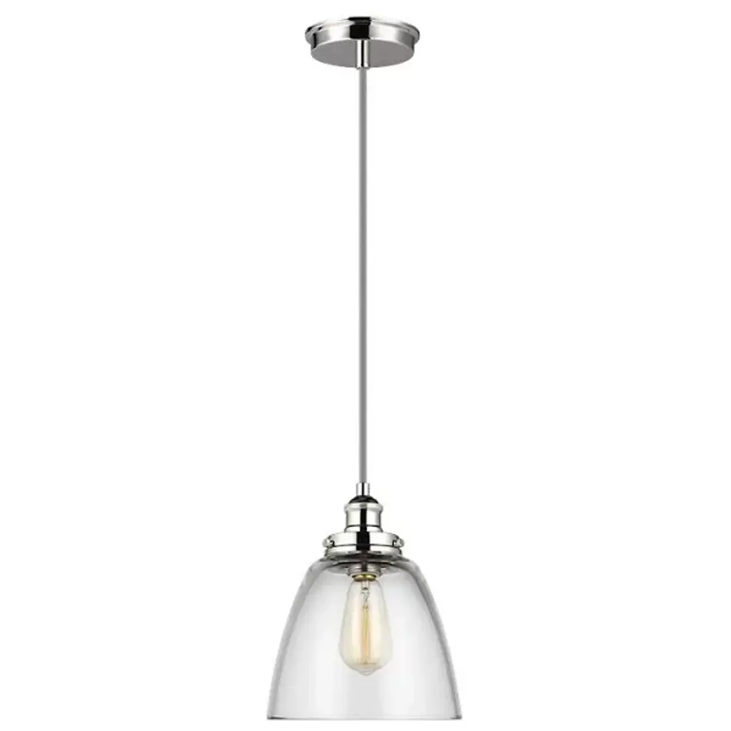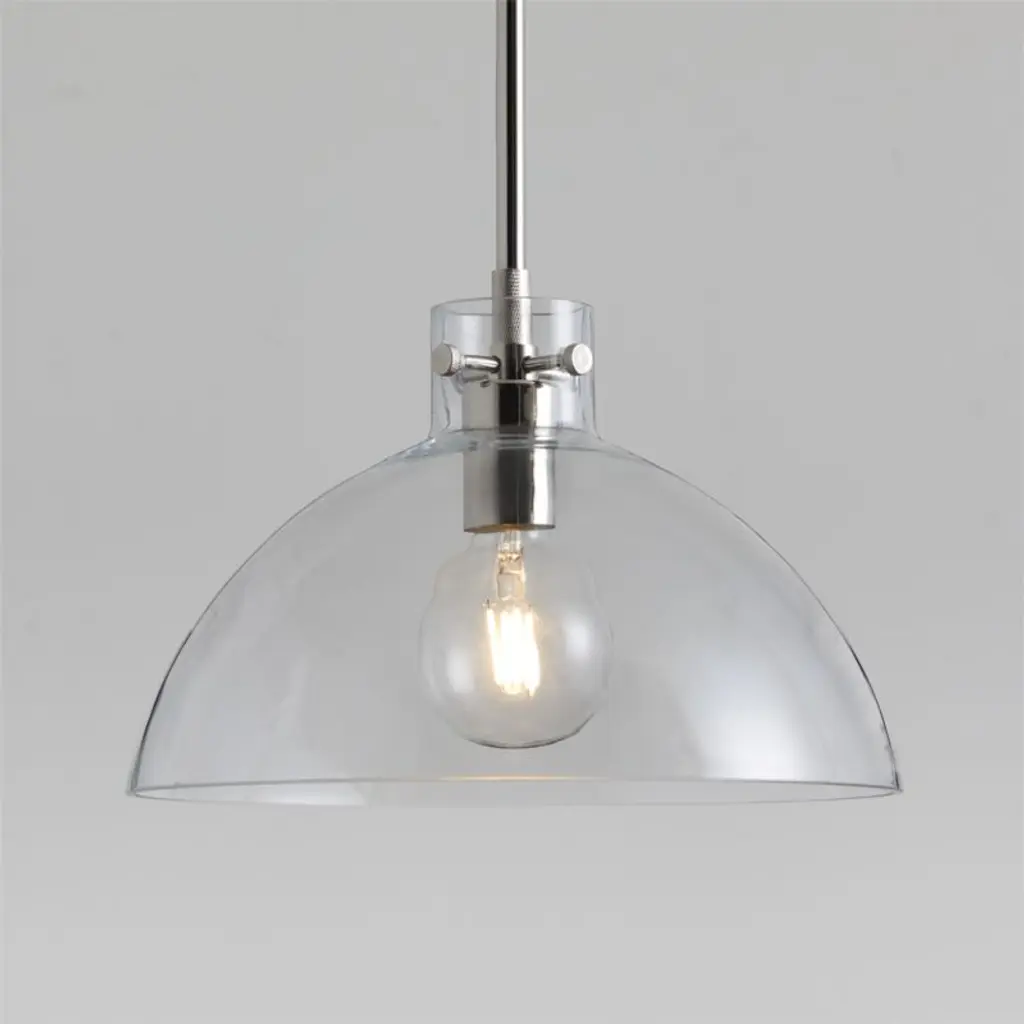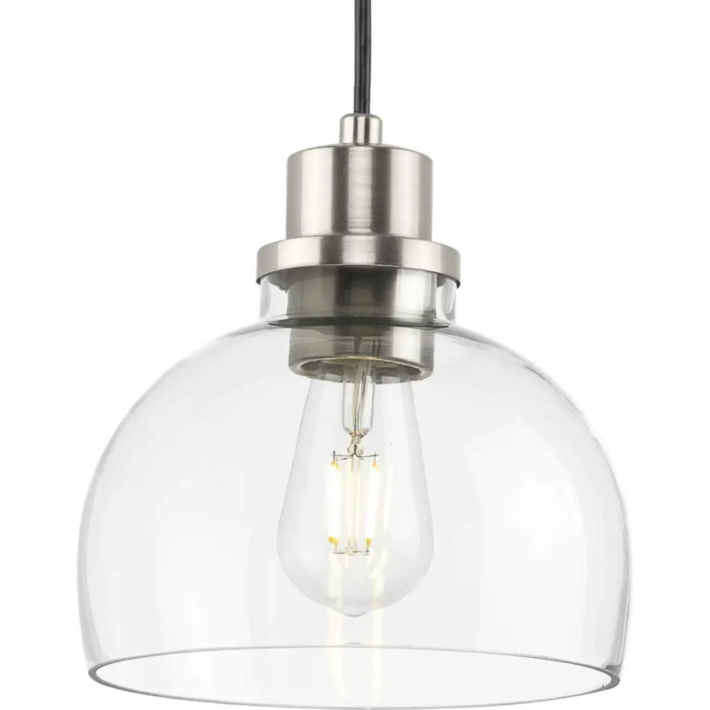 The antiquated lighting style armed and surrounded with sleek modernization, the Visual Comfort Studio, formerly known as Feiss, Baskin Dome Pendant revives the industrial era with a contemporary look. A fine steel exterior base gives the Baskin Dome Nickel Pendant a new-age feel, which works in direct contrast to the vintage filament bulb at the center. Surrounding the focal point is thick clear glass made durable for extra protection. Line several Baskins together for efficient task or island lighting.