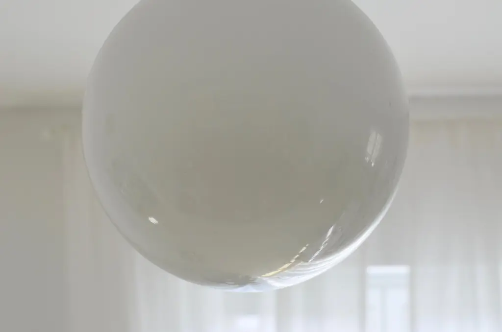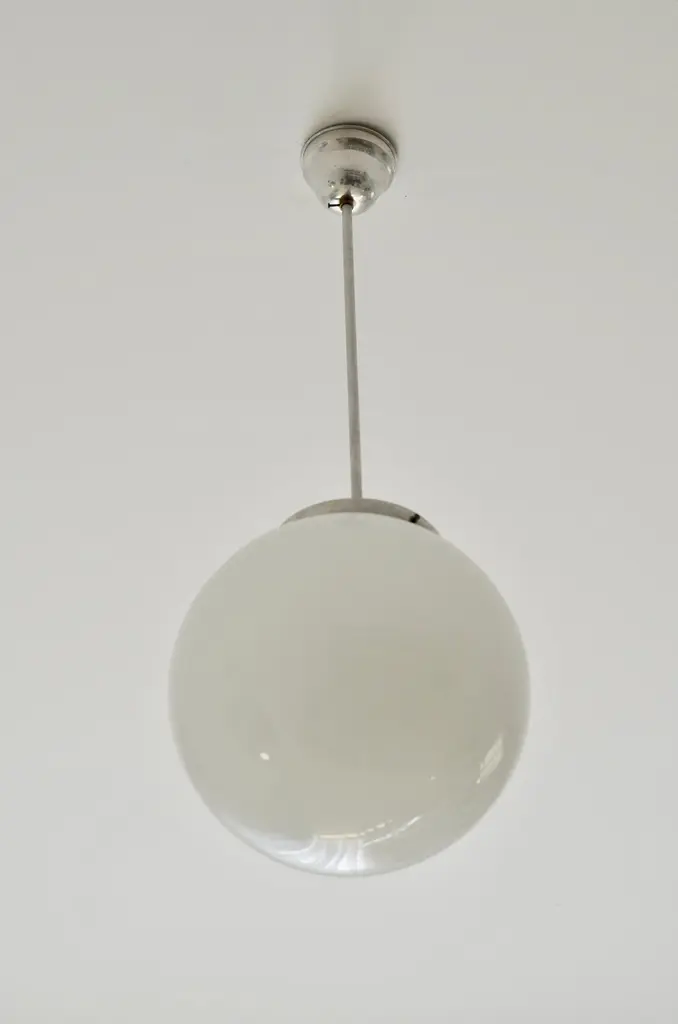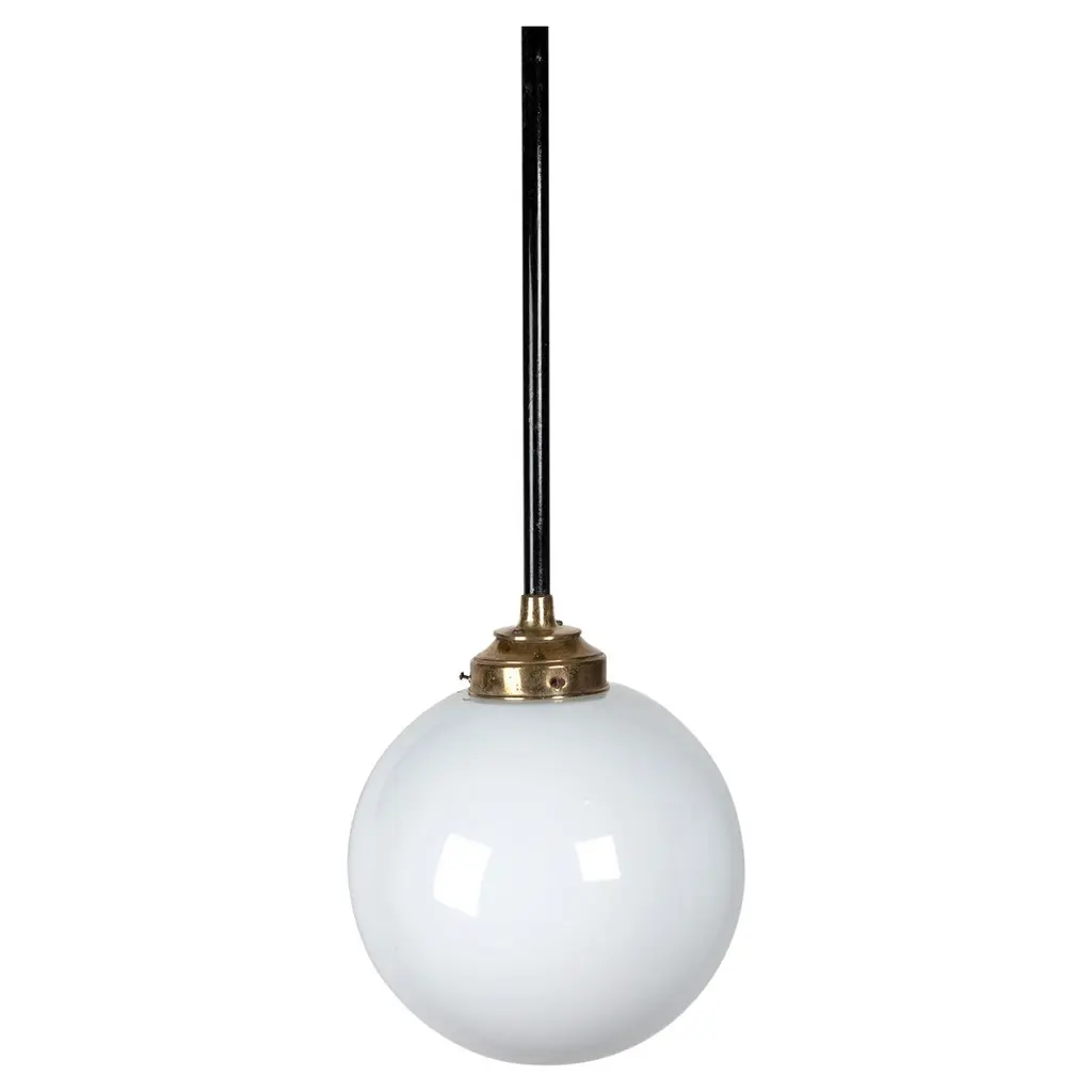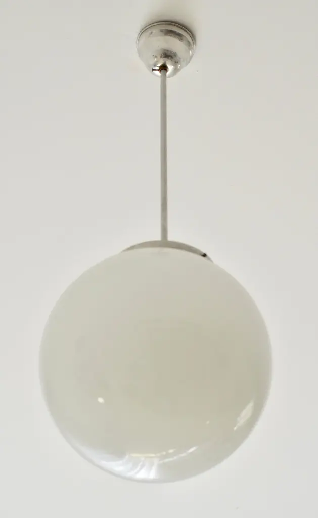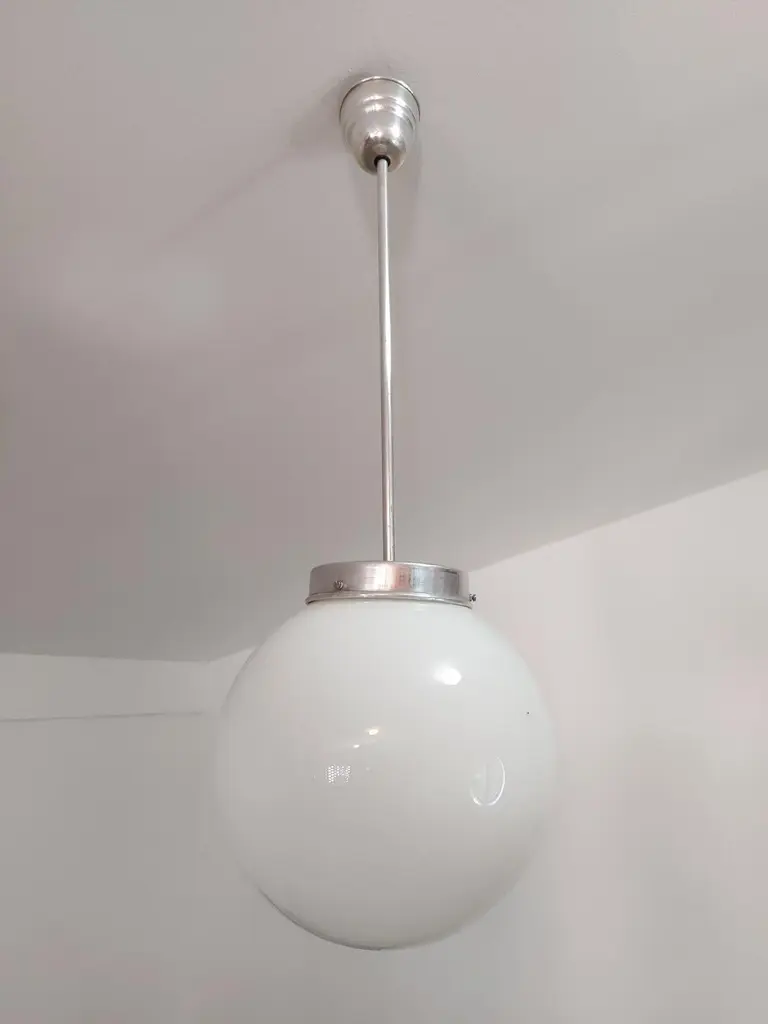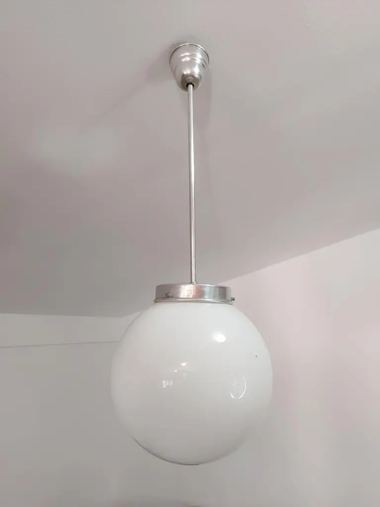 Bauhaus style pendant light.Producer: EMI Poljcane, Slovenia, Yugoslavia.Period of Production: 1950s.Material: opaline glass, aluminum.Measure: diameter: 24 cm.