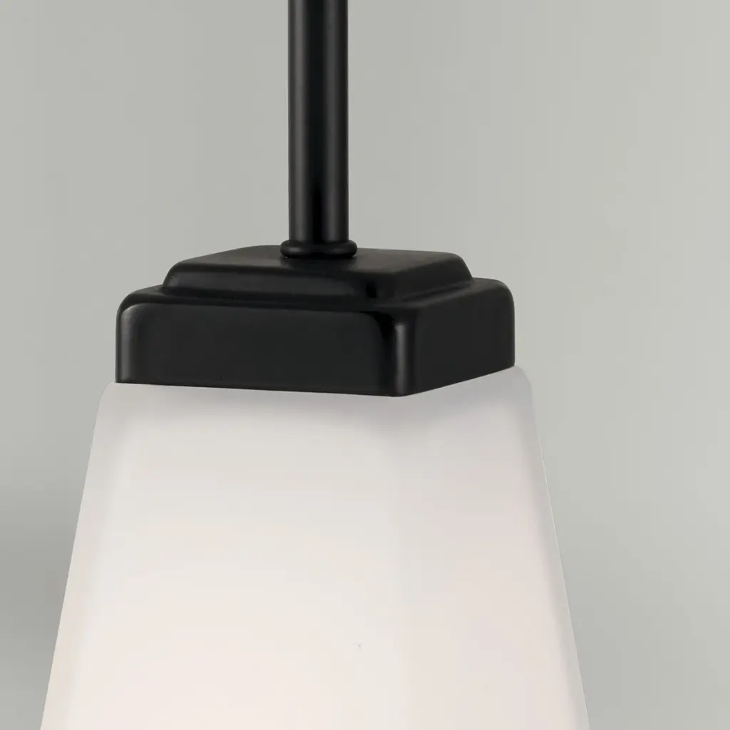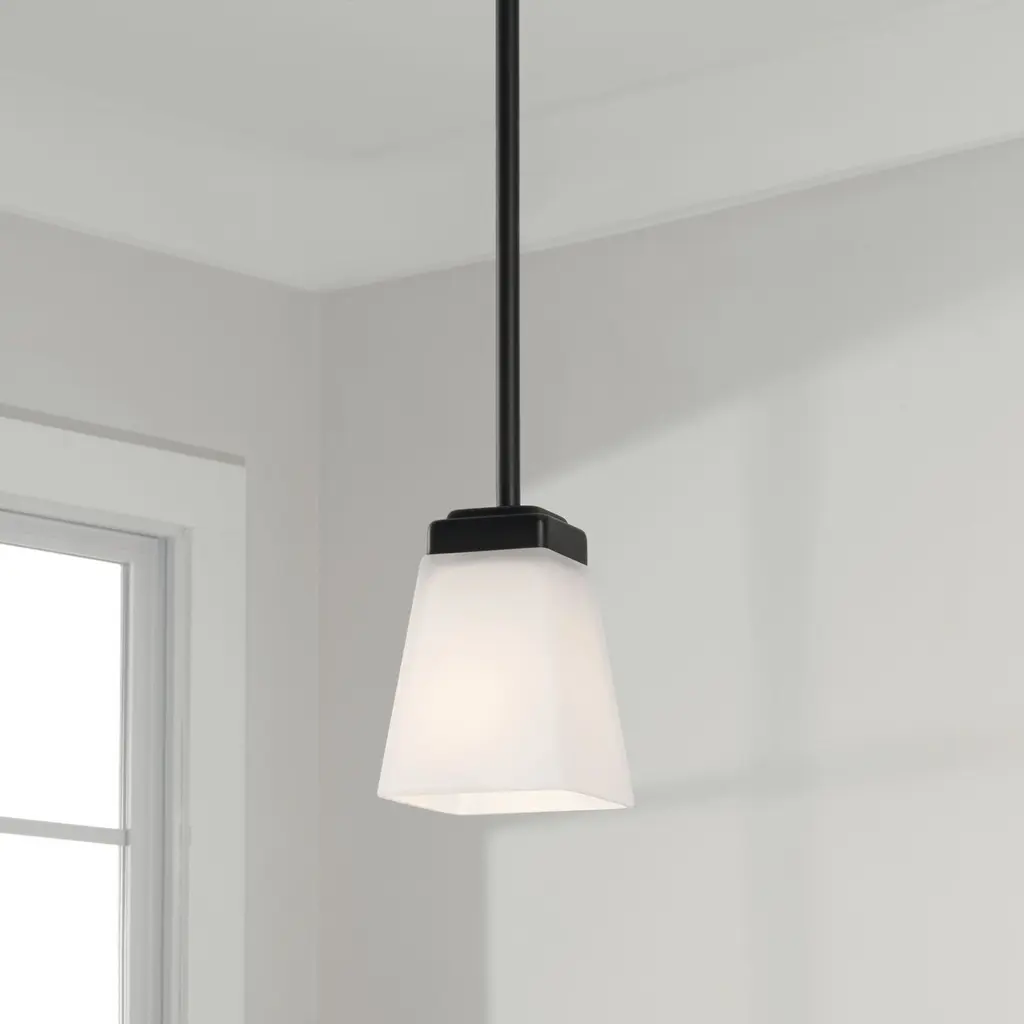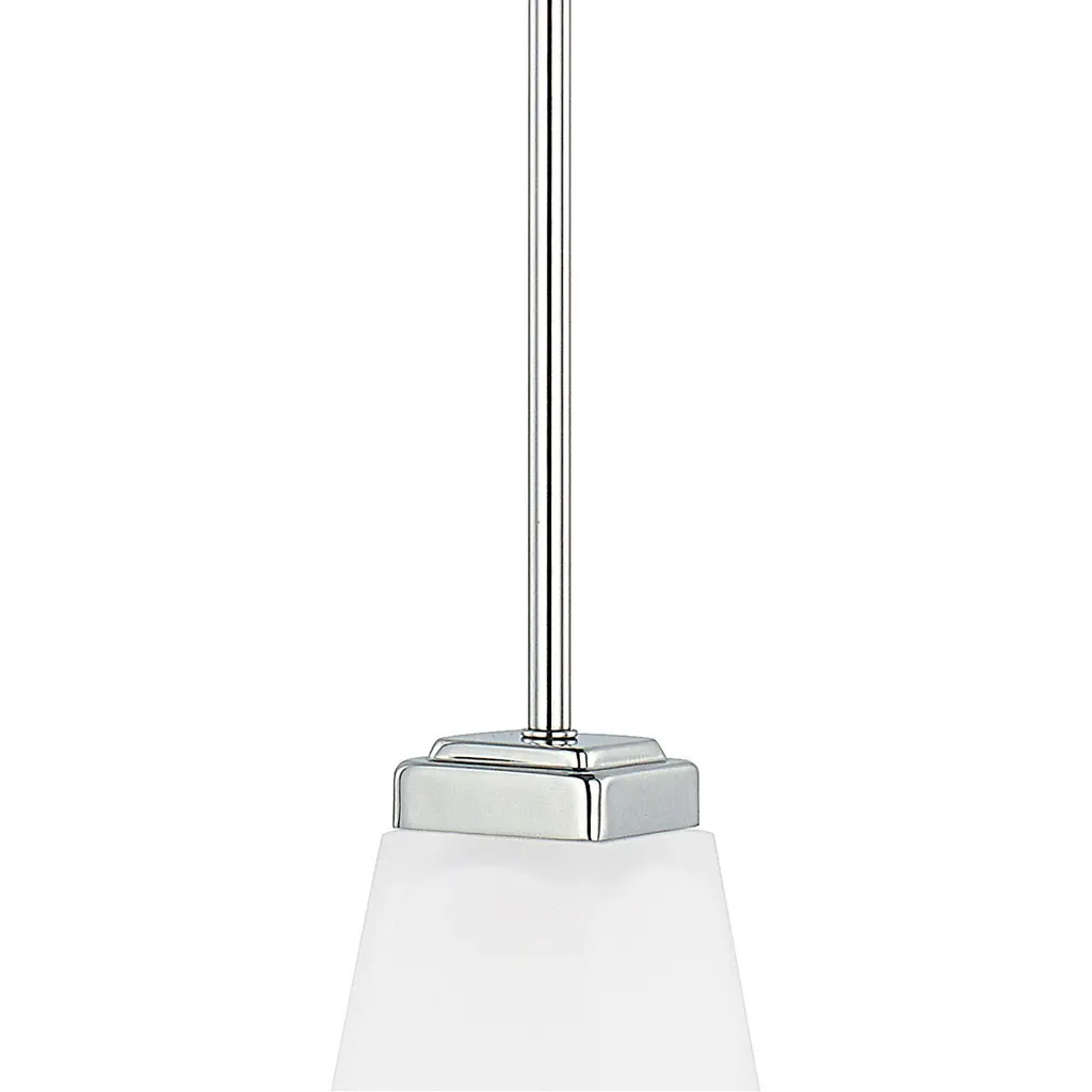 The simple geometric shape of soft white glass brings a touch of modern to this simple mini pendant, perfect for illuminating in small spaces like over your sink or kitchen peninsula.