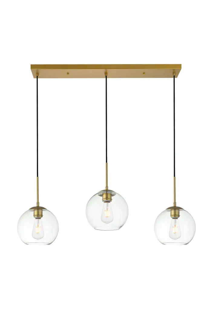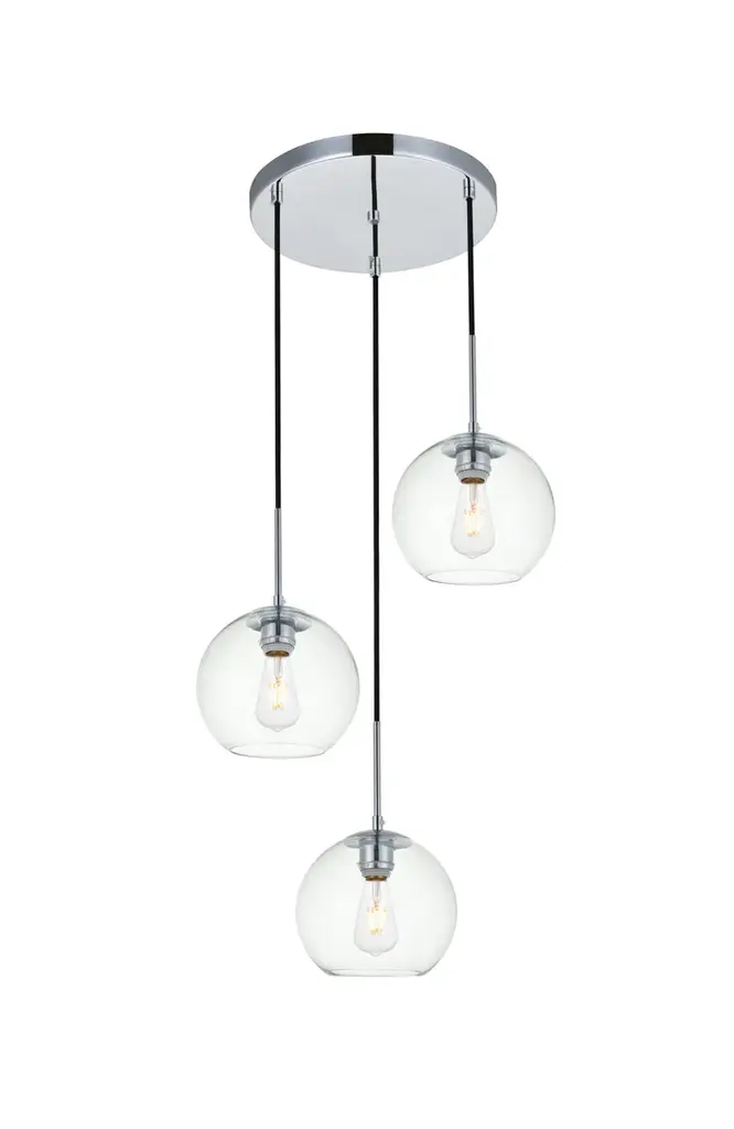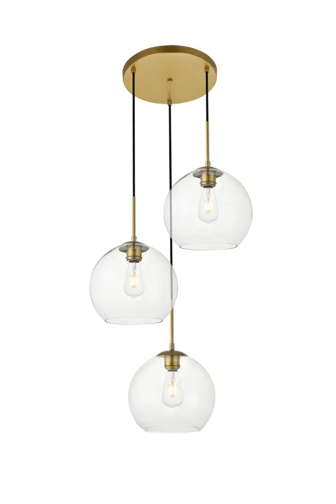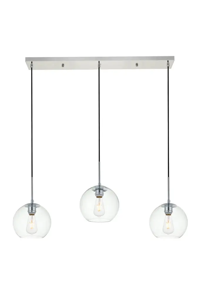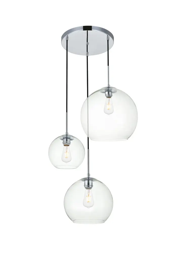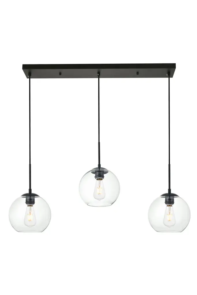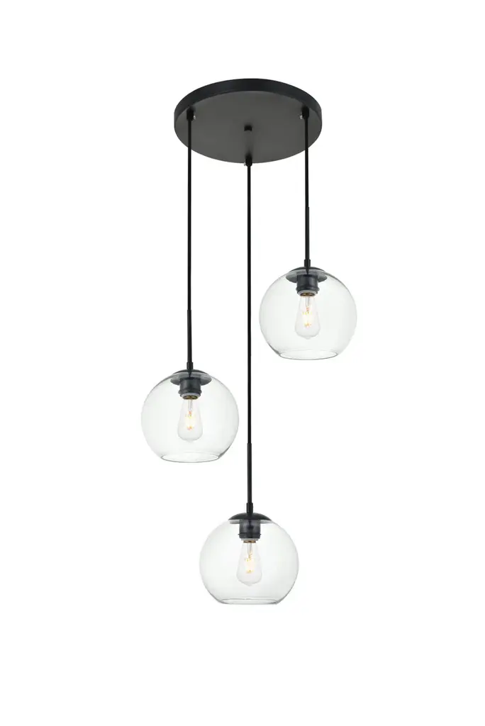 Refined style with a practical design, Baxter hanging pendant lamps bring cosmopolitan sophistication anywhere, especially to an entryway, office, bathroom, bedroom, or kitchen. The smooth iron frame features a disk-shaped canopy and comes in a black finish. Adjustable black cords allow you to modify the hanging height from 14 to 87 inches. Three identical clear spherical glass shades are suspended at varying heights and remain open at the center to allow for effortless replacement of the filament-style bulbs (not included). Living in the big city has never been this easy.