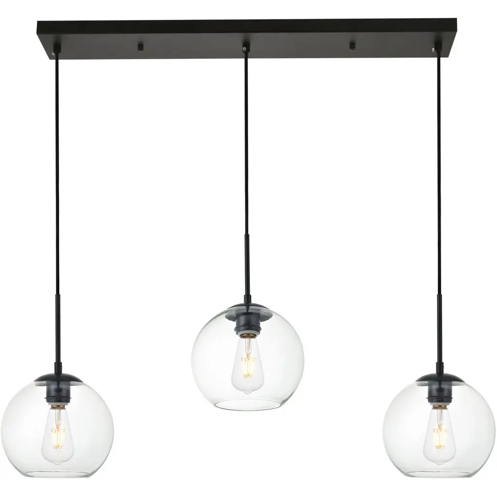 Refined style with a practical design, Baxter hanging pendant lamps bring cosmopolitan sophistication anywhere, especially to an entryway, office, bathroom, bedroom, or kitchen. The smooth iron frame features a rectangular canopy and comes in a black finish. Adjustable black cords allow you to vary the hanging height from 14 to 87 inches. Two staggered rows of five identical clear spherical glass shades remain open at the center to allow for effortless replacement of the filament-style bulbs (not included). Living in the big city has never been this easy.