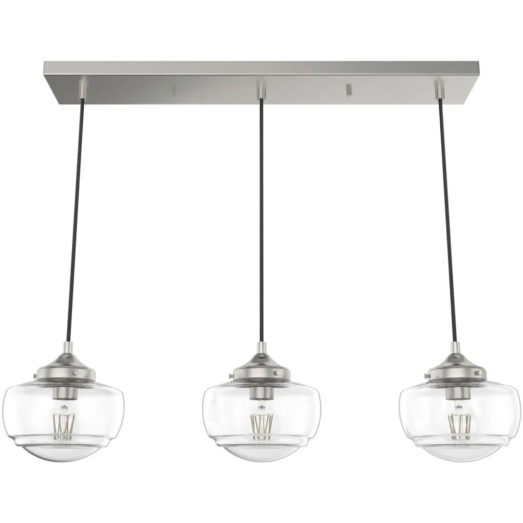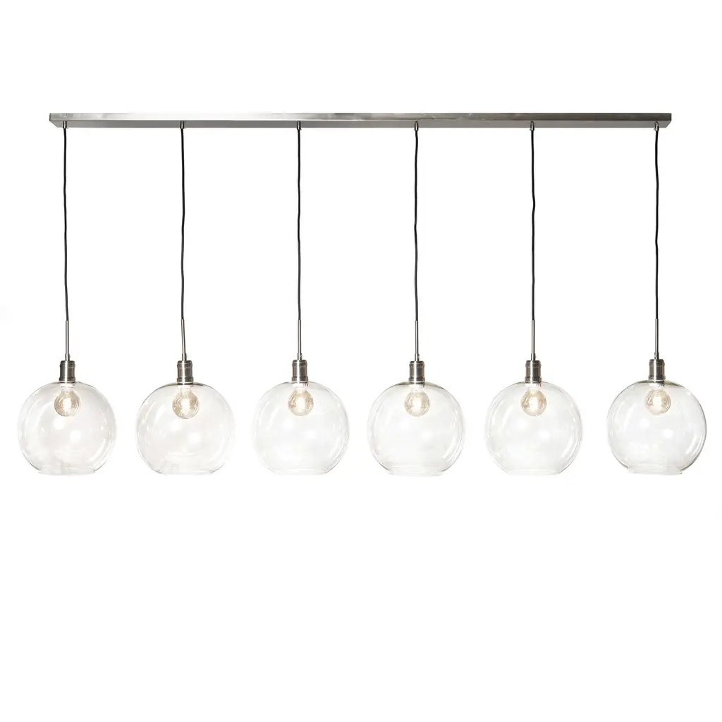 Refined style with a practical design, Baxter hanging pendant lamps bring cosmopolitan sophistication anywhere, especially to an entryway, office, bathroom, bedroom, or kitchen. The smooth iron frame features a rectangular canopy and comes in a chrome finish. Adjustable black cords allow you to vary the hanging height from 14 to 87 inches. Two staggered rows of seven identical clear spherical glass shades remain open at the center to allow for effortless replacement of the filament-style bulbs (not included). Living in the big city has never been this easy.