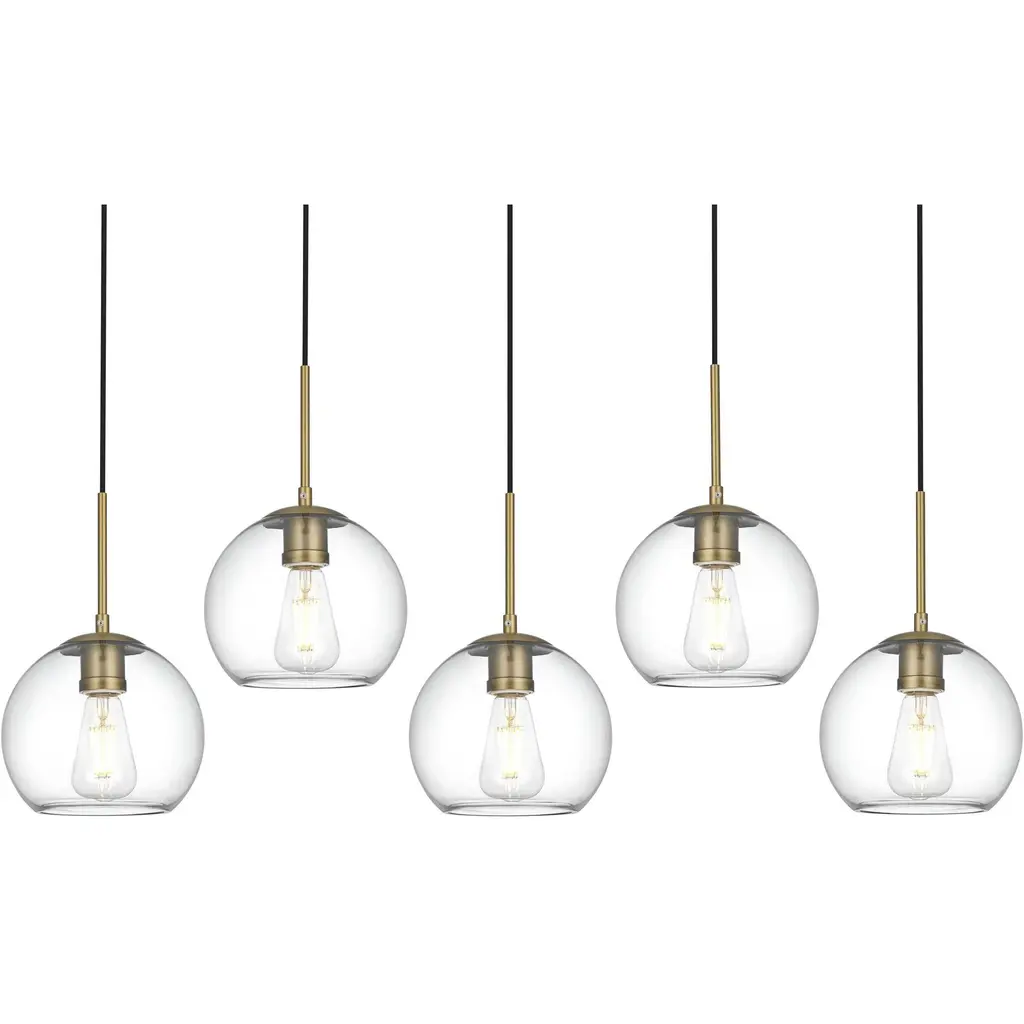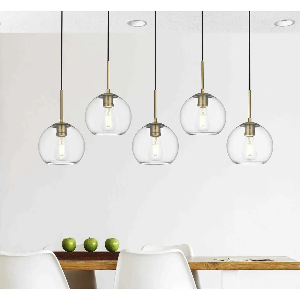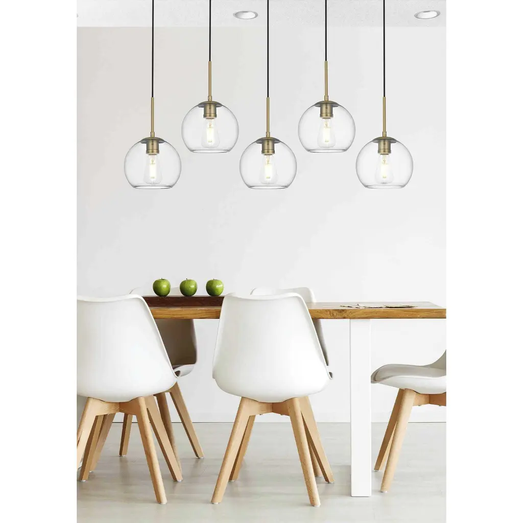 The Baxter hanging pendant light combines refined style with a practical design, adding cosmopolitan sophistication to any spacebe it an entryway, hallway, bathroom, kitchen, or closet. The sleek iron frame, complete with a rectangular canopy, elegantly supports five clear spherical glass shade that stays open at the center, making bulb replacement effortless. Designed for those who love the look of big-city elegance, the Baxter pendant makes sophisticated living easy.