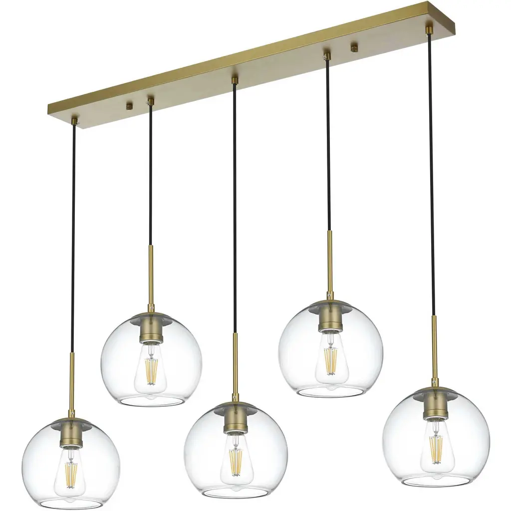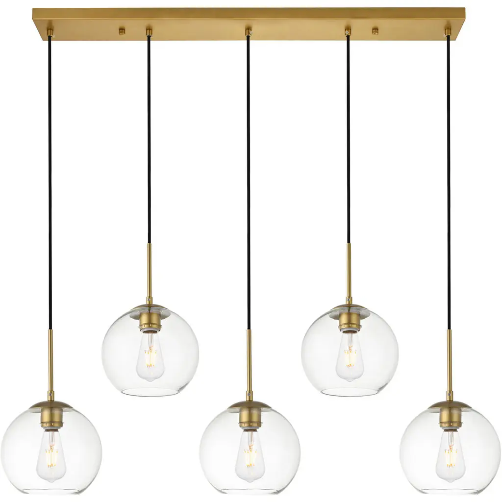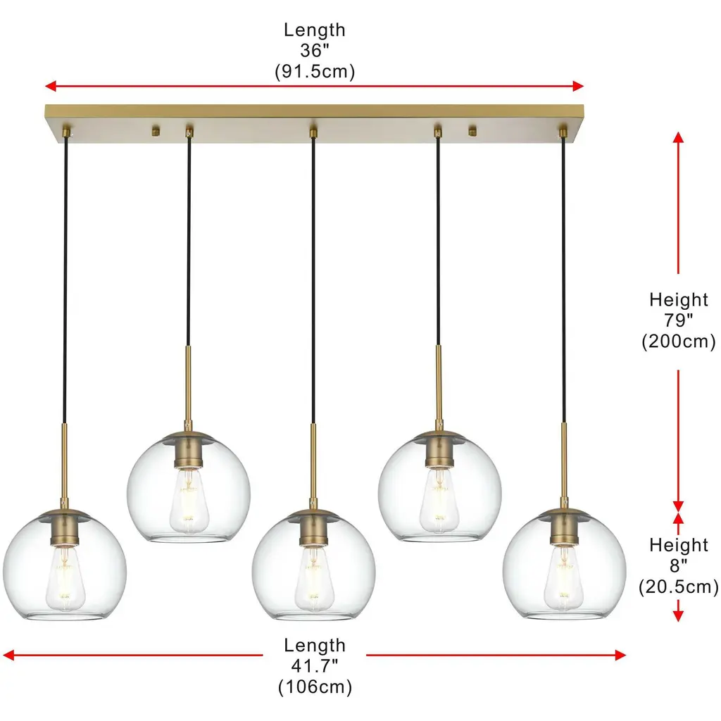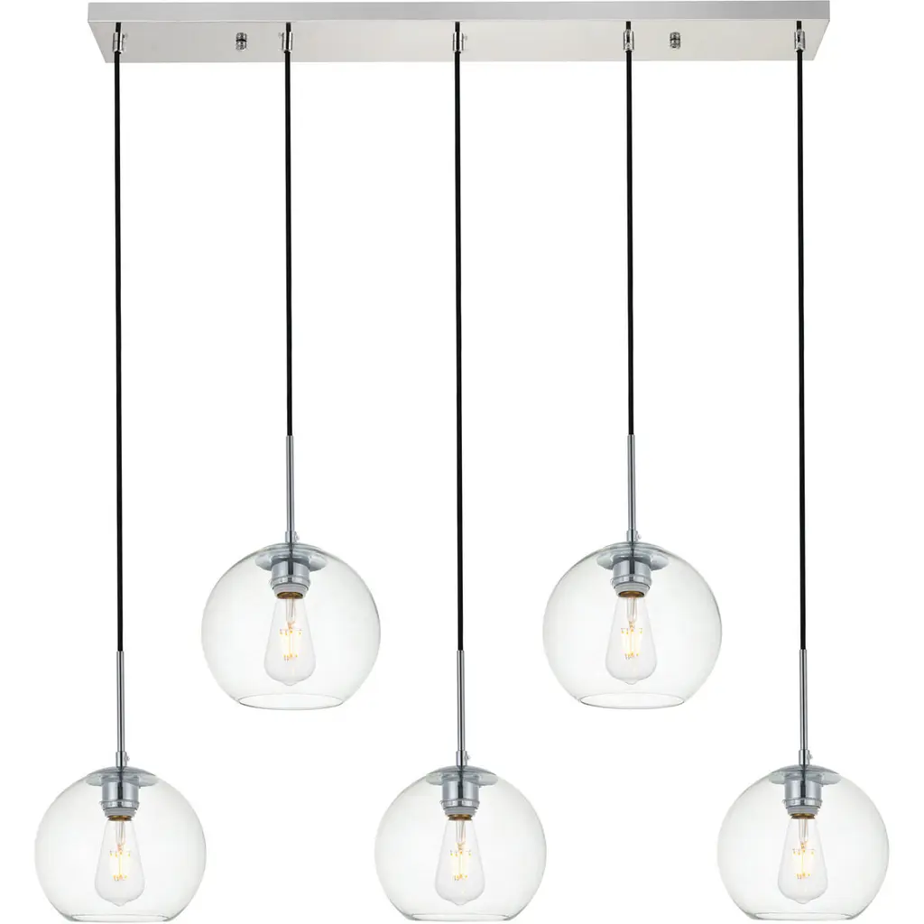 The Baxter hanging pendant light combines refined style with a practical design, adding cosmopolitan sophistication to any spacebe it an entryway, hallway, bathroom, kitchen, or closet. The sleek iron frame, complete with a rectangular canopy, elegantly supports five clear spherical glass shade that stays open at the center, making bulb replacement effortless. Designed for those who love the look of big-city elegance, the Baxter pendant makes sophisticated living easy.
