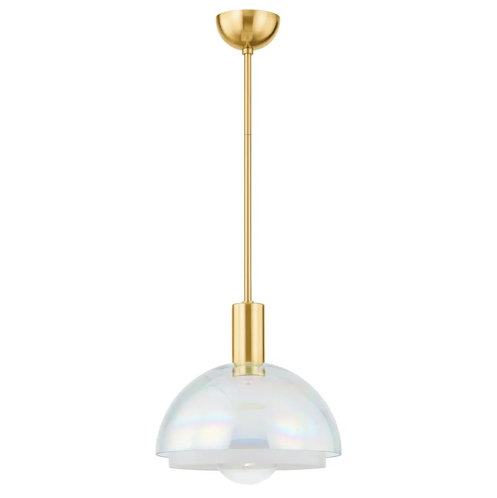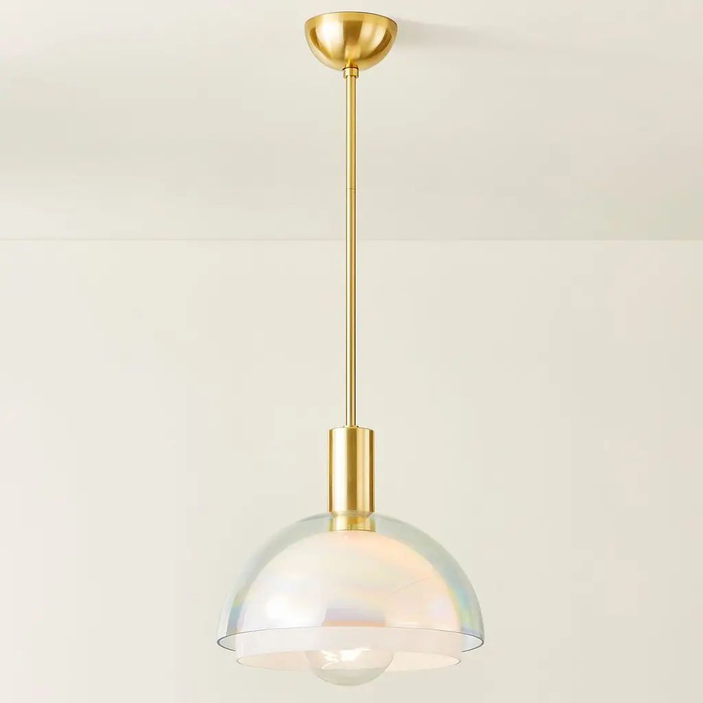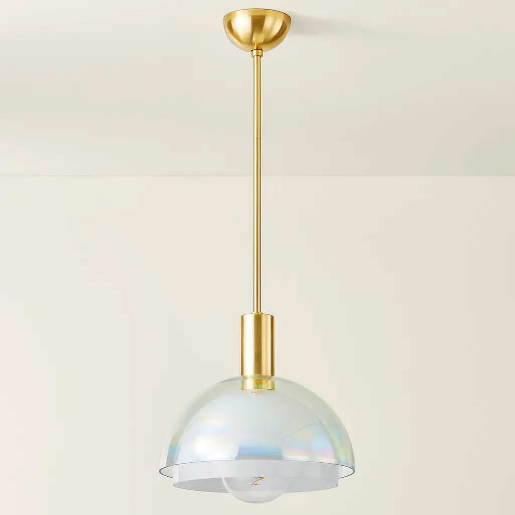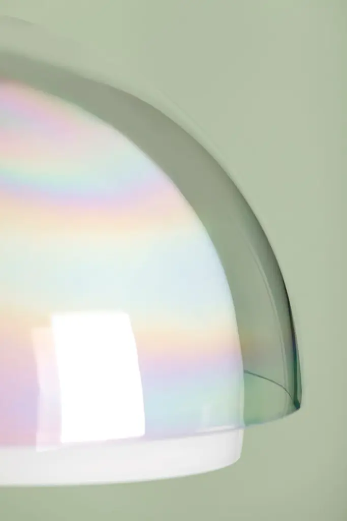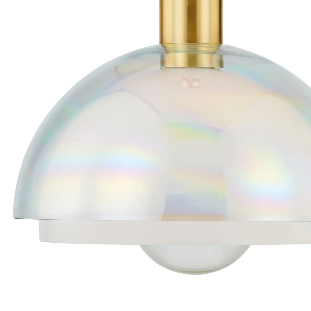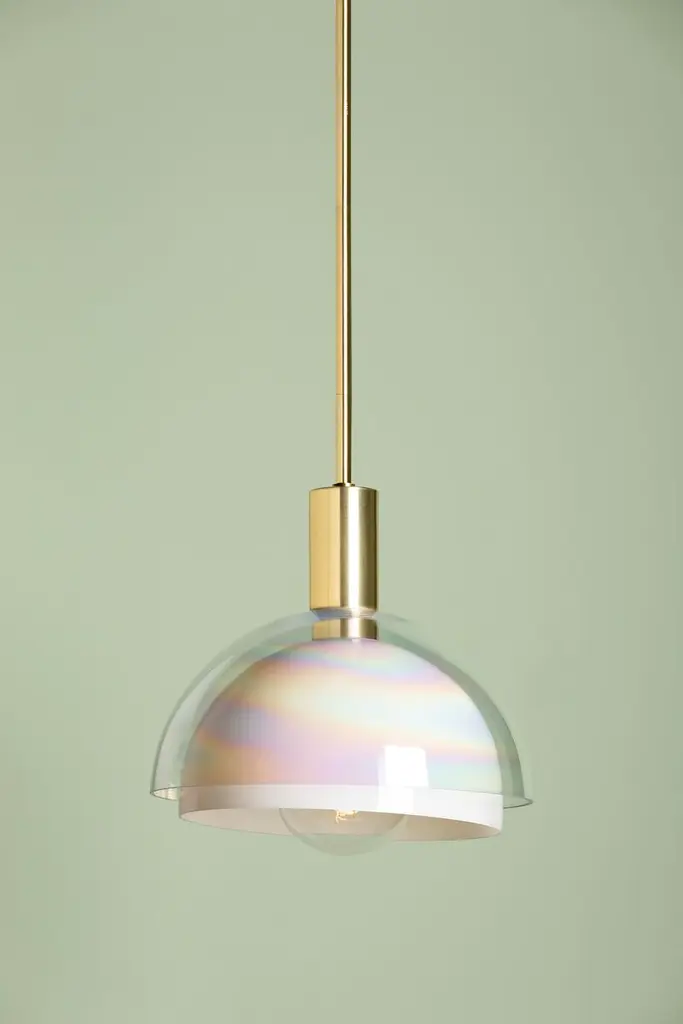 Playing with the layering of glass, Baylor features two spherical shades that encircle the light source, creating a bubble-like halo. An opal interior shade is paired with an iridescent exterior shade, creating an ethereal interplay of light and shapes. The metalwork adds to the luxurious feel of the fixture as it reflects the light.
