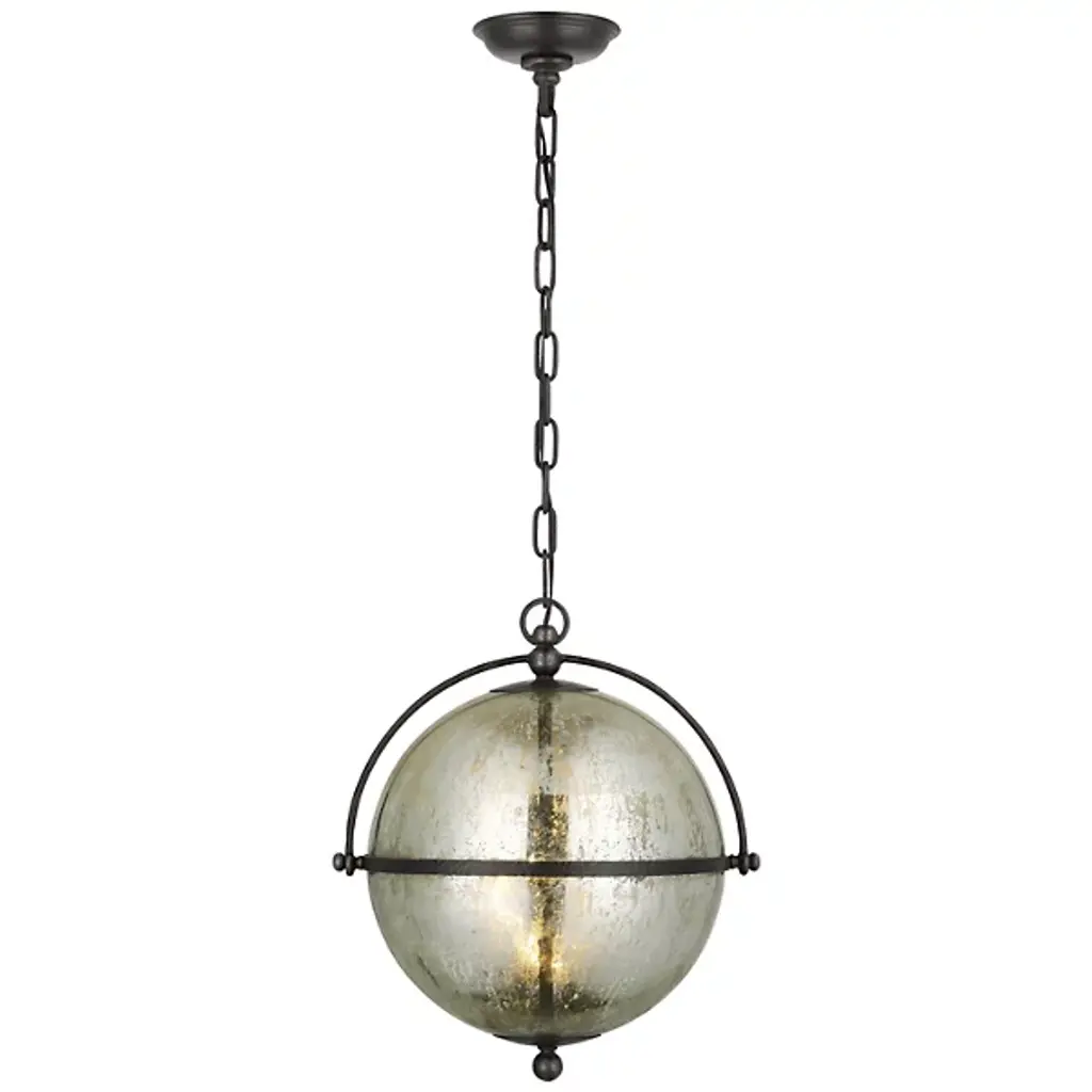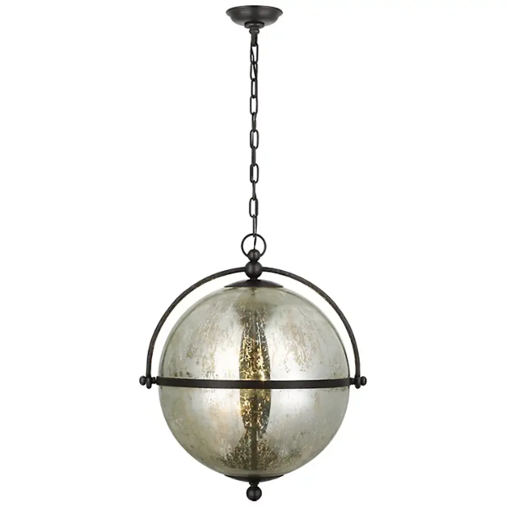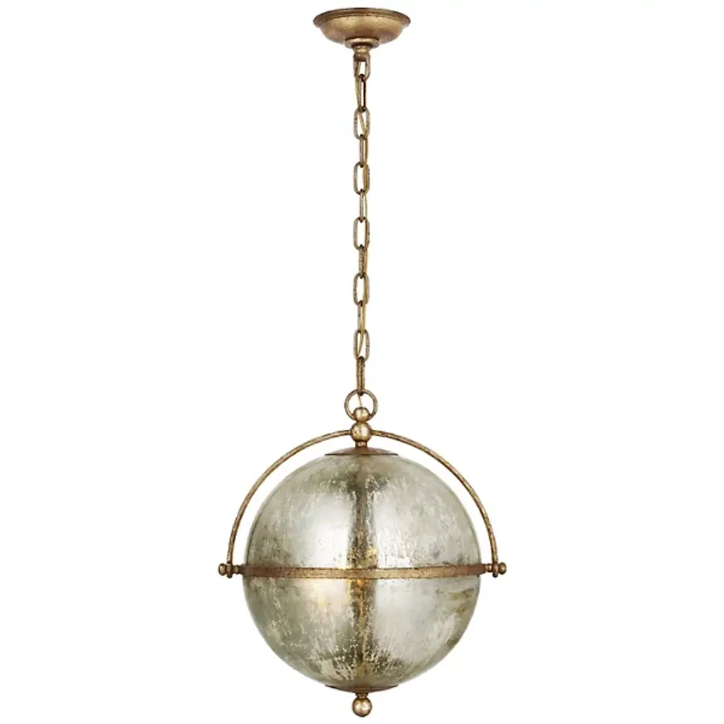 Add a stylish, elegant appeal to inside spaces with the Bayridge Pendant from Visual Comfort Signature, formerly known as Visual Comfort. An airy steel construction descending from a shallow dome shade, it extends a medium-weight chain down to a single candelabra lamp inside a spherical shade of Antiqued Mercury Glass with a slim, equatorial ring that sweeps around it. The translucent glass gentles glare to the sides into a soft glow, adding a vintage warmth to its surroundings.
