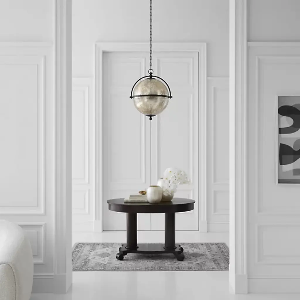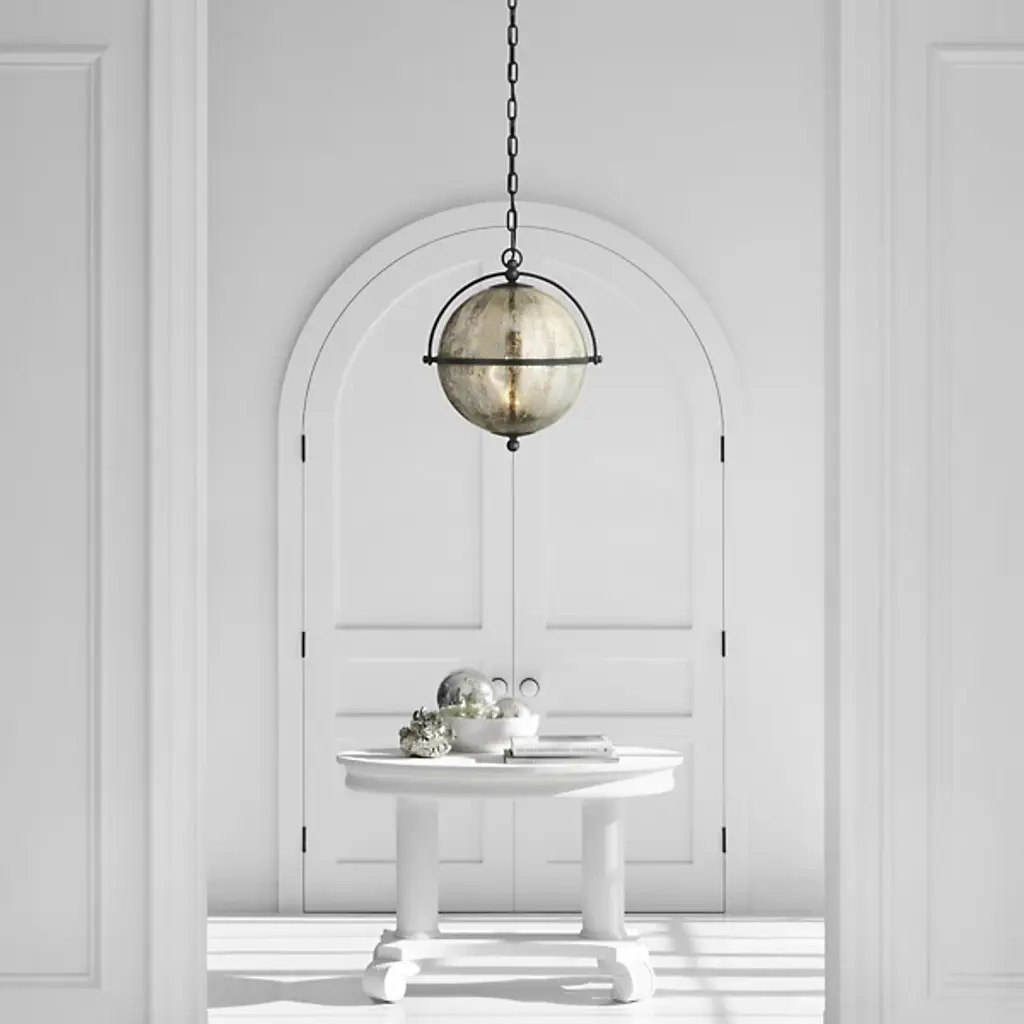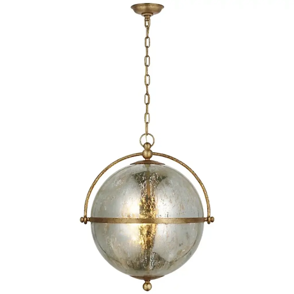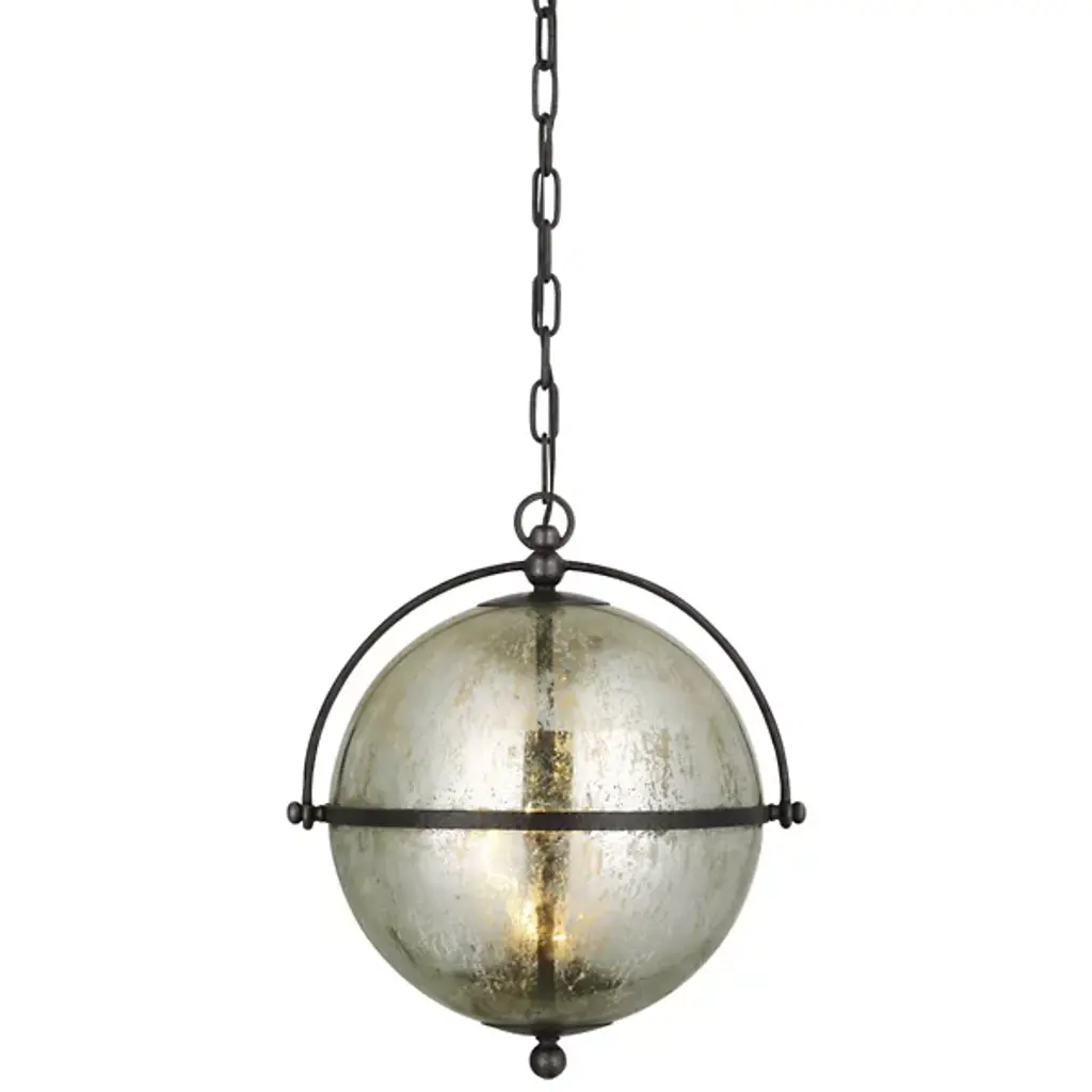 Add a stylish, elegant appeal to inside spaces with the Bayridge Pendant from Visual Comfort Signature, formerly known as Visual Comfort. An airy steel construction descending from a shallow dome shade, it extends a medium-weight chain down to a single candelabra lamp inside a spherical shade of Antiqued Mercury Glass with a slim, equatorial ring that sweeps around it. The translucent glass gentles glare to the sides into a soft glow, adding a vintage warmth to its surroundings.