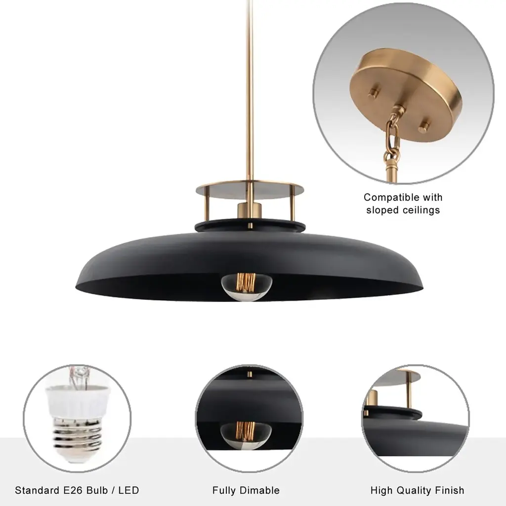 This 20-inch gold and black pendant light combines a gold metal frame with a black shade, suspended from an adjustable rod. It can be mounted on sloped ceiling. Its versatile size suits dining areas, kitchen islands, or bedrooms, offering a sleek contemporary accent that complements modern, transitional, or traditional decor styles.【Sleek Dual-Tone Design】 : Features a gold-colored metal frame paired with a black metal shade, creating a modern and sophisticated aesthetic.【Adjustable Height】 : Suspended from a ceiling rod with customizable height settings to suit any room layout or preference.【Versatile 20-Inch Size】 : Ideal for spaces like dining rooms, kitchen islands, or bedrooms, offering balanced illumination without overwhelming the area.【Stylish Decor Compatibility】 : The gold-and-black color scheme effortlessly complements contemporary, transitional, or traditional interior styles.【Functional Elegance】 : Combines practical lighting with chic design, adding glamour and sophistication to living spaces.