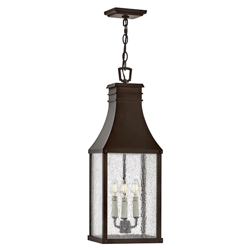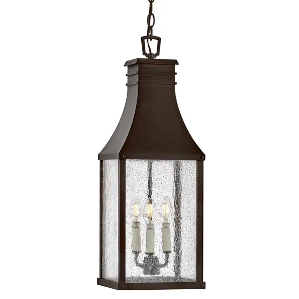Handsomely finished and classically composed. The Beacon Hill Outdoor Pendant is a piece of light furnishing from Hinkley Lighting. It’s made of aluminum in a choice finish and clear seedy glass that allows the illumination from the candelabras within to flow through. Suitable for any weather condition, the Beacon is the perfect way to illuminate an outdoor entryway, a garden gazebo, or some other space the heart desires. Regardless of where you decide to place one or many of them, it will transform the space enchantingly.