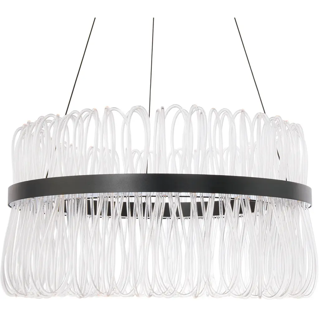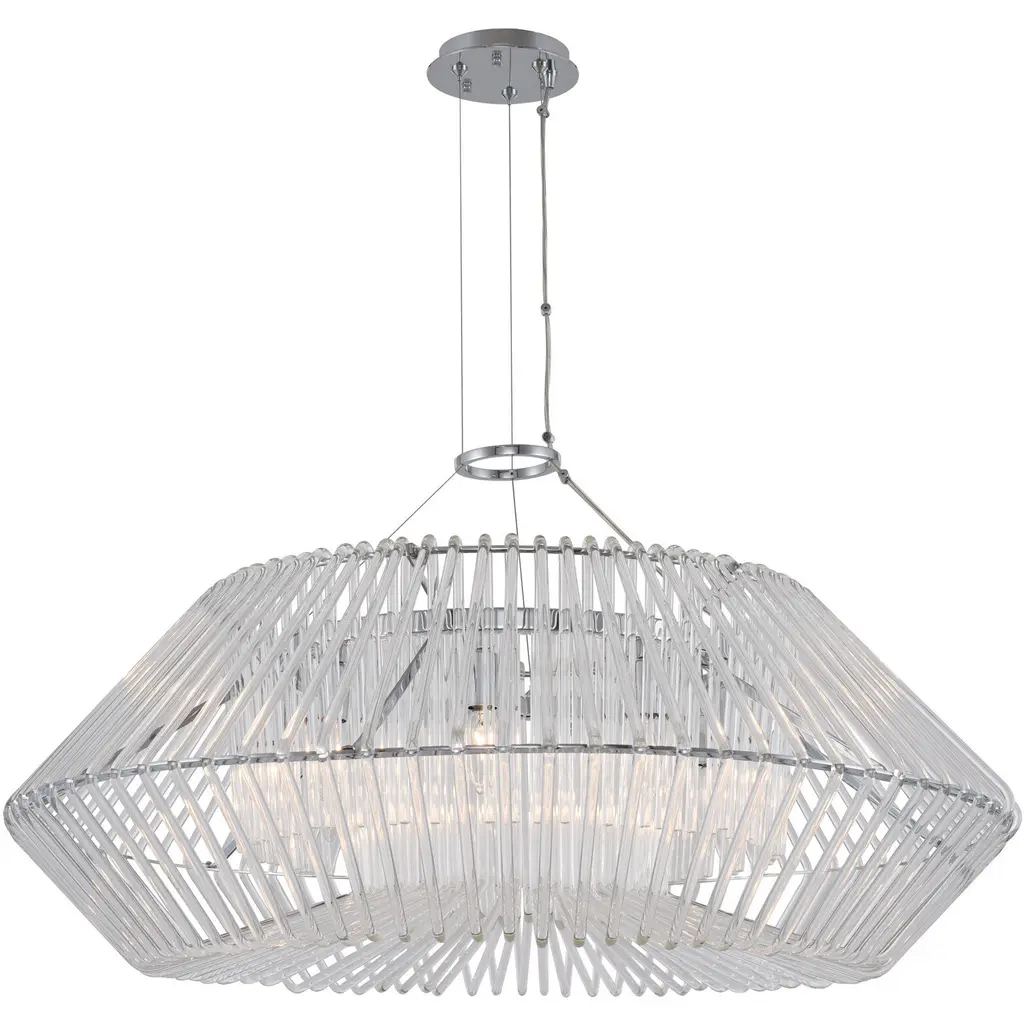 The Beaming Around pendant is a luminous hoop. The round chrome frame is ornamented by single glass rings that alternate in finish from clear to cognac, a subtle detail that blends the two perfectly but still adds a deliberate decorative variation. Ten foot adjustable cables allow for a great range of variability to suit almost any space.