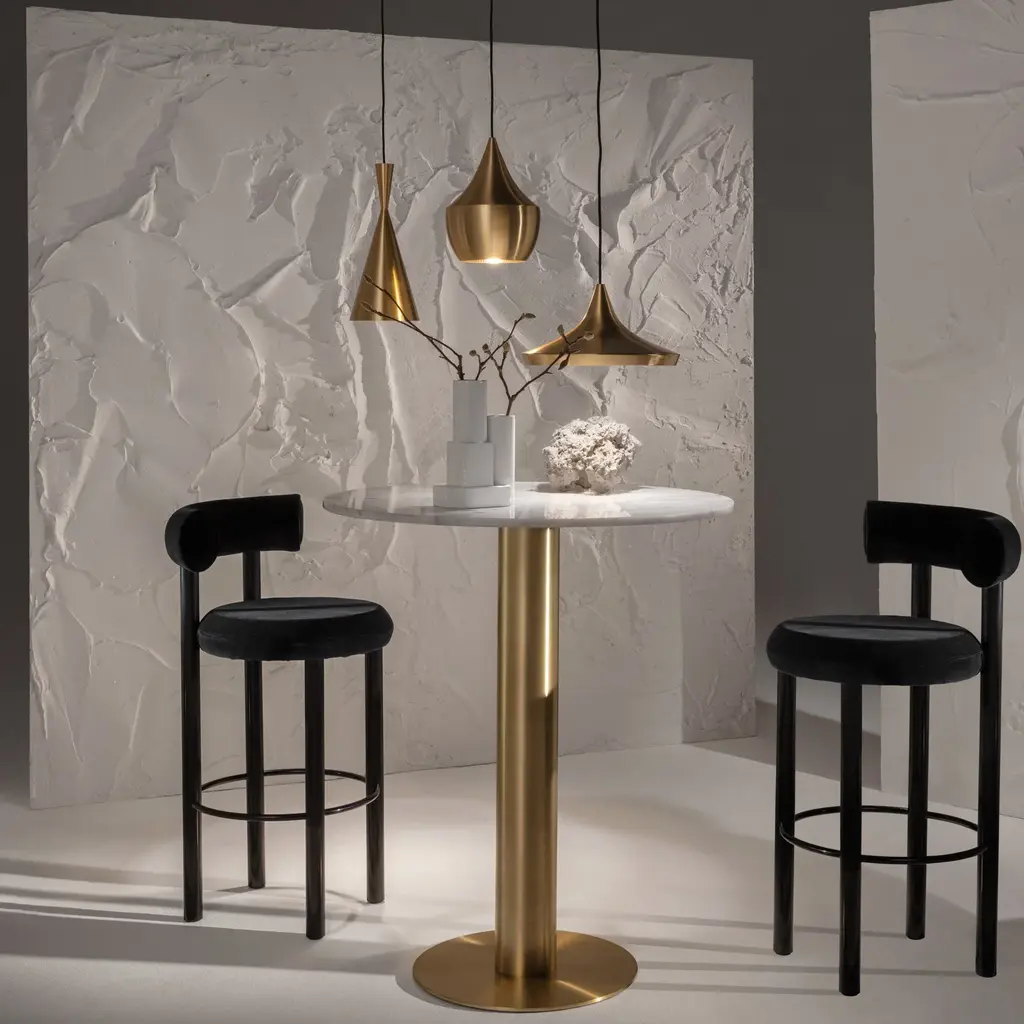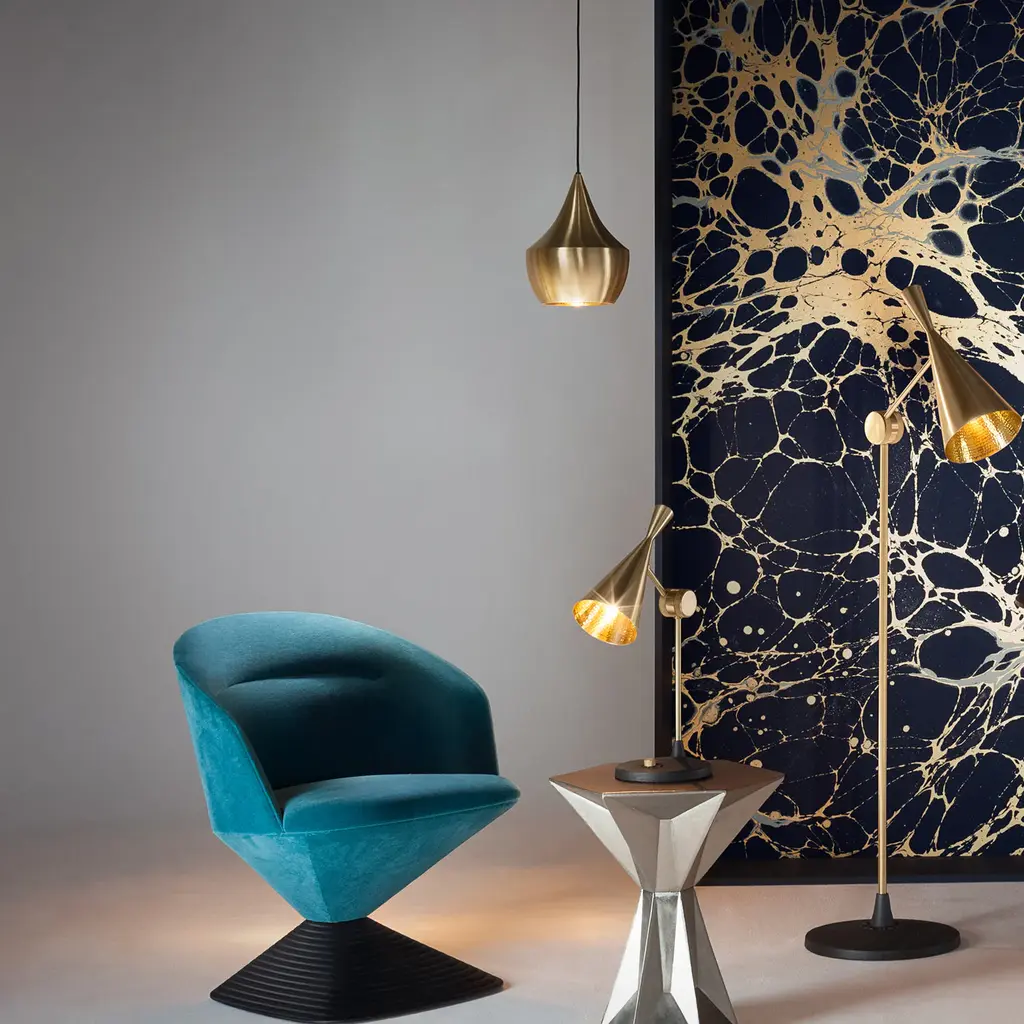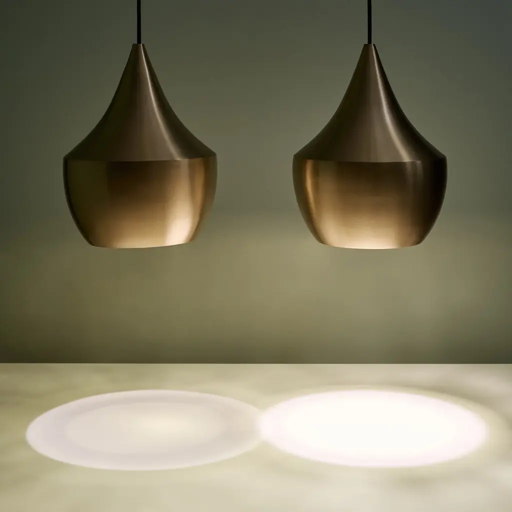 Beat Fat is the filled-out version of British designer Tom Dixon's unique series of pendant lights. Originally conceived during a field trip to India with his Royal College of Art students, the shapes are based on traditional brass cooking pots and water vessels. Using the same time-honored techniques, the lamps are spun and hand-beaten by skilled craftsmen from Moradabad in Northern India. But the technology is pure 21st Century, utilizing an LED light source. The firm Tom Dixon, established in 2002 by the renowned designer and his partner David Begg, encompasses everything from chairs to fragrance as well as a deep dive into lighting. Tom has been recognized with OBE honors and his work sits in museums across the globe including London's Victoria and Albert, New York's Museum of Modern Art and Paris' Centre Georges Pompidou.