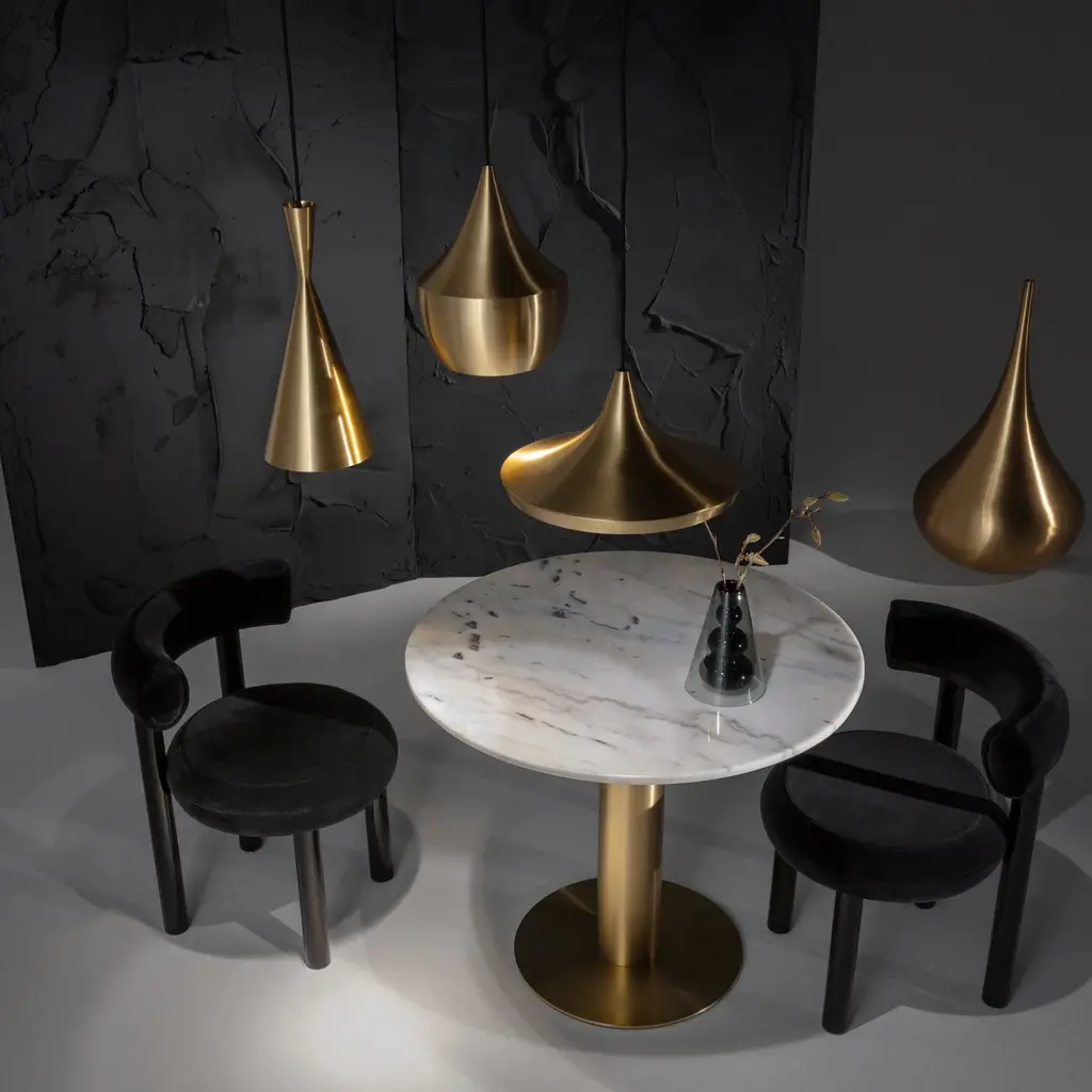 Beat Fat is the filled-out version of British designer Tom Dixon's unique series of pendant lights. Originally conceived during a field trip to India with his Royal College of Art students, the shapes are based on traditional brass cooking pots and water vessels. Using the same time-honored techniques, the lamps are spun and hand-beaten by skilled craftsmen from Moradabad in Northern India. But the technology is pure 21st Century, utilizing an LED light source. The firm Tom Dixon, established in 2002 by the renowned designer and his partner David Begg, encompasses everything from chairs to fragrance as well as a deep dive into lighting. Tom has been recognized with OBE honors and his work sits in museums across the globe including London's Victoria and Albert, New York's Museum of Modern Art and Paris' Centre Georges Pompidou.