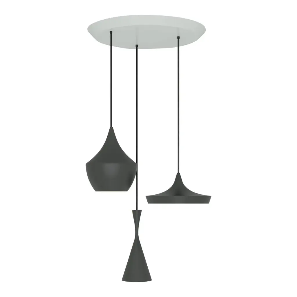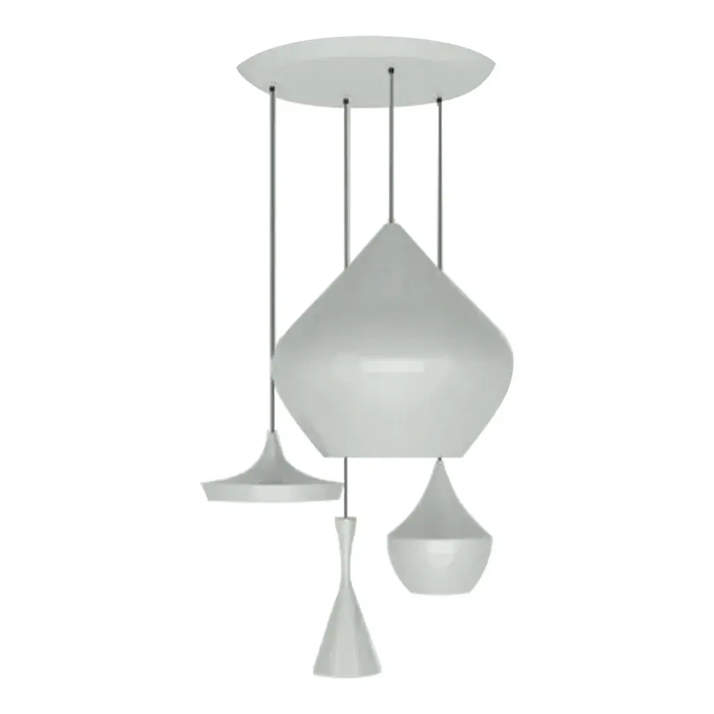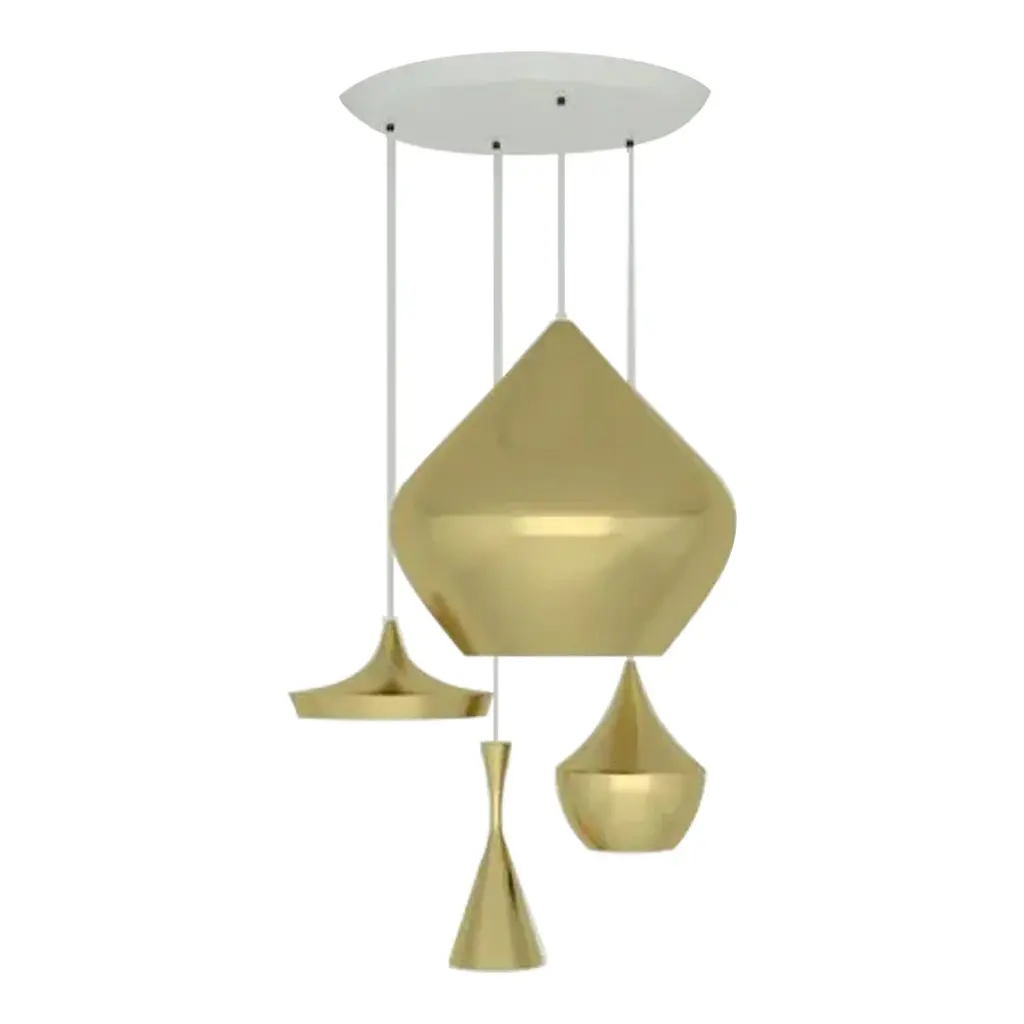 Beat is an extraordinary round chandelier featuring four individual Beat Stout, Beat Tall, Beat Fat and Beat Wide ceiling lights in a matte black, brushed brass, or glossy white finish which contrasts with the warm, golden interior. Each Beat light is made from hand spun brass sculpted by artisan craftsmen in Northern India. The creation of the Beat light is part of an ancient process that takes four days to complete and its beaten interior is re-purposed to refract and reflect a soft and warm luminosity.