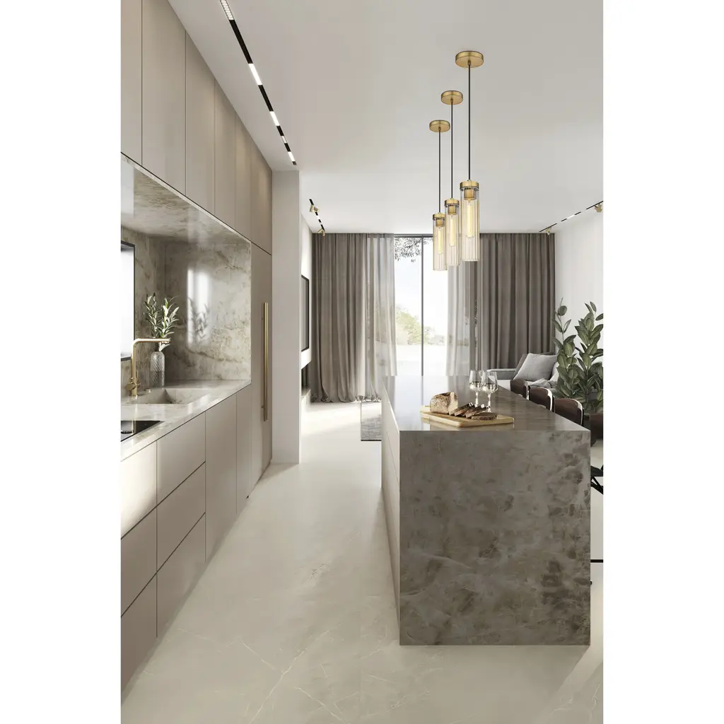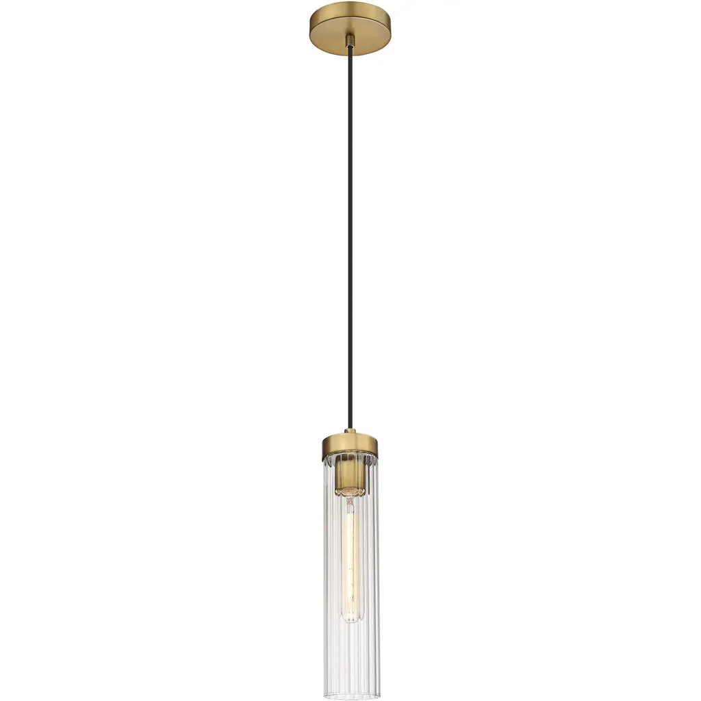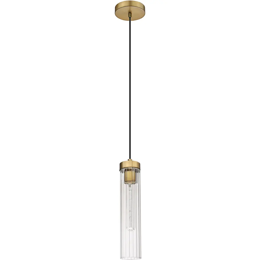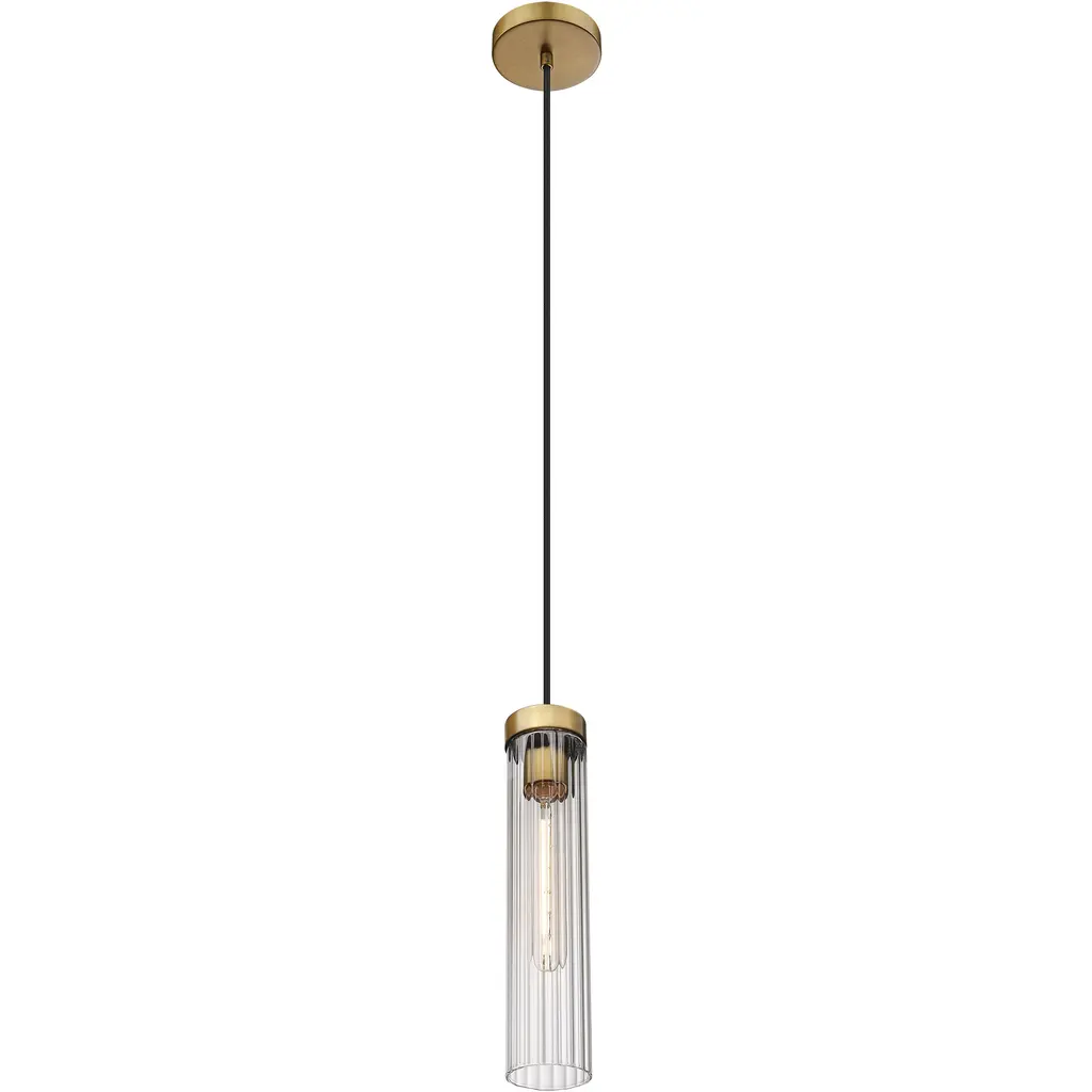 Slim, fluted glass create soft light diffusion for a Beau collection one-light pendant. Modern with a timeless sensibility, the pendant shows off a clean, precise silhouette complete with a black cloth suspension and rubbed brass hardware and ceiling plate for a warm finishing touch.