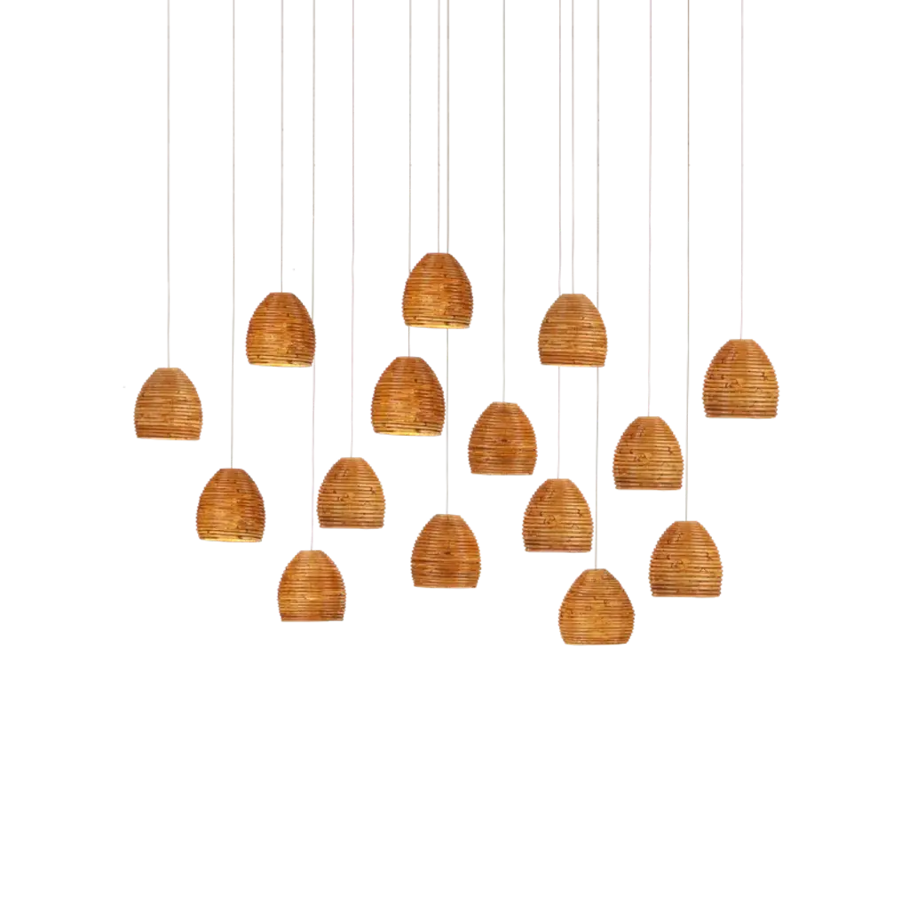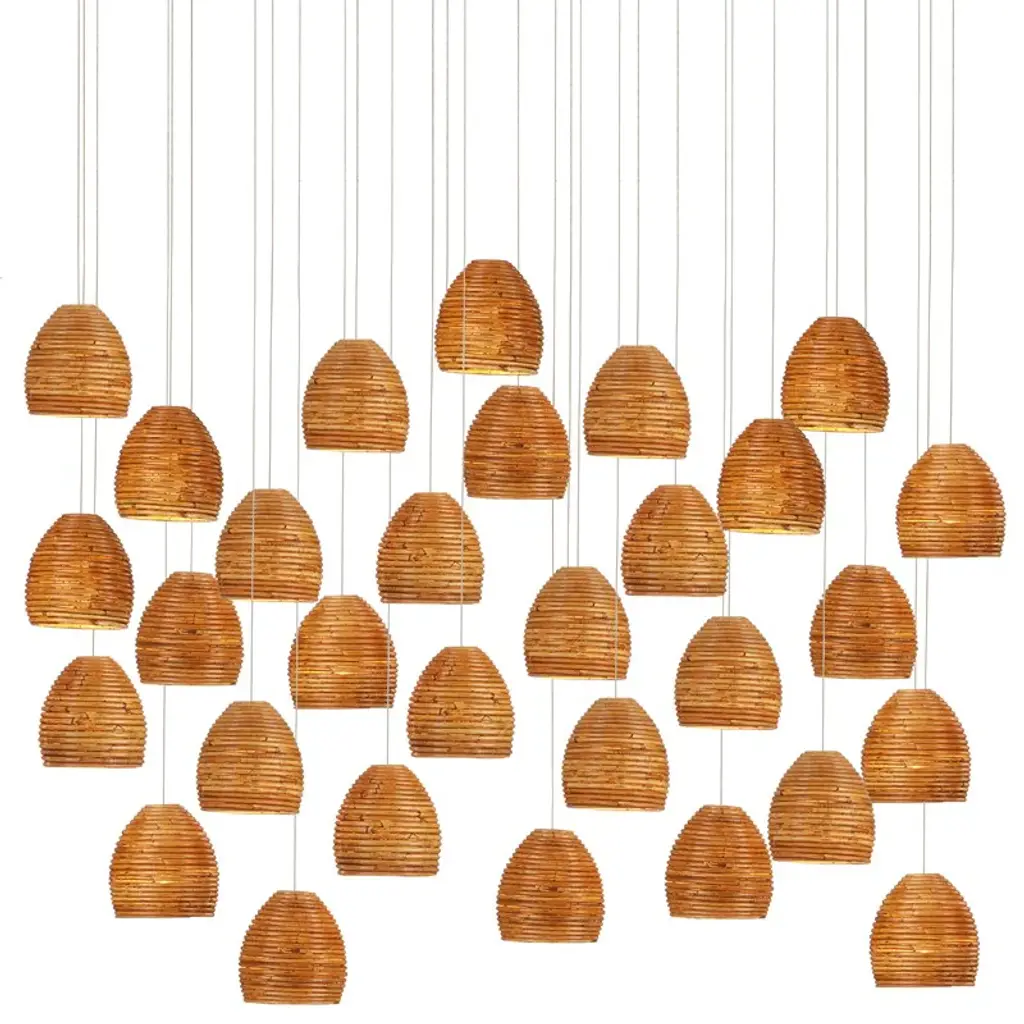 The Beehive Rectangular 15-Light Multi-Drop Pendant has rattan bell-shaped shades. Because the natural material is not perfectly uniform, there are fissures in the shades that allow illumination to escape to create a warm glow. The canopies of the rattan pendants in this collection are luminous in a painted silver finish. This fixture is among Currey & Company’s introduction of cluster lights, which includes from 1-light up to 36-light configurations.