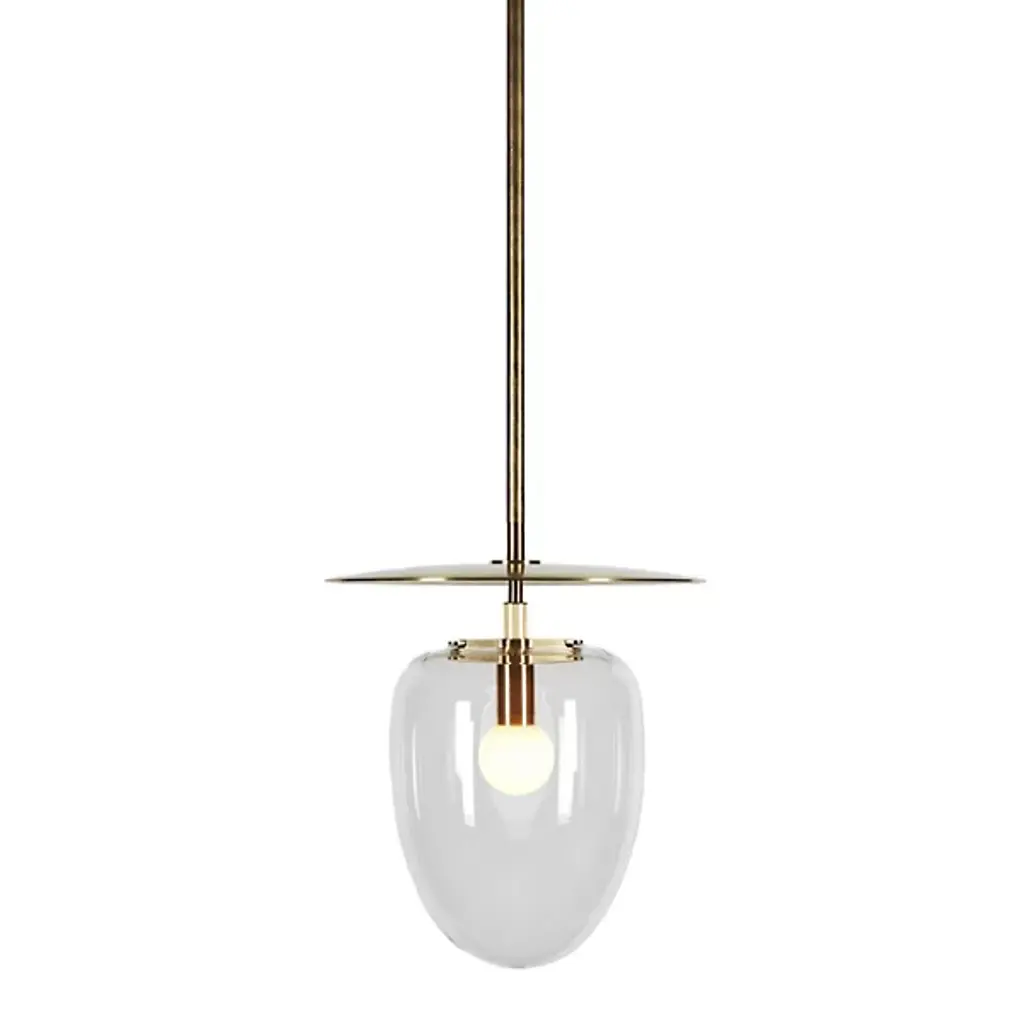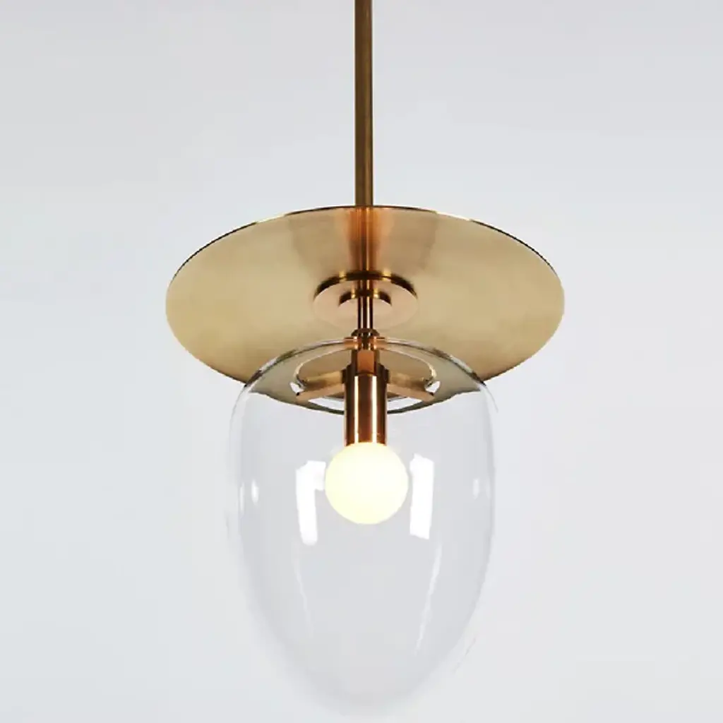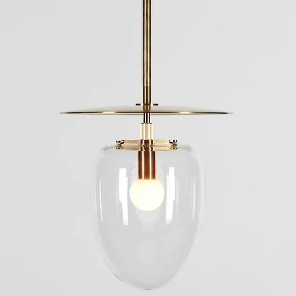 The Bell LED Pendant from Roll & Hill provides a stately, retro-modern character to its surroundings. A fabulous fusion of brass and clear glass, it is designed by Post Company to call back to rustic lantern designs and descends from a strong circular canopy, transmitting a slim stem below, to a strong LED lamping set inside a rounded, clear glass shade. The slim dish-shaped accent above the lamping transmits bright light below, while the clear glass moderates bright glare into an even warmth, accompanied by a halo of radiant light.
