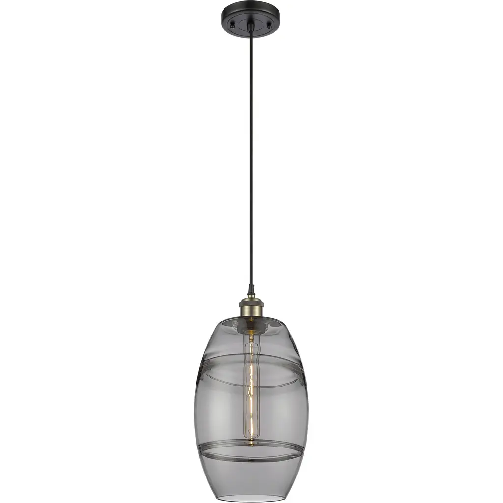 Alluring, sensual curves offer a graceful aesthetic that illuminates a transitional space with romantic charm. This one-light pendant creates an enticing silhouette with an oversized glass shade and a lush Olde Brass finish holder suspended from a black braided cord to a metal mounting bracket showing off a dramatic Matte Black finish.