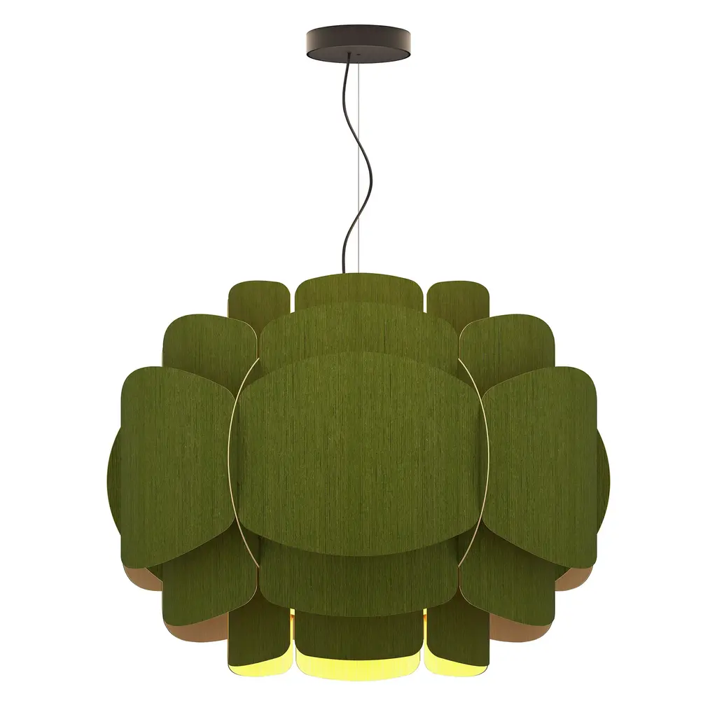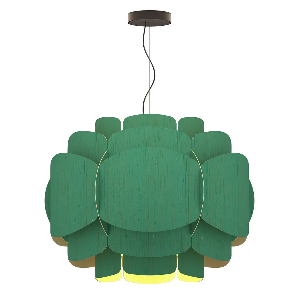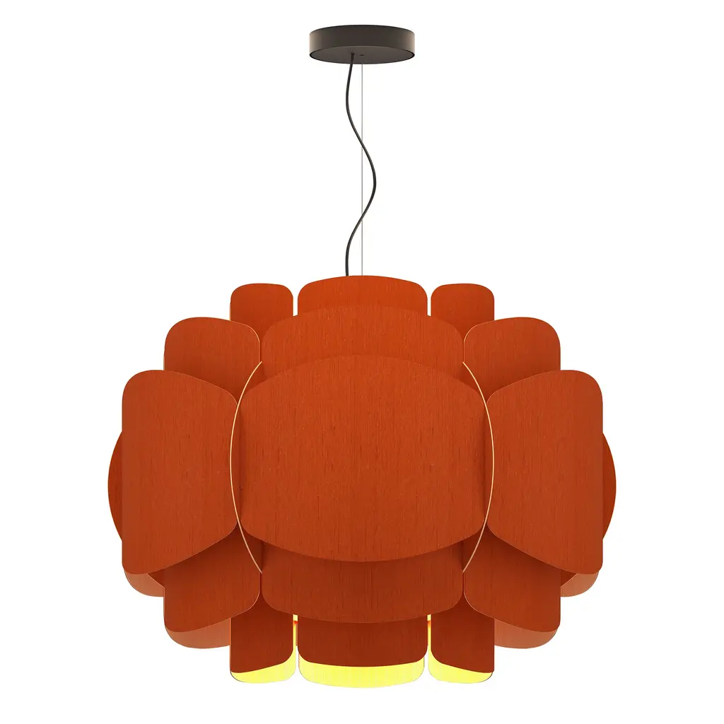 The Bella Pendant Light from Bruck Lighting exhibits a sustainable wood shade to add a natural aesthetic to your space. Colorful swirls of thin wood veneer create a visual statement highlighted by the warm glow of ambient light. The authentic wood grain is unique to each piece and every fixture’s character is nothing short of livable art. Station above a kitchen countertop or dining room table for a sculptural accent that is equal parts grounding and effervescent. Highlights