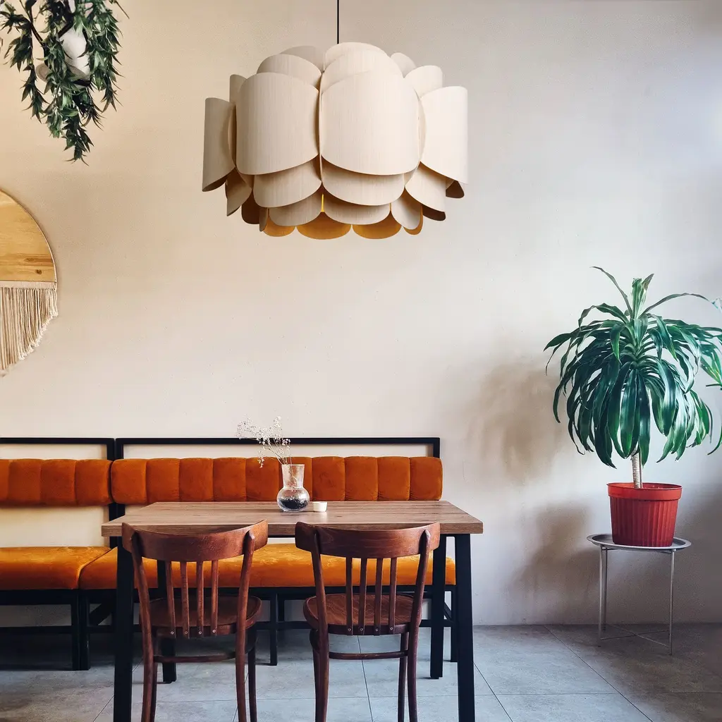 The Bella Pendant Light from Bruck Lighting exhibits a sustainable wood shade to add a natural aesthetic to your space. Colorful swirls of thin wood veneer create a visual statement highlighted by the warm glow of ambient light. The authentic wood grain is unique to each piece and every fixture’s character is nothing short of livable art. Station above a kitchen countertop or dining room table for a sculptural accent that is equal parts grounding and effervescent. Highlights