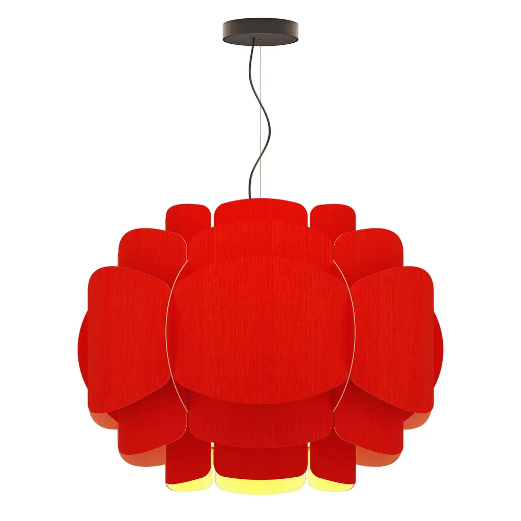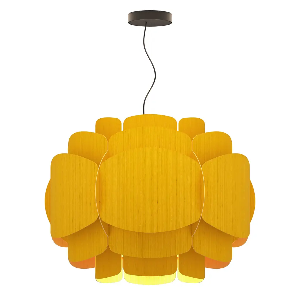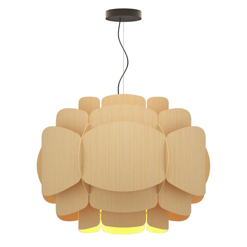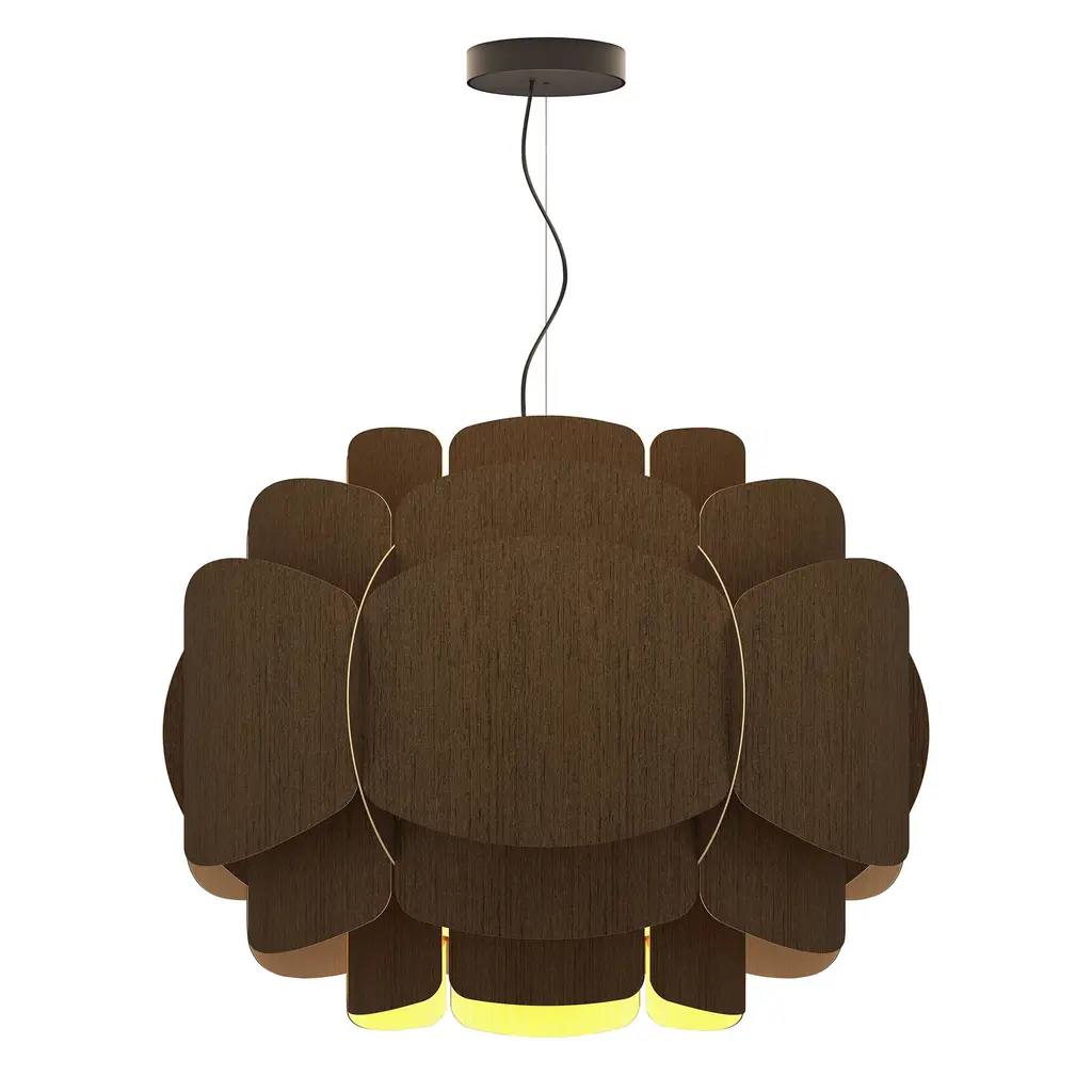 The Bella Pendant Light from Bruck Lighting exhibits a sustainable wood shade to add a natural aesthetic to your space. Colorful swirls of thin wood veneer create a visual statement highlighted by the warm glow of ambient light. The authentic wood grain is unique to each piece and every fixture’s character is nothing short of livable art. Station above a kitchen countertop or dining room table for a sculptural accent that is equal parts grounding and effervescent. Highlights