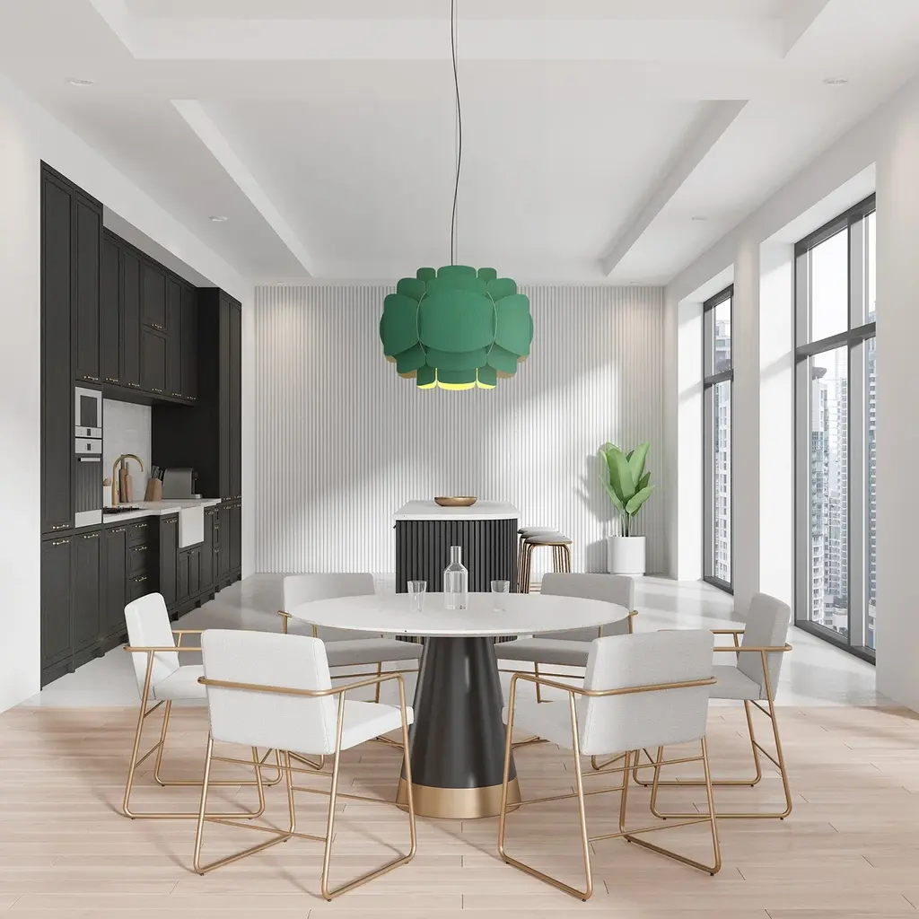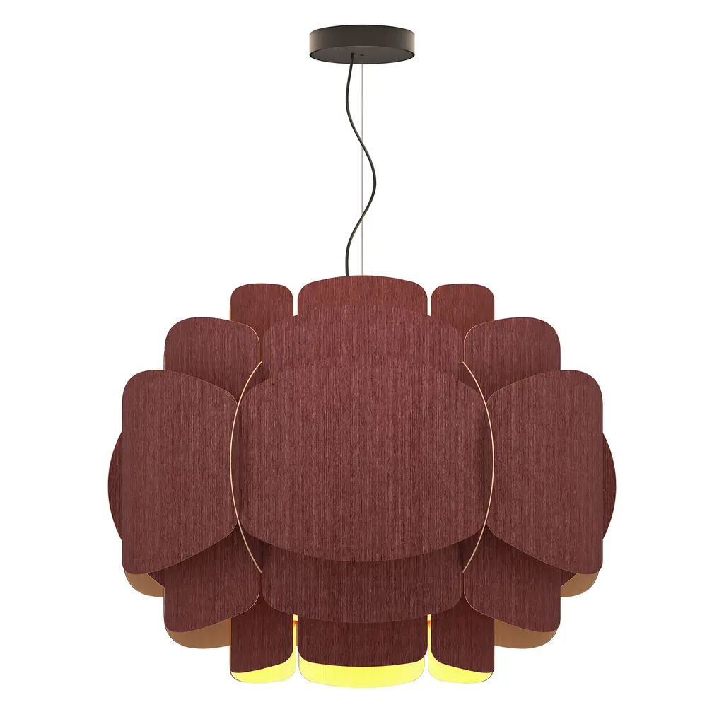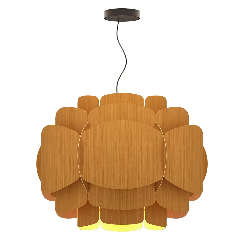 The Bella Pendant Light from Bruck Lighting exhibits a sustainable wood shade to add a natural aesthetic to your space. Colorful swirls of thin wood veneer create a visual statement highlighted by the warm glow of ambient light. The authentic wood grain is unique to each piece and every fixture’s character is nothing short of livable art. Station above a kitchen countertop or dining room table for a sculptural accent that is equal parts grounding and effervescent. Highlights