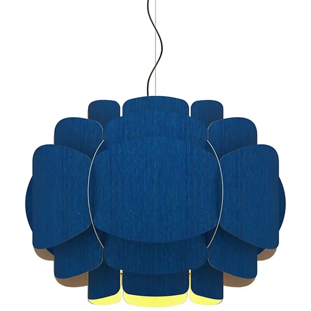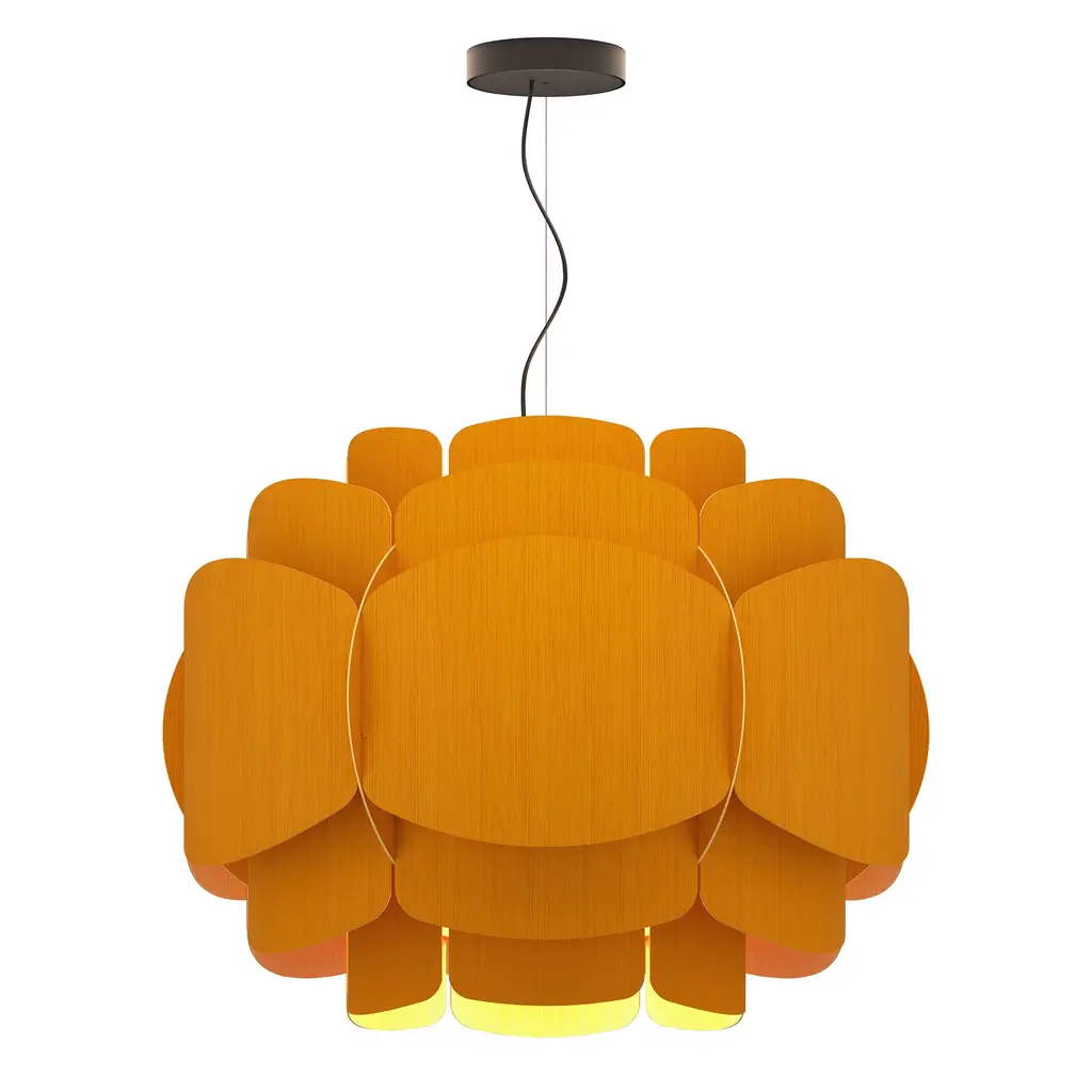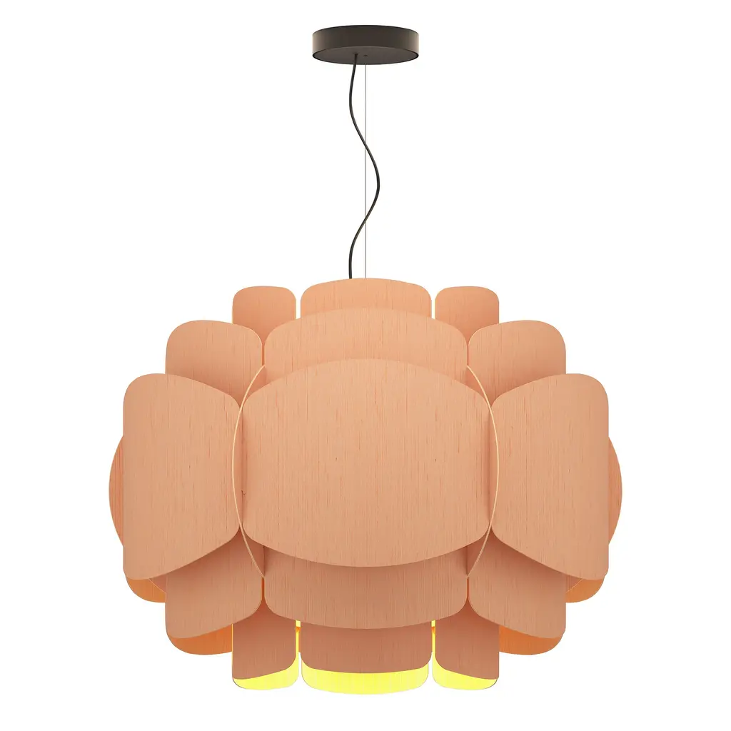 The Bella Pendant Light from Bruck Lighting exhibits a sustainable wood shade to add a natural aesthetic to your space. Colorful swirls of thin wood veneer create a visual statement highlighted by the warm glow of ambient light. The authentic wood grain is unique to each piece and every fixture’s character is nothing short of livable art. Station above a kitchen countertop or dining room table for a sculptural accent that is equal parts grounding and effervescent. Highlights