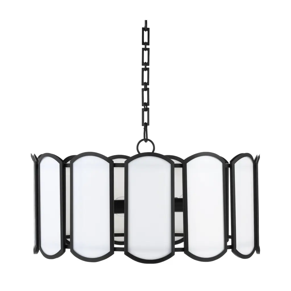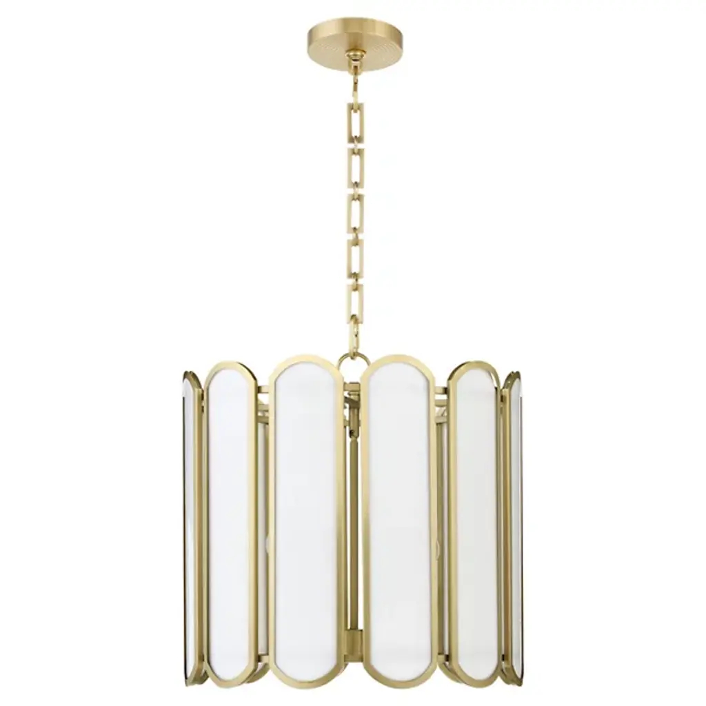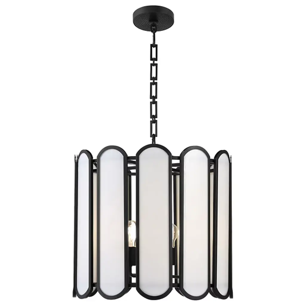 The Belleview Pendant from Quorum International reimagines Tiffany-style lighting for modern homes. Rectangular glass panels with curved ends arranged in a drum formation create fascinating light patterns across nearby surfaces. Designer Tamara Day adds her distinctive touch through a signature chain design and clover finial. Multiple light sources within extend outward from the central rod, providing both task and ambient illumination. This dimmable piece works brilliantly over dining tables or in two-story foyers where its intricate details can be fully cherished.