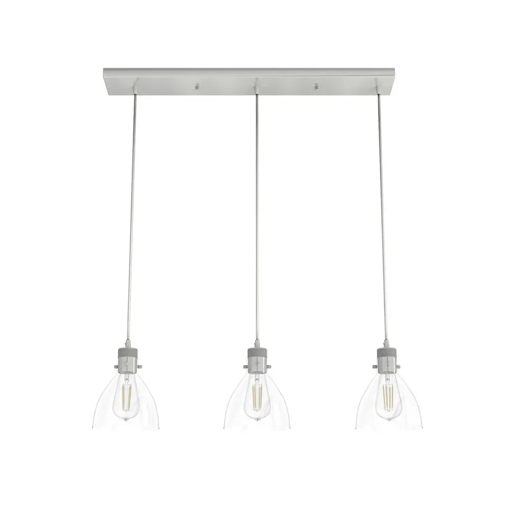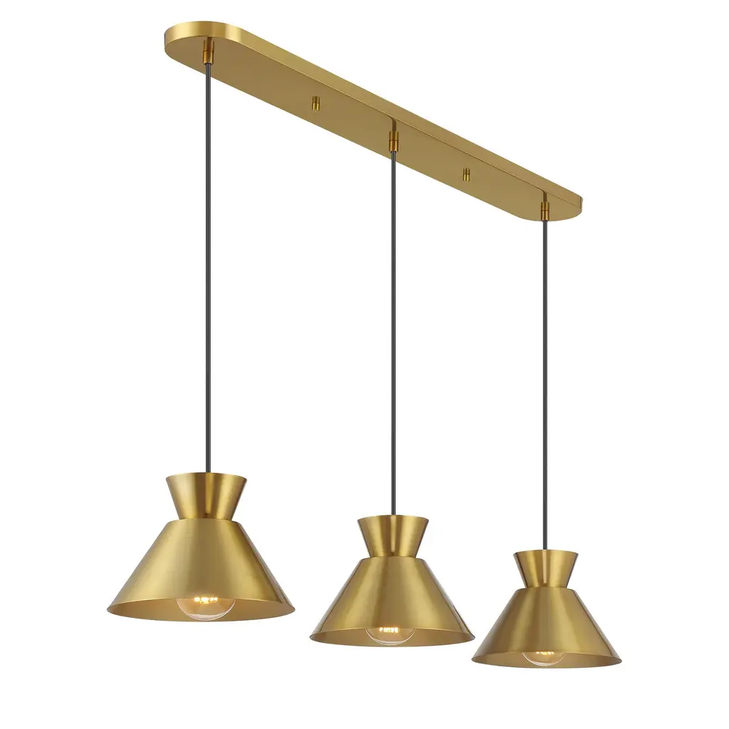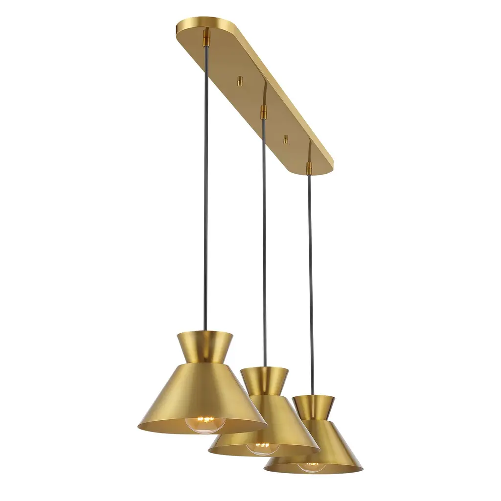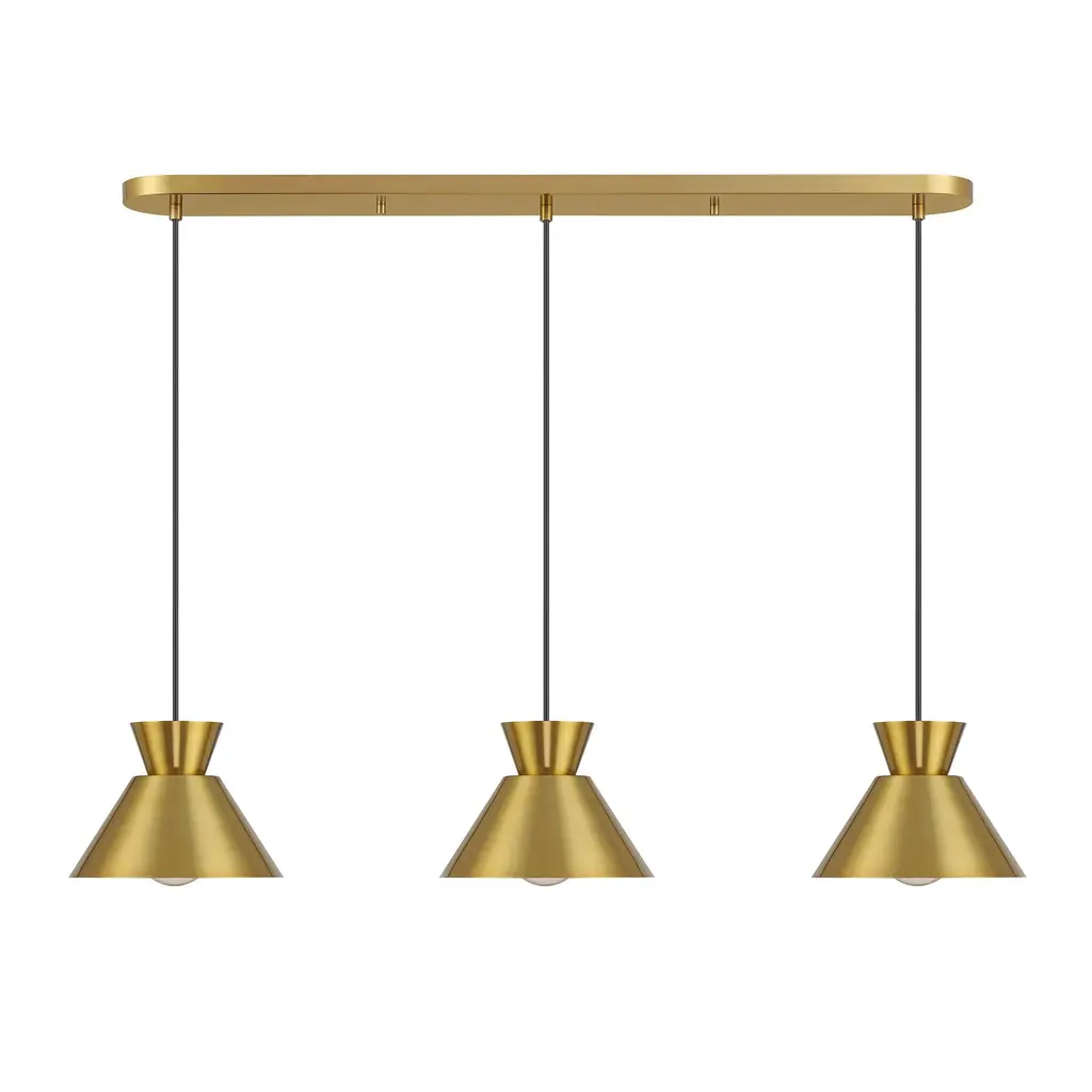 Get iconic mid-century modern style with this 3-light linear pendant, which has chic conical solid metal shades. The sleek black hanging cords let you adjust the hanging height of each light to meet the needs of your space. The height ranges from 6" to 60". The length is 40" and the width is 9". Uses 3 standard size bulbs of up to 60 watts per bulb.Features:Dimensions:Electrical Specifications: