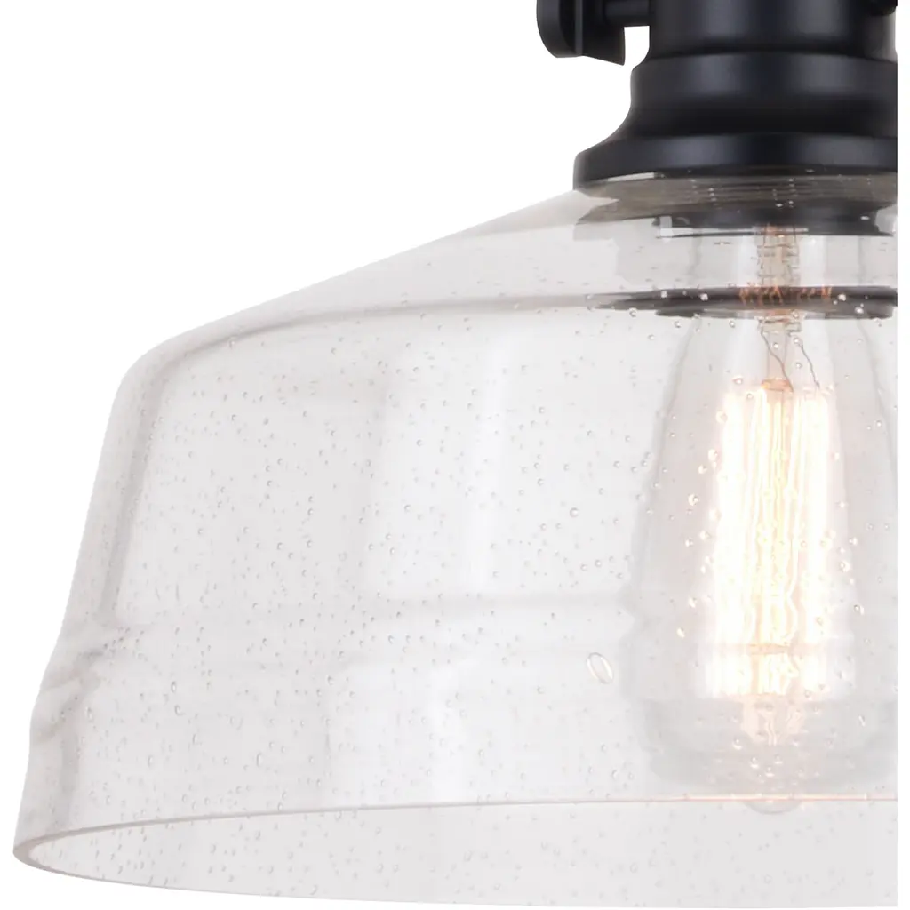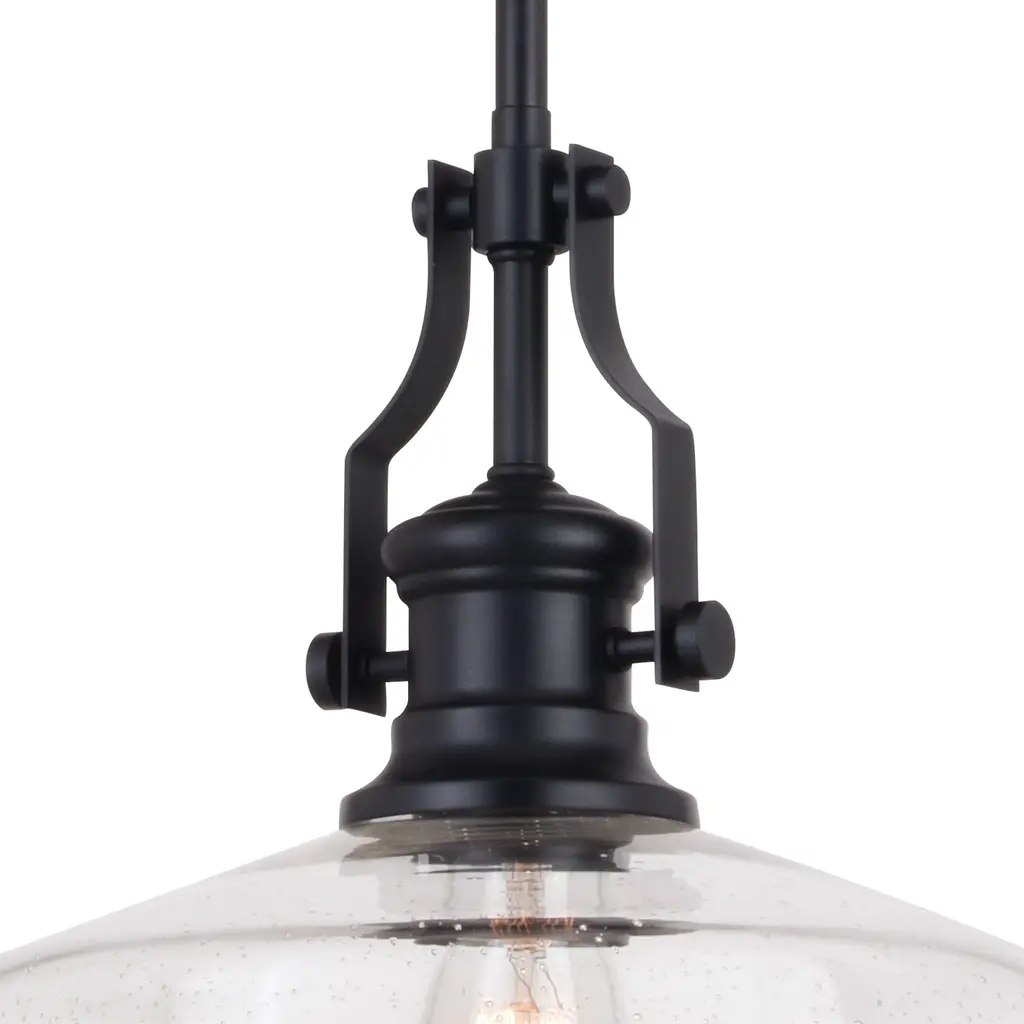 The Beloit pendant adds a welcoming and inviting feel to your kitchen or living spaces. Soft curving lines finished in matte black paired with a large clear seeded glass shade create a look that accents the most comfortable spaces. Combine that with a vintage Edison style filament bulb to complete the look. Bring a level of sophistication to your trendy farmhouse or urban style with this pendant.
