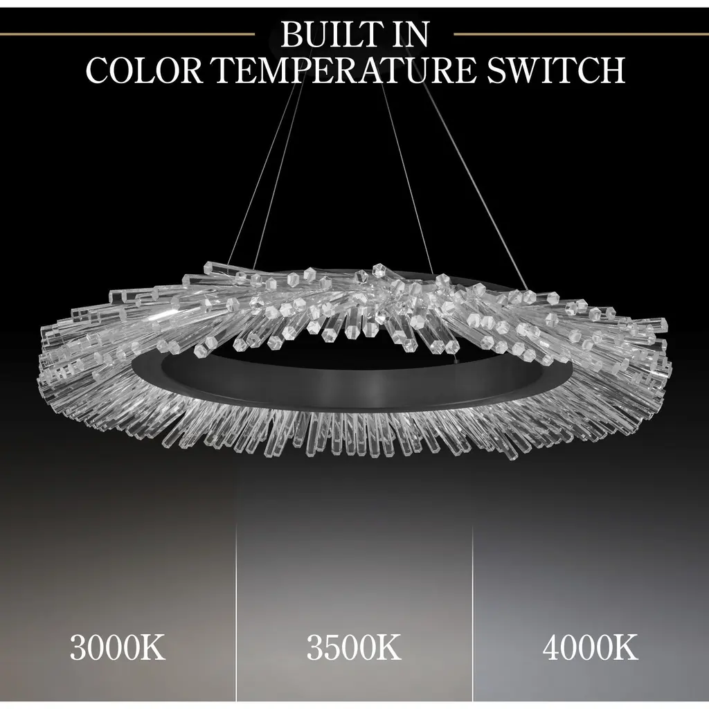 Benediction is a subtle statement of calming elegance. A ring adorned with sprays of crystals reminiscent of stalactites in a cavern are illuminated generously from within with hidden LEDs. Unique and inspiring. Schonbek Beyond LED luminaires feature a 3-CCT color temperature selectable switch that can be accessed at the time of installation to toggle between 3000K-3500K-4000K color temperatures. Ultra-sleek electrified cables eliminate the need for clunky power wires and the height is simple to adjust through push pin connectors on the canopy up to 10ft of length.
