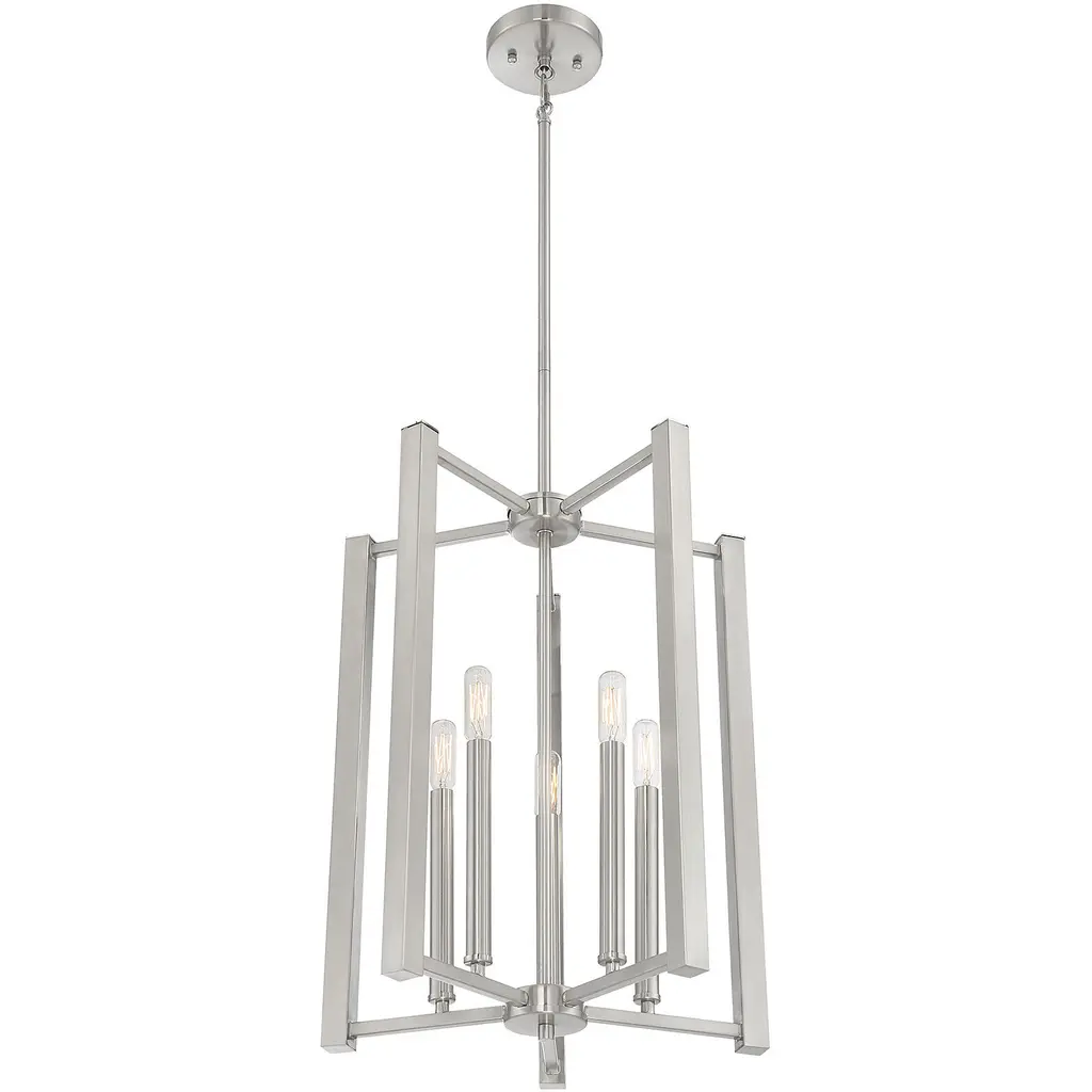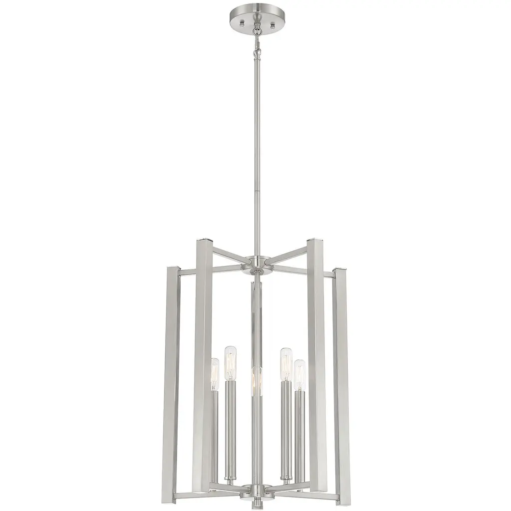 A simple cage with modern flair defines the Benson collection. This universally flattering five-light pendant in a satin nickel finish is adjustable in height from 26" to 74" and is 15.5" wide. It provides ample illumination from five 60-watt candelabra bulbs.