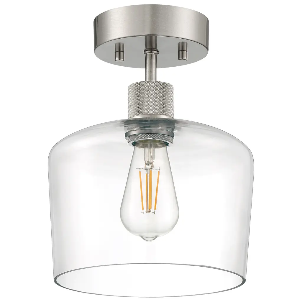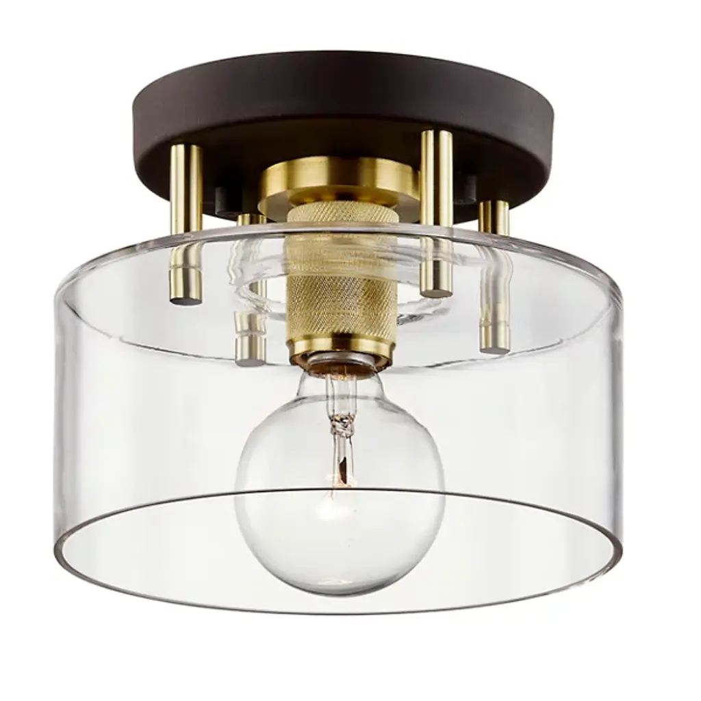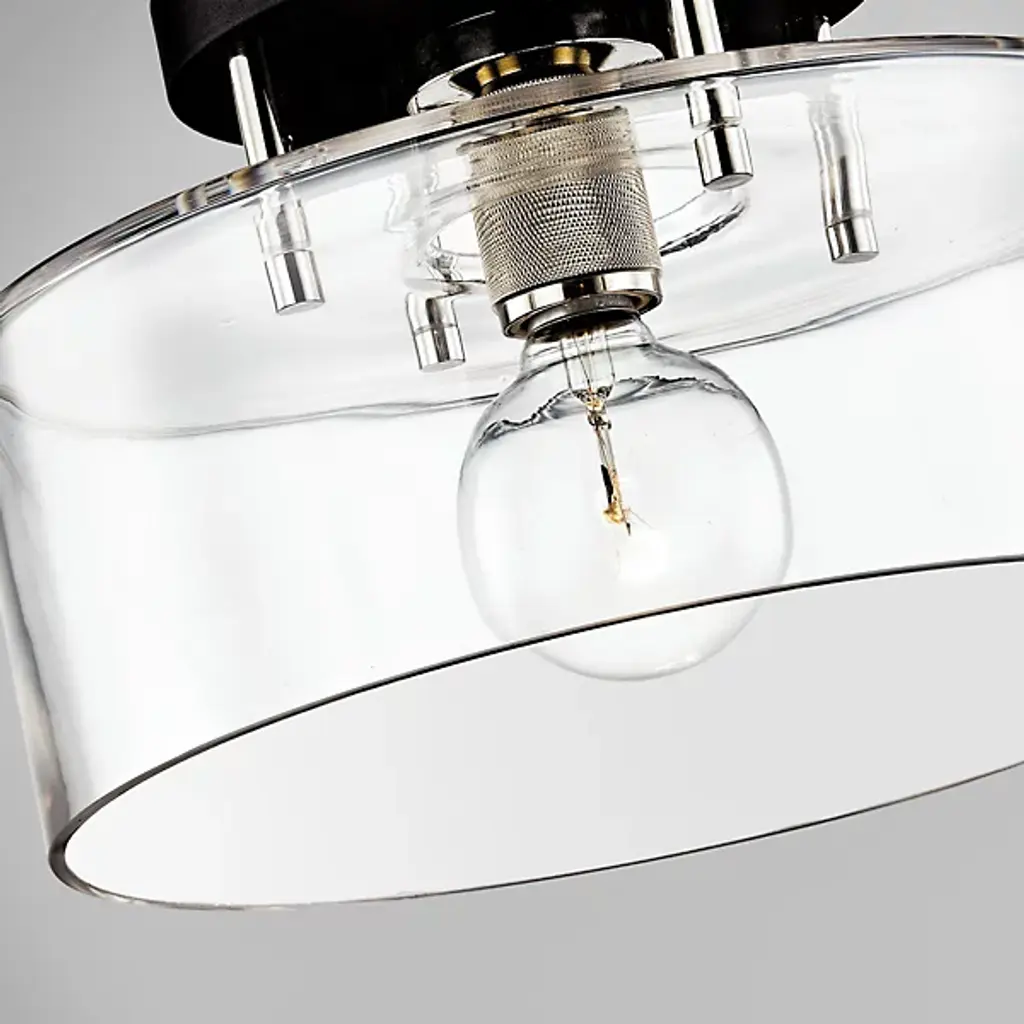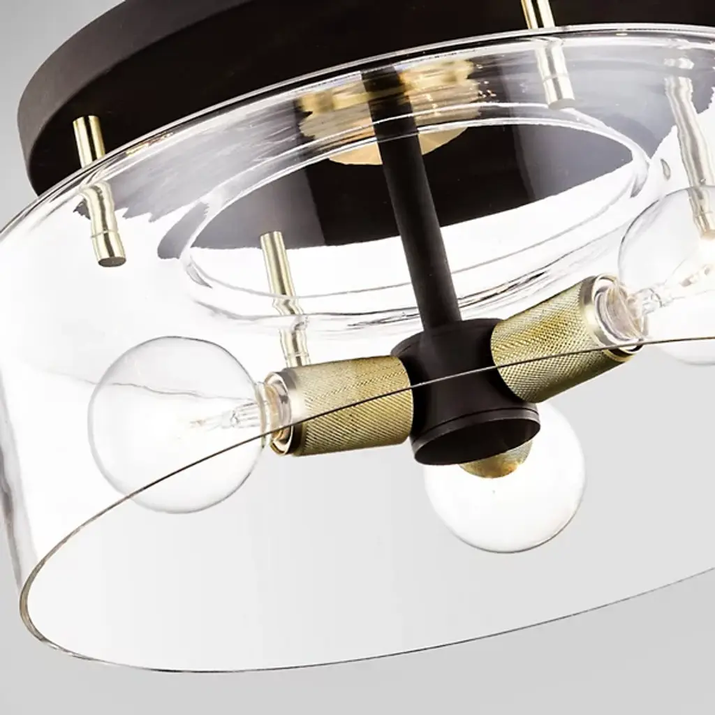 A warm, industrial lighting design for spaces with lower ceilings. The Bergamot Station Semi-Flushmount by Troy Lighting features a Clear Glass drum shade, which makes the overall design feel at once substantial and airy. The main structure is made entirely out of Hand-Worked Iron, with a dual finish to help all of its various components really stand out. The shade hangs just below a darkly finished canopy, and around the central light holder, held securely in place with the help of several shiny pins. The light holder is also finished in the shinier finish, which really helps to accentuate its unusual, industrial micro-texture.