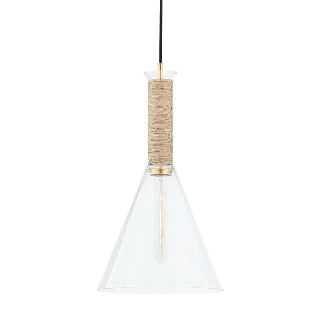 Clean lines and a clear appearance. The Besa Cone Pendant from Mitzi – Hudson Valley Lighting showcases a classic cone shape for a straightforward look that can complement a wide variety of settings, regardless of the established motif. The elongated neck of the piece is wrapped in raffia, which is made out of black cloth to provide little bits of natural design. The conical shade itself is made of clear glass to let a brilliant light shine through.